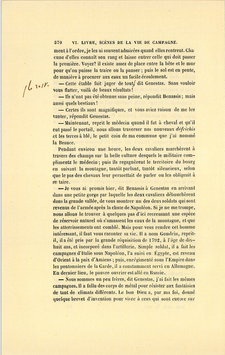 Cet officier, à qui sa prudence acquise ne laissait faire aucune démarche inutile, venait de quitter Grenoble et se dirigeait vers la Grande-Chartreuse, après avoir obtenu la veille de son colonel un congé de huit jours. Il ne comptait pas faire une longue traite ; mais, trompé de lieue en lieue par les dires mensongers des paysans qu’il interrogeait, il crut prudent de ne pas s’engager plus loin sans se réconforter l’estomac. Quoiqu’il eût peu de chances de rencontrer une ménagère en son logis par un temps où chacun s’occupe aux champs, il s’arrêta devant quelques chaumières qui aboutissaient à un espace commun, en décrivant une place carrée {p. 311} assez informe, ouverte à tout venant. Le sol de ce territoire de famille était ferme et bien balayé, mais coupé par des fosses à fumier. Des rosiers, des lierres, de hautes herbes s’élevaient le long des murs lézardés. À l’entrée du carrefour se trouvait un méchant groseillier sur lequel séchaient des guenilles. Le premier habitant que rencontra Genestas fut un pourceau vautré dans un tas de paille, lequel, au bruit des pas du cheval, grogna, leva la tête, et fit enfuir un gros chat noir. Une jeune paysanne, portant sur sa tête un gros paquet d’herbes, se montra tout à coup, suivie à distance par quatre marmots en haillons, mais hardis, tapageurs, aux yeux effrontés, jolis, bruns de teint, de vrais diables qui ressemblaient à des anges. Le soleil pétillait et donnait je ne sais quoi de pur à l’air, aux chaumières, aux fumiers, à la troupe ébouriffée. Le soldat demanda s’il était possible d’avoir une tasse de lait. Pour toute réponse, la fille jeta un cri rauque. Une vieille femme apparut soudain sur le seuil d’une cabane, et la jeune paysanne passa dans une étable, après avoir indiqué par un geste la vieille, vers laquelle Genestas se dirigea, non sans bien tenir son cheval afin de ne pas blesser les enfants qui déjà lui trottaient dans les jambes. Il réitéra sa demande, que la bonne femme se refusa nettement à satisfaire. Elle ne voulait pas, disait-elle, enlever la crème des potées de lait destinées à faire le beurre. L’officier répondit à cette objection en promettant de bien payer le dégât, il attacha son cheval au montant d’une porte, et entra dans la chaumière. Les quatre enfants, qui appartenaient à cette femme, paraissaient avoir tous le même âge, circonstance bizarre qui frappa le commandant. La vieille en avait un cinquième presque pendu à son jupon, et qui, faible, pâle, maladif, réclamait sans doute les plus grands soins ; partant il était le bien-aimé, le Benjamin.