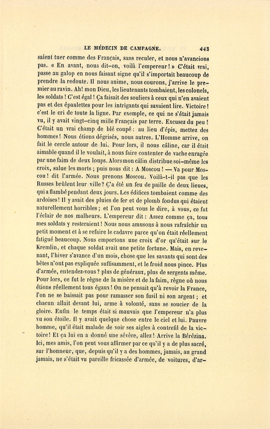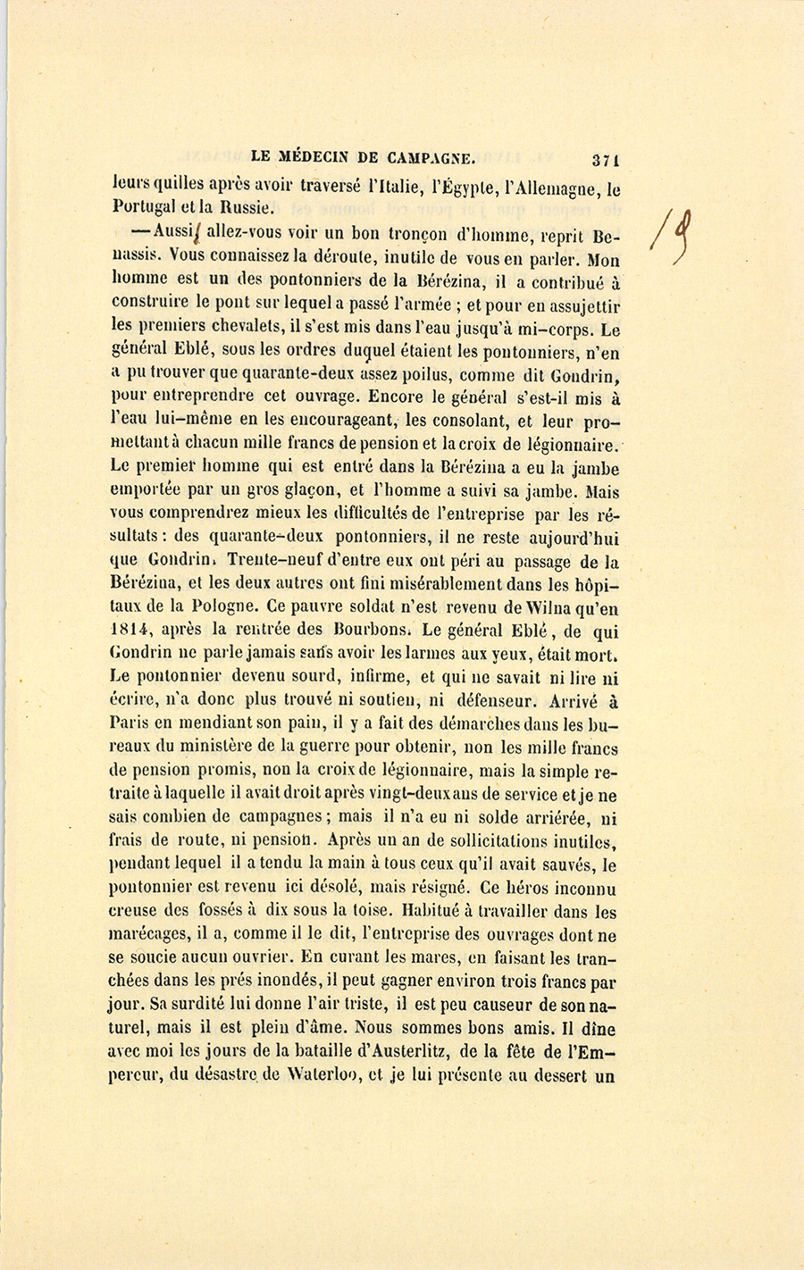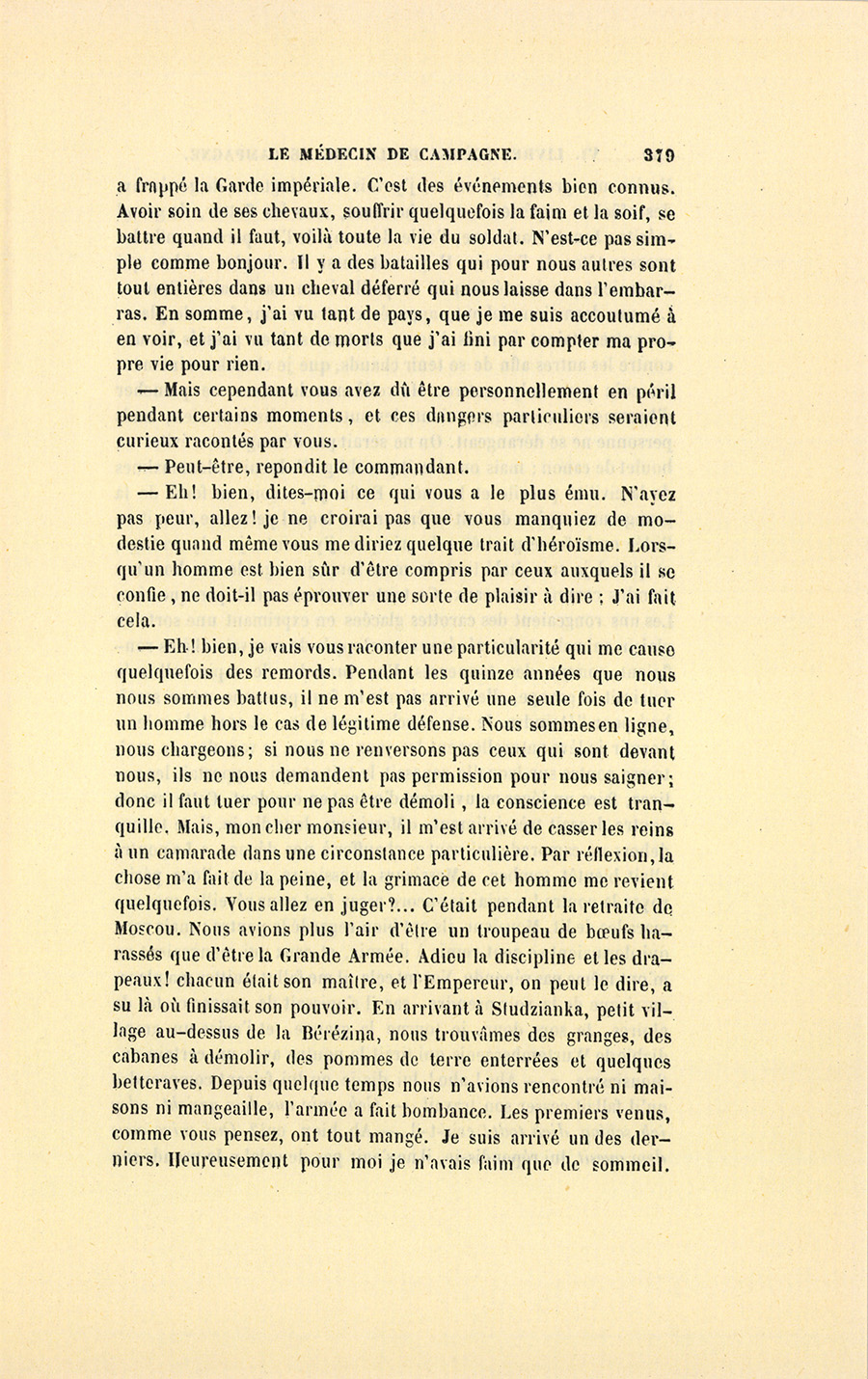 – Elle a raison, s’écria doucement Benassis, vous devriez nous conter quelque bonne aventure, pendant que nous marchons. Allons, une affaire intéressante, comme celle de votre poutre, à la Bérésina.