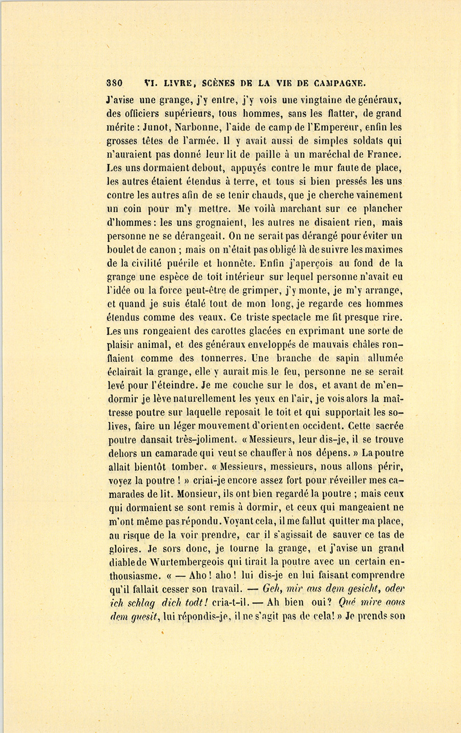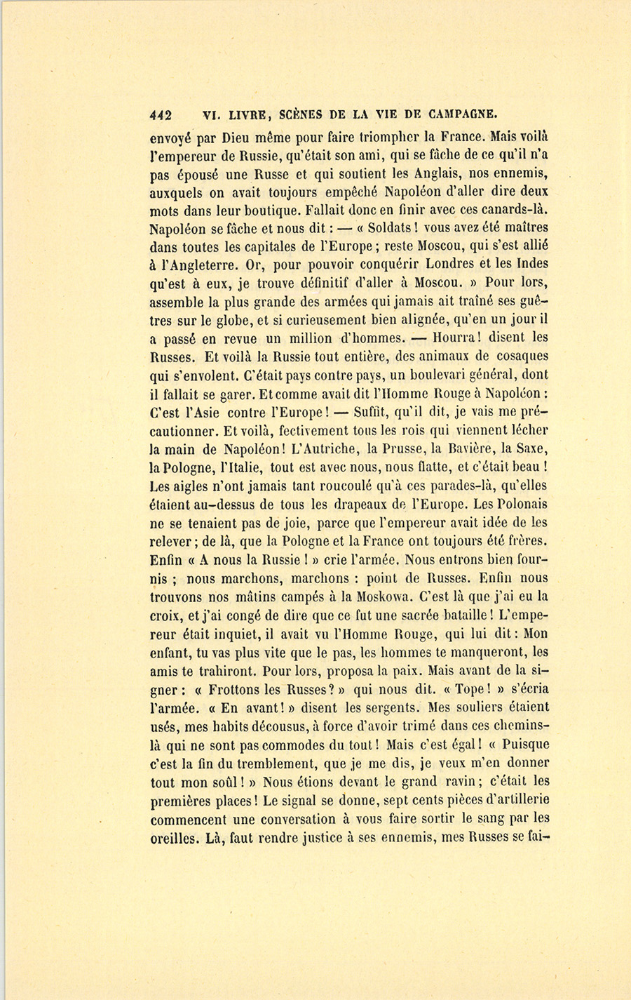 – Monsieur l’officier, dit-elle après un moment de silence, vous ne m’avez rien dit de vous, et j’aurais voulu vous entendre raconter quelque aventure de guerre. J’aime bien ce que vous avez dit de Napoléon, mais ça m’a fait mal… Si vous étiez bien aimable…