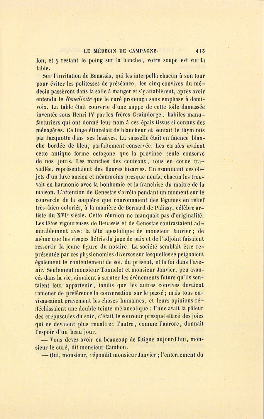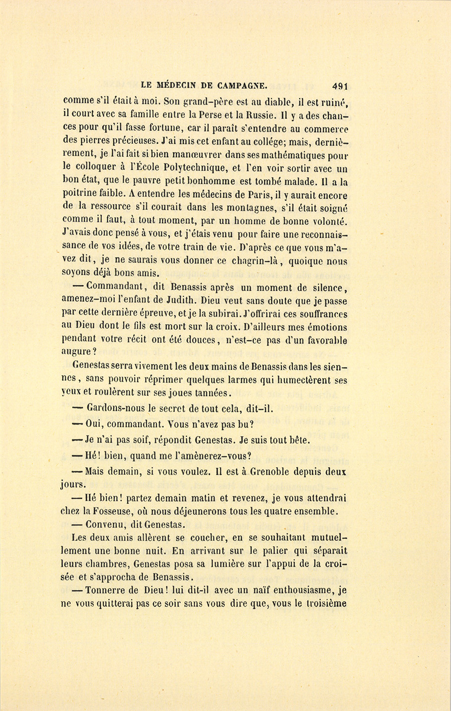 – J’irai sans doute voir Benassis demain, et je prendrai son avis {p. 503} sur l’état que je dois faire embrasser à ce camarade-là, se dit Genestas en allant au repas d’adieu que ses officiers lui donnaient, car il ne devait plus rester que quelques jours à Grenoble.