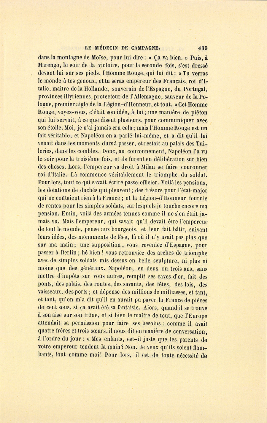 Genestas s’assit à demi sur le bord de la table et garda le silence. Le feu répandait dans la chaumière une clarté plus vive que celle du soleil dont les rayons, brisés par le sommet des montagnes, ne peuvent jamais arriver dans cette partie de la vallée. À la lueur de ce feu, fait avec quelques branches de sapin résineux qui entretenaient une flamme brillante, le militaire aperçut la figure de l’homme qu’un secret intérêt le contraignait à chercher, à étudier, à parfaitement connaître. Monsieur Benassis, le médecin du canton, resta les bras croisés, écouta froidement Genestas, lui rendit son salut, et se retourna vers le malade sans se croire l’objet d’un examen aussi sérieux que le fut celui du militaire.