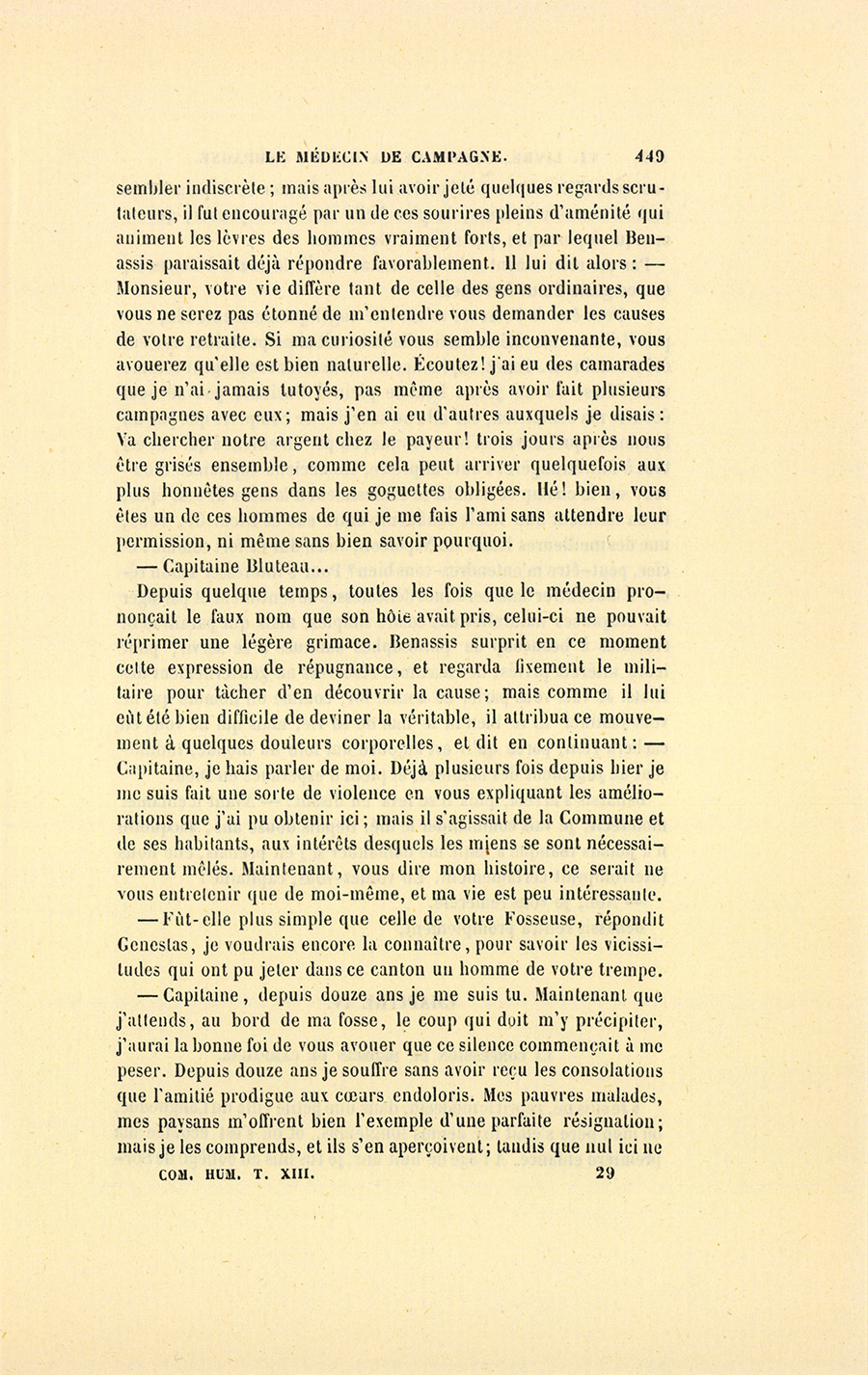 – Je n’ai pas besoin, dit le militaire, de demander si vous êtes monsieur Benassis. Étranger, impatient de vous voir, vous m’excuserez, monsieur, d’être venu vous chercher sur votre champ de bataille au lieu de vous avoir attendu chez vous. Ne vous dérangez pas, faites vos affaires. Quand vous aurez fini, je vous dirai l’objet de ma visite.