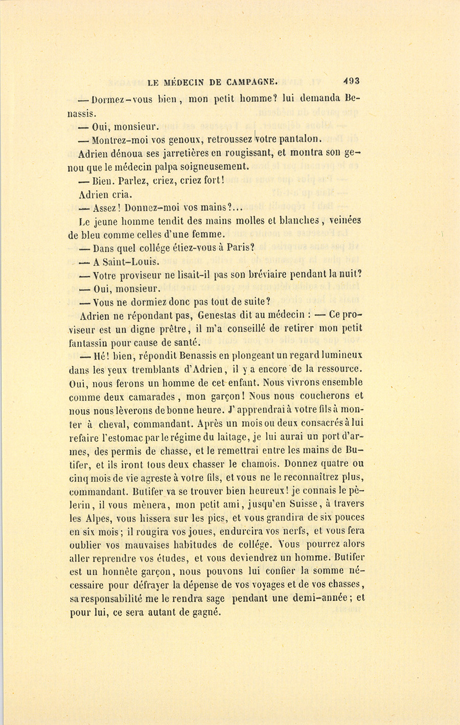 – Hé ! bien, répondit Benassis en plongeant un regard lumineux dans les yeux tremblants d’Adrien, il y a encore de la ressource. Oui, nous ferons un homme de cet enfant. Nous vivrons ensemble comme deux camarades, mon garçon ! Nous nous coucherons et nous nous lèverons de bonne heure. J’apprendrai à votre fils à monter à cheval, commandant. Après un mois ou deux consacrés à lui refaire l’estomac par le régime du laitage, je lui aurai un port d’armes, des permis de chasse, et le remettrai entre les mains de Butifer, et ils iront tous deux chasser le chamois. Donnez quatre ou cinq mois de vie agreste à votre fils, et vous ne le reconnaîtrez plus, commandant. Butifer va se trouver bien heureux ! je connais le pèlerin, il vous mènera, mon petit ami, jusqu’en Suisse, à travers les Alpes, vous hissera sur les pics, et vous grandira de six pouces en six mois ; il rougira vos joues, endurcira vos nerfs, et vous fera oublier vos mauvaises habitudes de collége. Vous pourrez alors aller reprendre vos études, et vous deviendrez un homme. Butifer est un honnête garçon, nous pouvons lui confier la somme nécessaire pour défrayer la dépense de vos voyages et de vos chasses, sa responsabilité me le rendra sage pendant une demi-année ; et pour lui, ce sera autant de gagné.