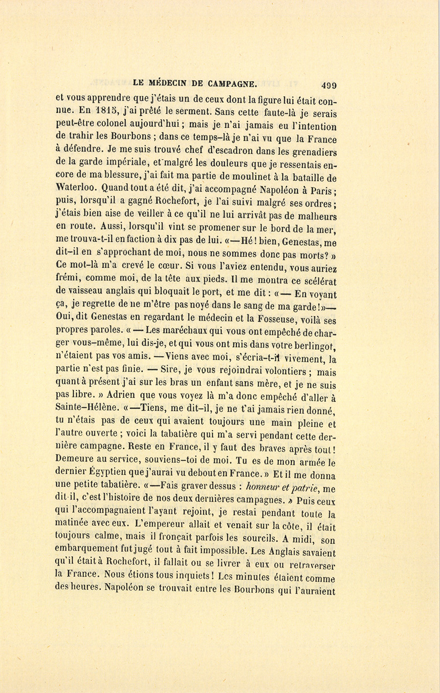– Je vais vous la dire, répondit Genestas. La veille de la bataille de Friedland, reprit-il après une pause, j’avais été envoyé en mission au quartier du général Davoust, et je revenais à mon bivouac, lorsqu’au détour d’un chemin je me trouve nez à nez avec l’empereur. Napoléon me regarde : « – Tu es le capitaine Genestas ? me dit-il. – Oui, sire. – Tu es allé en Égypte ? – Oui, sire. – Ne continue pas d’aller par ce chemin-là, me dit-il, prends à gauche, tu te trouveras plus tôt à ta division. » Vous ne sauriez imaginer avec quel accent de bonté l’empereur me dit ces paroles, lui qui avait bien d’autres chats à fouetter, car il parcourait le pays pour reconnaître son champ de bataille. Je vous raconte cette aventure pour vous faire voir quelle mémoire il avait, {p. 499} et vous apprendre que j’étais un de ceux dont la figure lui était connue. En 1815, j’ai prêté le serment. Sans cette faute-là je serais peut-être colonel aujourd’hui ; mais je n’ai jamais eu l’intention de trahir les Bourbons ; dans ce temps-là je n’ai vu que la France à défendre. Je me suis trouvé chef d’escadron dans les grenadiers de la garde impériale, et malgré les douleurs que je ressentais encore de ma blessure, j’ai fait ma partie de moulinet à la bataille de Waterloo. Quand tout a été dit, j’ai accompagné Napoléon à Paris ; puis, lorsqu’il a gagné Rochefort, je l’ai suivi malgré ses ordres ; j’étais bien aise de veiller à ce qu’il ne lui arrivât pas de malheurs en route. Aussi, lorsqu’il vint se promener sur le bord de la mer, me trouva-t-il en faction à dix pas de lui. « – Hé ! bien, Genestas, me dit-il en s’approchant de moi, nous ne sommes donc pas morts ? » Ce mot-là m’a crevé le cœur. Si vous l’aviez entendu, vous auriez frémi, comme moi, de la tête aux pieds. Il me montra ce scélérat de vaisseau anglais qui bloquait le port, et me dit : « – En voyant ça, je regrette de ne m’être pas noyé dans le sang de ma garde ! » – Oui, dit Genestas en regardant le médecin et la Fosseuse, voilà ses propres paroles. « – Les maréchaux qui vous ont empêché de charger vous-même, lui dis-je, et qui vous ont mis dans votre berlingot, n’étaient pas vos amis. – Viens avec moi, s’écria-t-il vivement, la partie n’est pas finie. – Sire, je vous rejoindrai volontiers ; mais quant à présent j’ai sur les bras un enfant sans mère, et je ne suis pas libre. » Adrien que vous voyez là m’a donc empêché d’aller à Sainte-Hélène. « – Tiens, me dit-il, je ne t’ai jamais rien donné, tu n’étais pas de ceux qui avaient toujours une main pleine et l’autre ouverte ; voici la tabatière qui m’a servi pendant cette dernière campagne. Reste en France, il y faut des braves après tout ! Demeure au service, souviens-toi de moi. Tu es de mon armée le dernier Égyptien que j’aurai vu debout en France. » Et il me donna une petite tabatière. « – Fais graver dessus : honneur et patrie, me dit-il, c’est l’histoire de nos deux dernières campagnes. » Puis ceux qui l’accompagnaient l’ayant rejoint, je restai pendant toute la matinée avec eux. L’empereur allait et venait sur la côte, il était toujours calme, mais il fronçait parfois les sourcils. À midi, son embarquement fut jugé tout à fait impossible. Les Anglais savaient qu’il était à Rochefort, il fallait ou se livrer à eux ou retraverser la France. Nous étions tous inquiets ! Les minutes étaient comme des heures. Napoléon se trouvait entre les Bourbons qui l’auraient {p. 500} fusillé, et les Anglais qui ne sont point des gens honorables, car ils ne se laveront jamais de la honte dont ils se sont couverts en jetant sur un rocher un ennemi qui leur demandait l’hospitalité. Dans cette anxiété, je ne sais quel homme de sa suite lui présente le lieutenant Doret, un marin qui venait lui proposer les moyens de passer en Amérique. En effet, il y avait dans le port un brick de l’État et un bâtiment marchand. « – Capitaine ! lui dit l’empereur, comment vous y prendriez-vous donc ? – Sire, répondit l’homme, vous serez sur le vaisseau marchand, je monterai le brick sous pavillon blanc avec des hommes dévoués, nous aborderons l’anglais, nous y mettrons le feu, nous sauterons, vous passerez. – Nous irons avec vous ! » criai-je au capitaine. Napoléon nous regarda tous et dit : « – Capitaine Doret, restez à la France. » C’est la seule fois que j’ai vu Napoléon ému. Puis il nous fit un signe de main et rentra. Je partis quand je l’eus vu abordant le vaisseau anglais. Il était perdu, et il le savait. Il y avait dans le port un traître qui, par des signaux, avertissait les ennemis de la présence de l’empereur. Napoléon a donc essayé un dernier moyen, il a fait ce qu’il faisait sur les champs de bataille, il est allé à eux, au lieu de les laisser venir à lui. Vous parlez de chagrins, rien ne peut vous peindre le désespoir de ceux qui l’ont aimé pour lui.