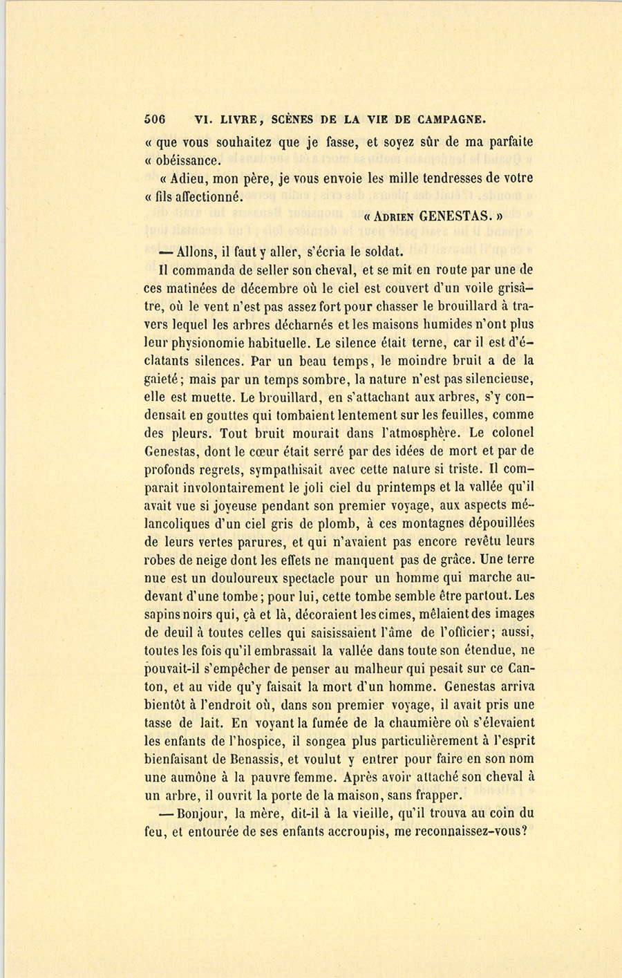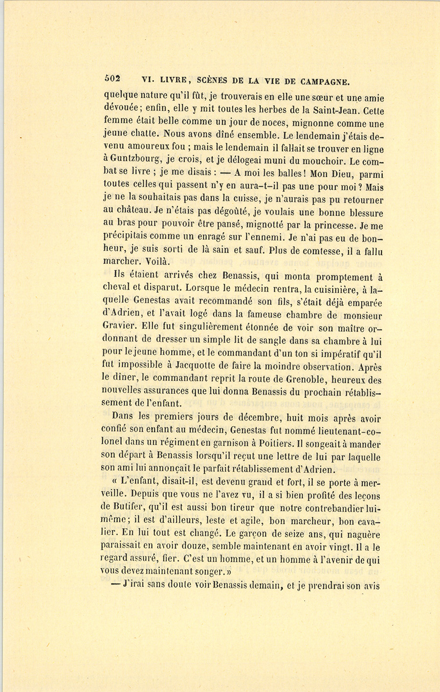 Dans les premiers jours de décembre, huit mois après avoir confié son enfant au médecin, Genestas fut nommé lieutenant-colonel dans un régiment en garnison à Poitiers. Il songeait à mander son départ à Benassis lorsqu’il reçut une lettre de lui par laquelle son ami lui annonçait le parfait rétablissement d’Adrien.