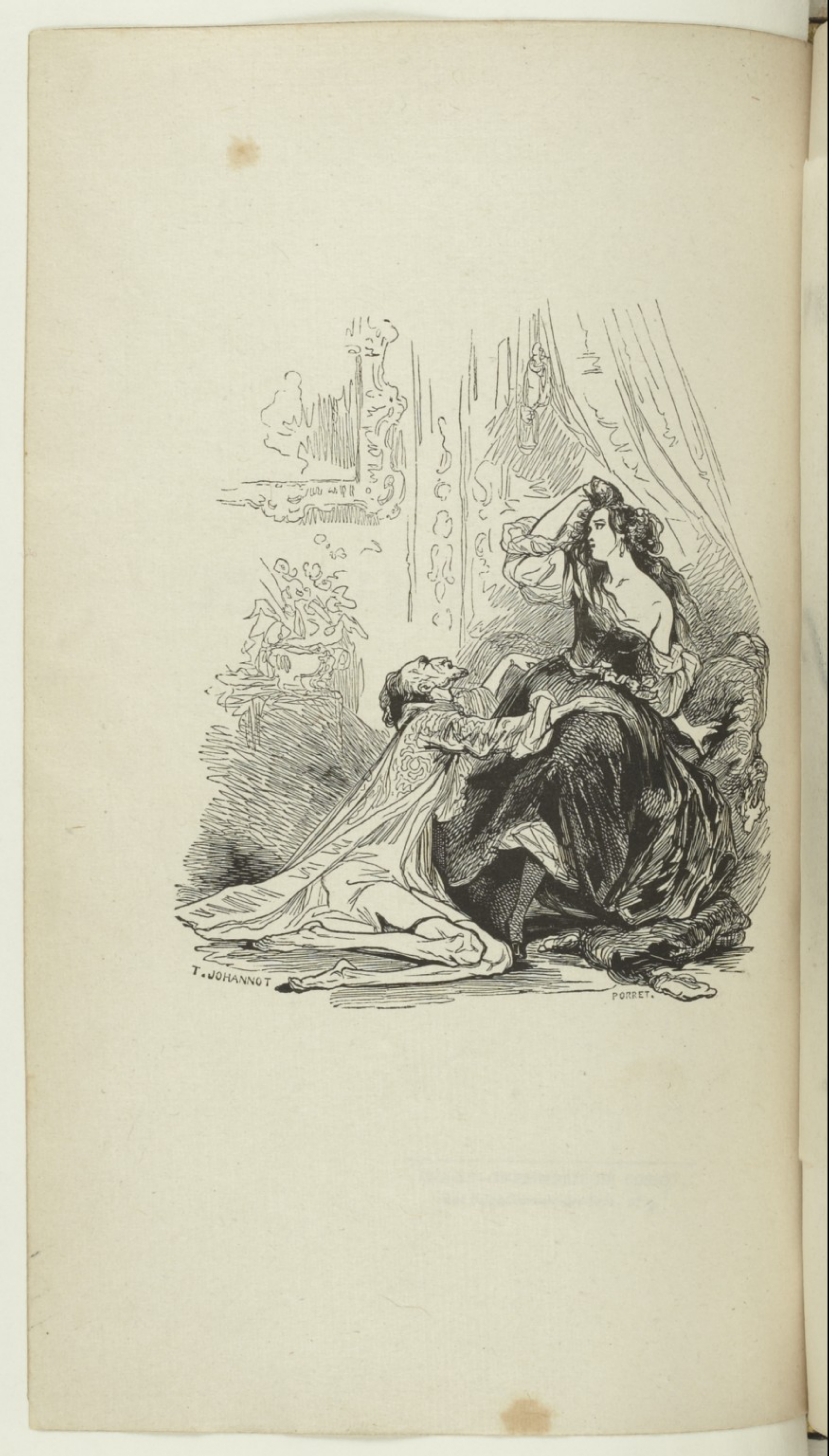 Il vit ses amis convoqués, puis des femmes parées et ravissantes, mais la gorge nue, les épaules découvertes, les chevelures pleines de fleurs, les yeux brillans, et {p. 338}de beautés diverses, et agaçantes sous de voluptueux travestissemens. L’une avait dessiné ses formes attrayantes par une jaquette irlandaise ; l’autre portait la basquina lascive des Andalouses ; celle-ci, demi-nue en Diane chasseresse, celle-là, modeste et amoureuse sous le costume de mademoiselle de Lavallière, étaient également vouées à l’ivresse, comme tous ses hôtes ; car dans leurs regards 24 brillaient la joie, l’amour, le plaisir.