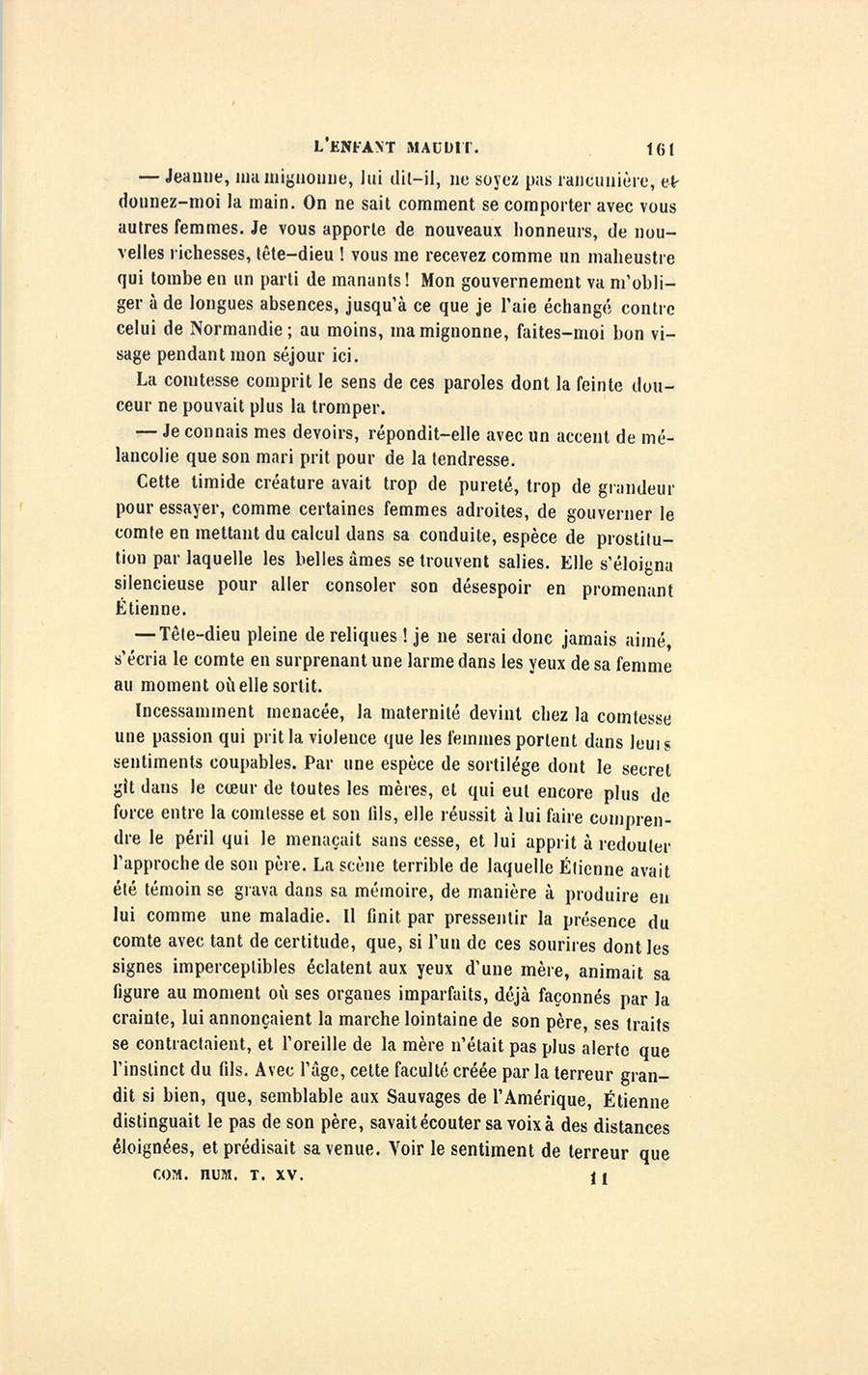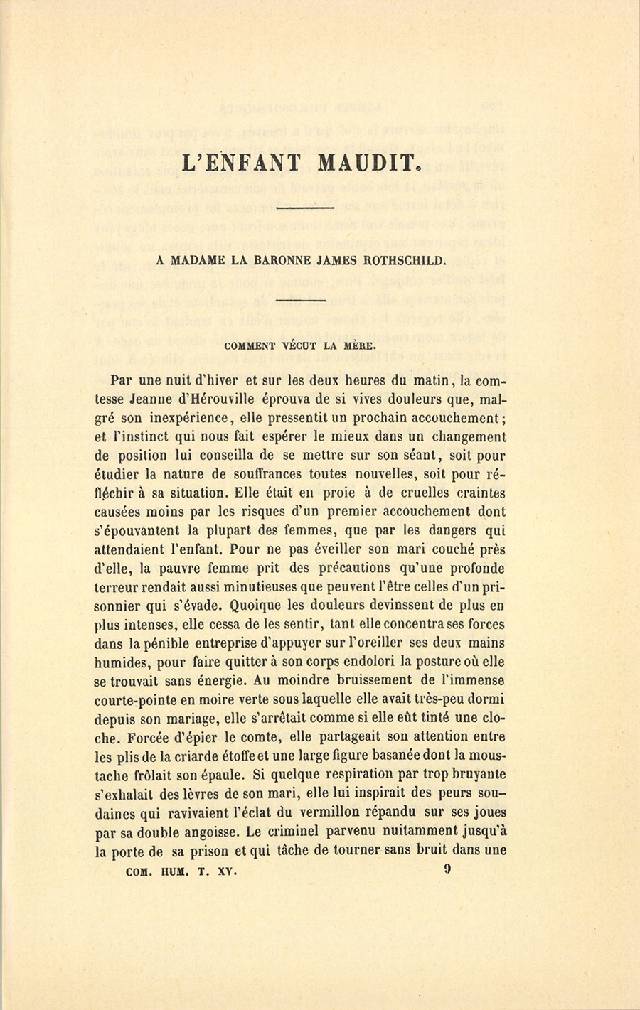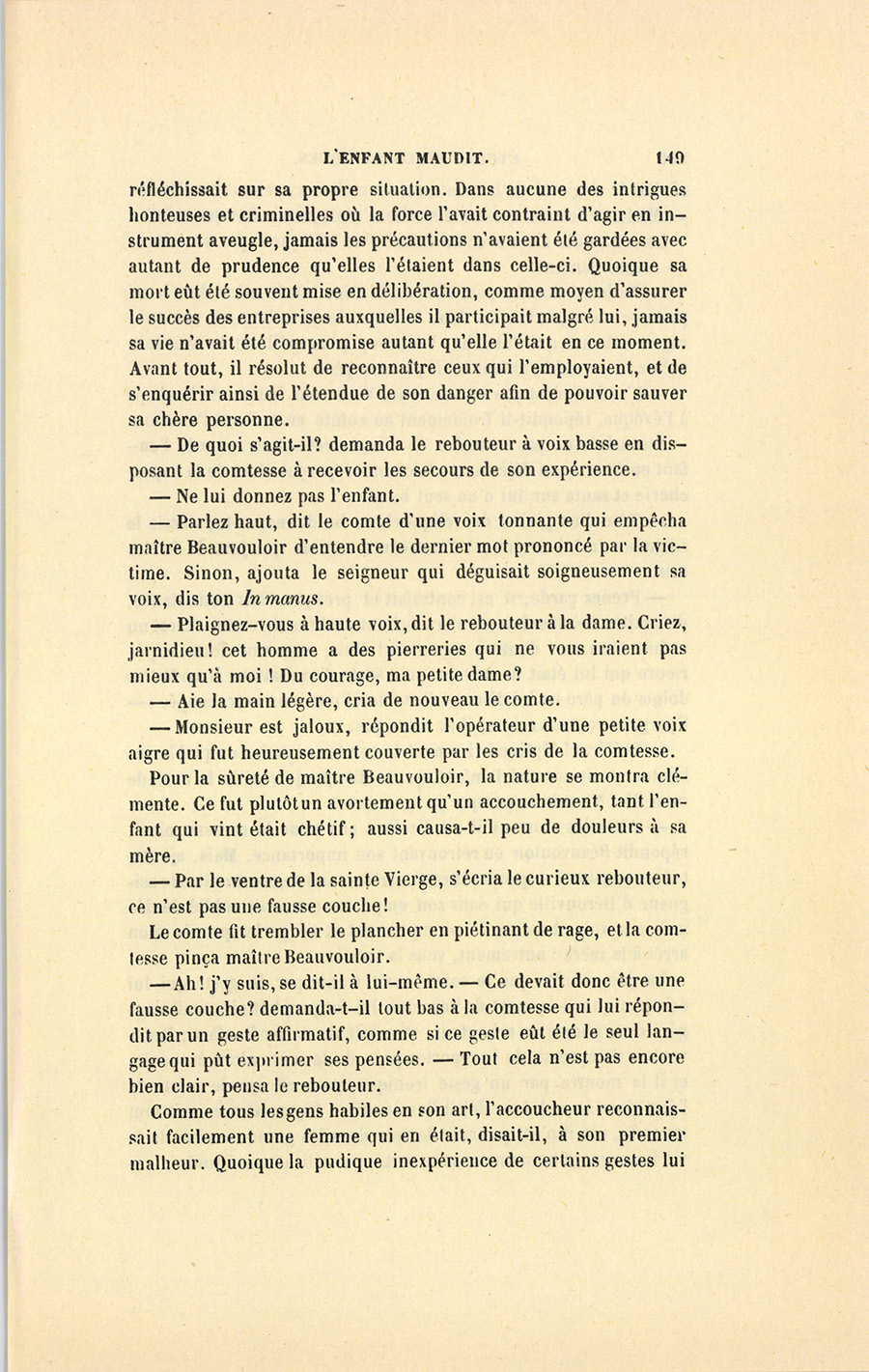 Comme tous les gens habiles en son art, l’accoucheur reconnaissait facilement une femme qui en était, disait-il, à son premier malheur. Quoique la pudique inexpérience de certains gestes lui {p. 150} révélât la virginité de la comtesse, le malicieux rebouteur s’écria : – Madame accouche comme si elle n’avait jamais fait que cela !