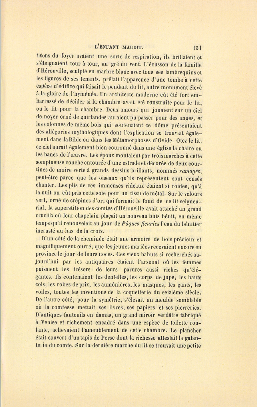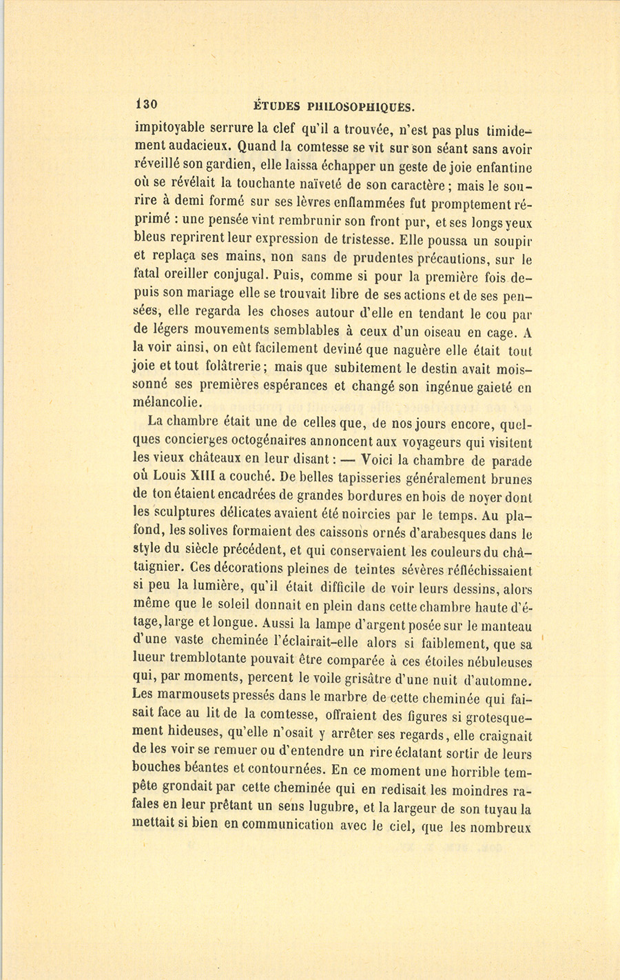 La chambre était une de celles que, de nos jours encore, quelques concierges octogénaires annoncent aux voyageurs qui visitent les vieux châteaux en leur disant : – Voici la chambre de parade où Louis XIII a couché. De belles tapisseries généralement brunes de ton étaient encadrées de grandes bordures en bois de noyer dont les sculptures délicates avaient été noircies par le temps. Au plafond, les solives formaient des caissons ornés d’arabesques dans le style du siècle précédent, et qui conservaient les couleurs du châtaignier. Ces décorations pleines de teintes sévères réfléchissaient si peu la lumière, qu’il était difficile de voir leurs dessins, alors même que le soleil donnait en plein dans cette chambre haute d’étage, large et longue. Aussi la lampe d’argent posée sur le manteau d’une vaste cheminée l’éclairait-elle alors si faiblement, que sa lueur tremblotante pouvait être comparée à ces étoiles nébuleuses qui, par moments, percent le voile grisâtre d’une nuit d’automne. Les marmousets pressés dans le marbre de cette cheminée qui faisait face au lit de la comtesse, offraient des figures si grotesquement hideuses, qu’elle n’osait y arrêter ses regards, elle craignait de les voir se remuer ou d’entendre un rire éclatant sortir de leurs bouches béantes et contournées. En ce moment une horrible tempête grondait par cette cheminée qui en redisait les moindres rafales en leur prêtant un sens lugubre, et la largeur de son tuyau la mettait si bien en communication avec le ciel, que les nombreux {p. 131} tisons du foyer avaient une sorte de respiration, ils brillaient et s’éteignaient tour à tour, au gré du vent. L’écusson de la famille d’Hérouville, sculpté en marbre blanc avec tous ses lambrequins et les figures de ses tenants, prêtait l’apparence d’une tombe à cette espèce d’édifice qui faisait le pendant du lit, autre monument élevé à la gloire de l’hyménée. Un architecte moderne eût été fort embarrassé de décider si la chambre avait été construite pour le lit, ou le lit pour la chambre. Deux amours qui jouaient sur un ciel de noyer orné de guirlandes auraient pu passer pour des anges, et les colonnes de même bois qui soutenaient ce dôme présentaient des allégories mythologiques dont l’explication se trouvait également dans la Bible ou dans les Métamorphoses d’Ovide. Ôtez le lit, ce ciel aurait également bien couronné dans une église la chaire ou les bancs de l’œuvre. Les époux montaient par trois marches à cette somptueuse couche entourée d’une estrade et décorée de deux courtines de moire verte à grands dessins brillants, nommés ramages, peut-être parce que les oiseaux qu’ils représentent sont censés chanter. Les plis de ces immenses rideaux étaient si roides, qu’à la nuit on eût pris cette soie pour un tissu de métal. Sur le velours vert, orné de crépines d’or, qui formait le fond de ce lit seigneurial, la superstition des comtes d’Hérouville avait attaché un grand crucifix où leur chapelain plaçait un nouveau buis bénit, en même temps qu’il renouvelait au jour de Pâques fleuries l’eau du bénitier incrusté au bas de la croix.