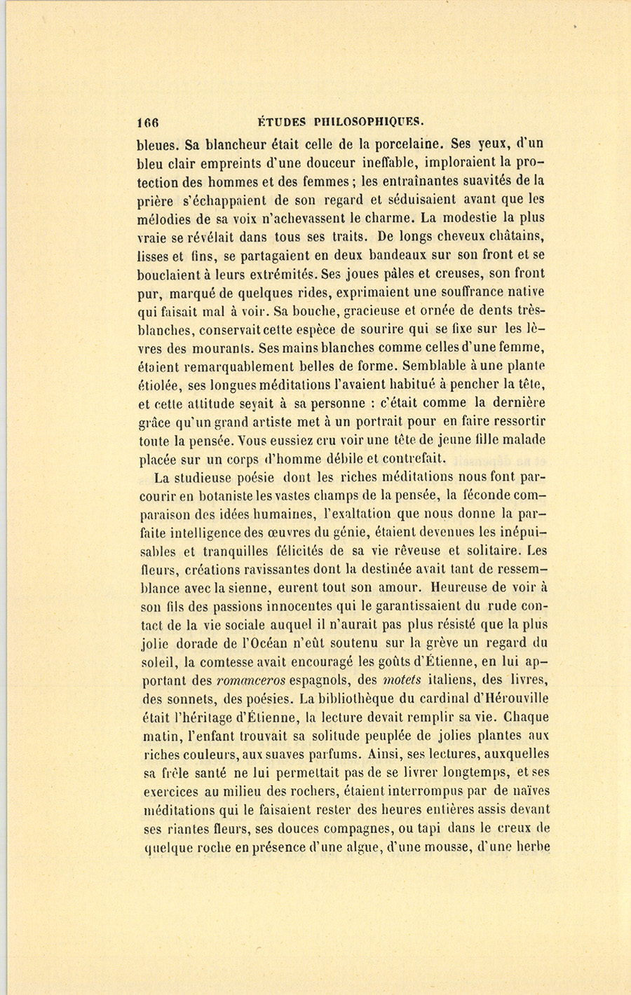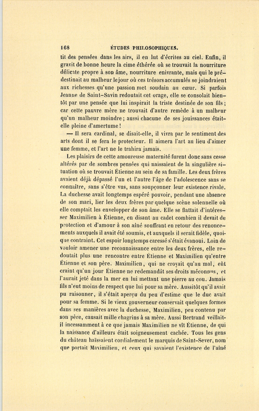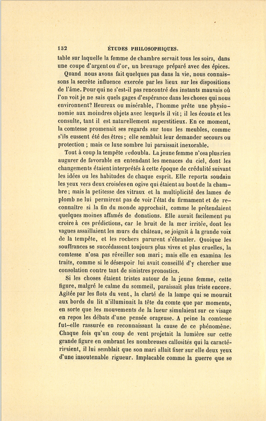 Quand nous avons fait quelques pas dans la vie, nous connaissons la secrète influence exercée par les lieux sur les dispositions de l’âme. Pour qui ne s’est-il pas rencontré des instants mauvais où l’on voit je ne sais quels gages d’espérance dans les choses qui nous environnent ? Heureux ou misérable, l’homme prête une physionomie aux moindres objets avec lesquels il vit ; il les écoute et les consulte, tant il est naturellement superstitieux. En ce moment, la comtesse promenait ses regards sur tous les meubles, comme s’ils eussent été des êtres ; elle semblait leur demander secours ou protection ; mais ce luxe sombre lui paraissait inexorable.