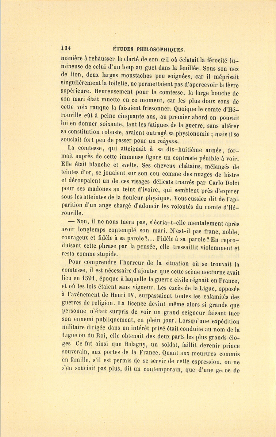 Pour comprendre l’horreur de la situation où se trouvait la comtesse, il est nécessaire d’ajouter que cette scène nocturne avait lieu en 1591, époque à laquelle la guerre civile régnait en France, et où les lois étaient sans vigueur. Les excès de la Ligue, opposée à l’avénement de Henri IV, surpassaient toutes les calamités des guerres de religion. La licence devint même alors si grande que personne n’était surpris de voir un grand seigneur faisant tuer son ennemi publiquement, en plein jour. Lorsqu’une expédition militaire dirigée dans un intérêt privé était conduite au nom de la Ligue ou du Roi, elle obtenait des deux parts les plus grands éloges. Ce fut ainsi que Balagny, un soldat, faillit devenir prince souverain, aux portes de la France. Quant aux meurtres commis en famille, s’il est permis de se servir de cette expression, on ne s’en souciait pas plus, dit un contemporain, que d’une gerbe de {p. 135} feurre, à moins qu’ils n’eussent été accompagnés de circonstances par trop cruelles. Quelque temps avant la mort du roi, une dame de la cour assassina un gentilhomme qui avait tenu sur elle des discours malséants. L’un des mignons de Henri III lui dit : – Elle l’a, vive Dieu ! sire, fort joliment dagué !