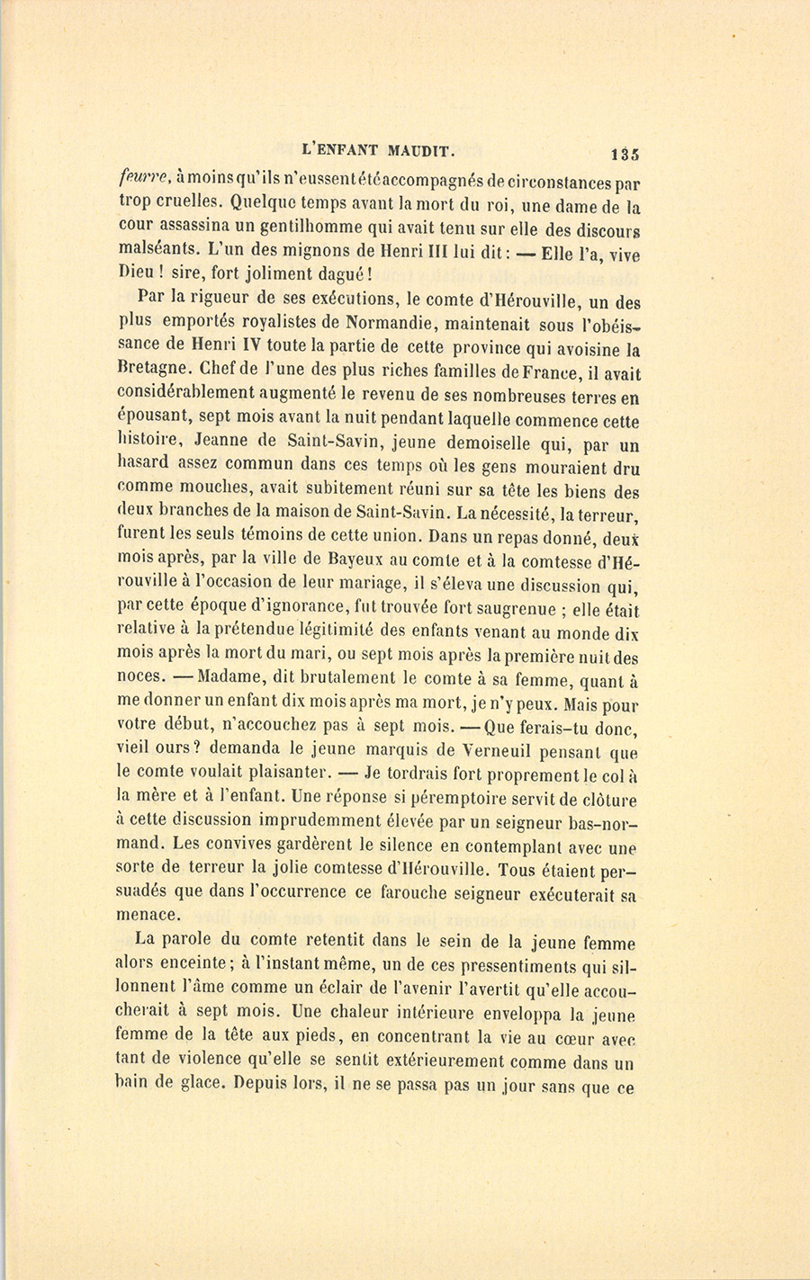 Par la rigueur de ses exécutions, le comte d’Hérouville, un des plus emportés royalistes de Normandie, maintenait sous l’obéissance de Henri IV toute la partie de cette province qui avoisine la Bretagne. Chef de l’une des plus riches familles de France, il avait considérablement augmenté le revenu de ses nombreuses terres en épousant, sept mois avant la nuit pendant laquelle commence cette histoire, Jeanne de Saint-Savin, jeune demoiselle qui, par un hasard assez commun dans ces temps où les gens mouraient dru comme mouches, avait subitement réuni sur sa tête les biens des deux branches de la maison de Saint-Savin. La nécessité, la terreur, furent les seuls témoins de cette union. Dans un repas donné, deux mois après, par la ville de Bayeux au comte et à la comtesse d’Hérouville à l’occasion de leur mariage, il s’éleva une discussion qui, par cette époque d’ignorance, fut trouvée fort saugrenue ; elle était relative à la prétendue légitimité des enfants venant au monde dix mois après la mort du mari, ou sept mois après la première nuit des noces. – Madame, dit brutalement le comte à sa femme, quant à me donner un enfant dix mois après ma mort, je n’y peux. Mais pour votre début, n’accouchez pas à sept mois. – Que ferais-tu donc, vieil ours ? demanda le jeune marquis de Verneuil pensant que le comte voulait plaisanter. – Je tordrais fort proprement le col à la mère et à l’enfant. Une réponse si péremptoire servit de clôture à cette discussion imprudemment élevée par un seigneur bas-normand. Les convives gardèrent le silence en contemplant avec une sorte de terreur la jolie comtesse d’Hérouville. Tous étaient persuadés que dans l’occurrence ce farouche seigneur exécuterait sa menace.
