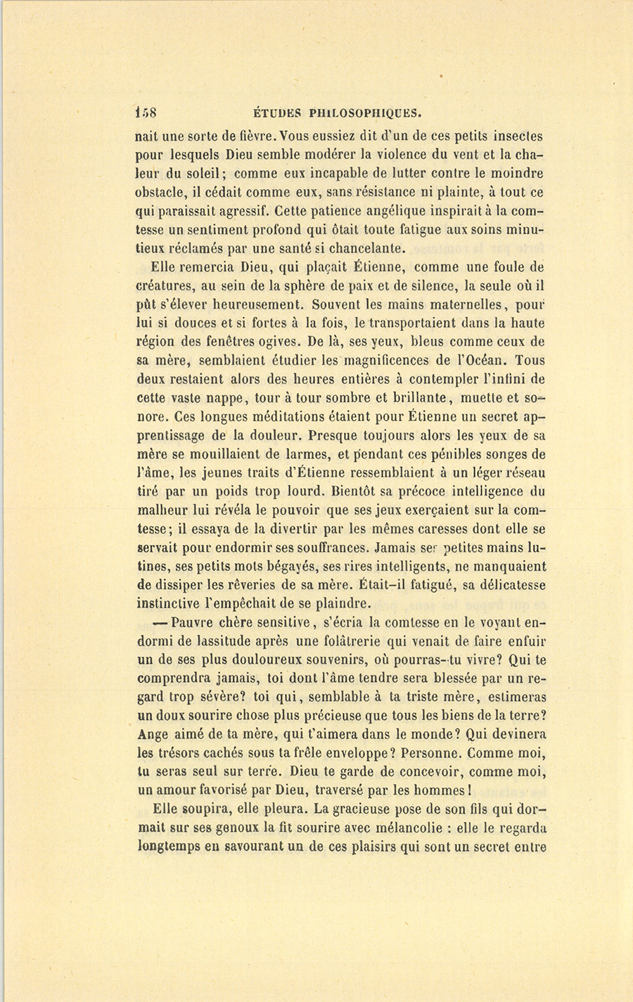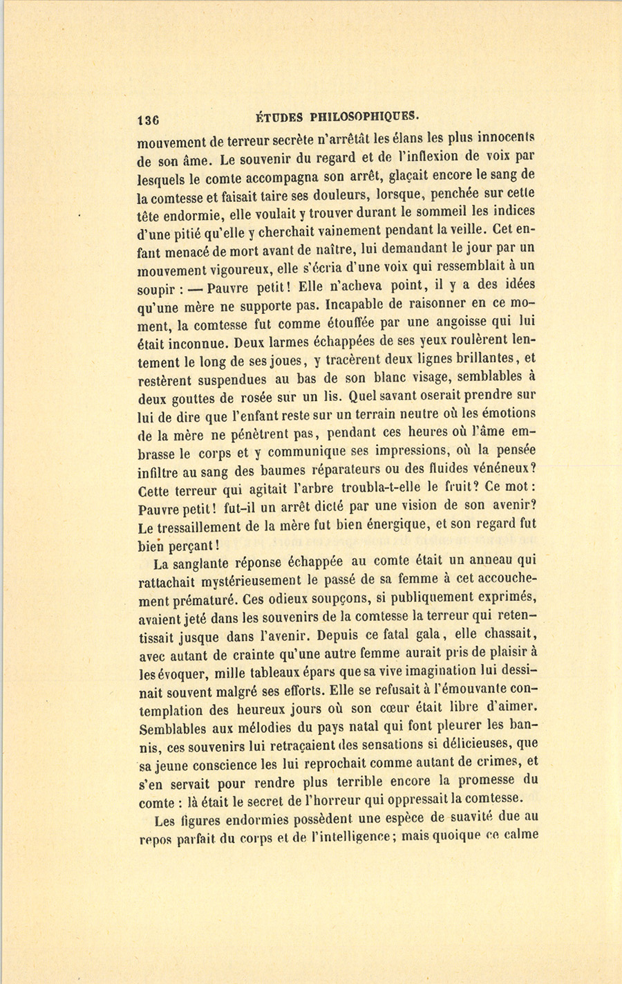 La parole du comte retentit dans le sein de la jeune femme alors enceinte ; à l’instant même, un de ces pressentiments qui sillonnent l’âme comme un éclair de l’avenir l’avertit qu’elle accoucherait à sept mois. Une chaleur intérieure enveloppa la jeune femme de la tête aux pieds, en concentrant la vie au cœur avec tant de violence qu’elle se sentit extérieurement comme dans un bain de glace. Depuis lors, il ne se passa pas un jour sans que ce {p. 136} mouvement de terreur secrète n’arrêtât les élans les plus innocents de son âme. Le souvenir du regard et de l’inflexion de voix par lesquels le comte accompagna son arrêt, glaçait encore le sang de la comtesse et faisait taire ses douleurs, lorsque, penchée sur cette tête endormie, elle voulait y trouver durant le sommeil les indices d’une pitié qu’elle y cherchait vainement pendant la veille. Cet enfant menacé de mort avant de naître, lui demandant le jour par un mouvement vigoureux, elle s’écria d’une voix qui ressemblait à un soupir : – Pauvre petit ! Elle n’acheva point, il y a des idées qu’une mère ne supporte pas. Incapable de raisonner en ce moment, la comtesse fut comme étouffée par une angoisse qui lui était inconnue. Deux larmes échappées de ses yeux roulèrent lentement le long de ses joues, y tracèrent deux lignes brillantes, et restèrent suspendues au bas de son blanc visage, semblables à deux gouttes de rosée sur un lis. Quel savant oserait prendre sur lui de dire que l’enfant reste sur un terrain neutre où les émotions de la mère ne pénètrent pas, pendant ces heures où l’âme embrasse le corps et y communique ses impressions, où la pensée infiltre au sang des baumes réparateurs ou des fluides vénéneux ? Cette terreur qui agitait l’arbre troubla-t-elle le fruit ? Ce mot : Pauvre petit ! fut-il un arrêt dicté par une vision de son avenir ? Le tressaillement de la mère fut bien énergique, et son regard fut bien perçant !