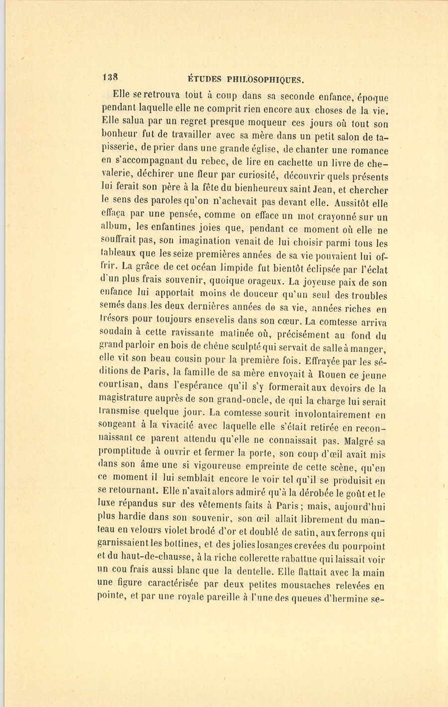 {p. 138} Elle se retrouva tout à coup dans sa seconde enfance, époque pendant laquelle elle ne comprit rien encore aux choses de la vie. Elle salua par un regret presque moqueur ces jours où tout son bonheur fut de travailler avec sa mère dans un petit salon de tapisserie, de prier dans une grande église, de chanter une romance en s’accompagnant du rebec, de lire en cachette un livre de chevalerie, déchirer une fleur par curiosité, découvrir quels présents lui ferait son père à la fête du bienheureux saint Jean, et chercher le sens des paroles qu’on n’achevait pas devant elle. Aussitôt elle effaça par une pensée, comme on efface un mot crayonné sur un album, les enfantines joies que, pendant ce moment où elle ne souffrait pas, son imagination venait de lui choisir parmi tous les tableaux que les seize premières années de sa vie pouvaient lui offrir. La grâce de cet océan limpide fut bientôt éclipsée par l’éclat d’un plus frais souvenir, quoique orageux. La joyeuse paix de son enfance lui apportait moins de douceur qu’un seul des troubles semés dans les deux dernières années de sa vie, années riches en trésors pour toujours ensevelis dans son cœur. La comtesse arriva soudain à cette ravissante matinée où, précisément au fond du grand parloir en bois de chêne sculpté qui servait de salle à manger, elle vit son beau cousin pour la première fois. Effrayée par les séditions de Paris, la famille de sa mère envoyait à Rouen ce jeune courtisan, dans l’espérance qu’il s’y formerait aux devoirs de la magistrature auprès de son grand-oncle, de qui la charge lui serait transmise quelque jour. La comtesse sourit involontairement en songeant à la vivacité avec laquelle elle s’était retirée en reconnaissant ce parent attendu qu’elle ne connaissait pas. Malgré sa promptitude à ouvrir et fermer la porte, son coup d’œil avait mis dans son âme une si vigoureuse empreinte de cette scène, qu’en ce moment il lui semblait encore le voir tel qu’il se produisit en se retournant. Elle n’avait alors admiré qu’à la dérobée le goût et le luxe répandus sur des vêtements faits à Paris ; mais, aujourd’hui plus hardie dans son souvenir, son œil allait librement du manteau en velours violet brodé d’or et doublé de satin, aux ferrons qui garnissaient les bottines, et des jolies losanges 1 crevées du pourpoint et du haut-de-chausses 2 , à la riche collerette rabattue qui laissait voir un cou frais aussi blanc que la dentelle. Elle flattait avec la main une figure caractérisée par deux petites moustaches relevées en pointe, et par une royale pareille à l’une des queues d’hermine {p. 139} semées sur l’épitoge de son père. Au milieu du silence et de la nuit, les yeux fixés sur les courtines de moire qu’elle ne voyait plus, oubliant et l’orage et son mari, la comtesse osa se rappeler comment, après bien des jours qui lui semblèrent aussi longs que des années, tant pleins ils furent, le jardin entouré de vieux murs noirs et le noir hôtel de son père lui parurent dorés et lumineux. Elle aimait, elle était aimée ! Comment, craignant les regards sévères de sa mère, elle s’était glissée un matin dans le cabinet de son père pour lui faire ses jeunes confidences, après s’être assise sur lui et s’être permis des espiègleries qui avaient attiré le sourire aux lèvres de l’éloquent magistrat, sourire qu’elle attendait pour lui dire : « – Me gronderez-vous, si je vous dis quelque chose ? » Elle croyait entendre encore son père lui disant après un interrogatoire où, pour la première fois, elle parlait de son amour : « – Eh ! bien, mon enfant, nous verrons. S’il étudie bien, s’il veut me succéder, s’il continue à te plaire, je me mettrai de ta conspiration ! » Elle n’avait plus rien écouté, elle avait baisé son père et renversé les paperasses pour courir au grand tilleul où, tous les matins avant le lever de sa redoutable mère, elle rencontrait le gentil Georges 3 de Chaverny ! Le courtisan promettait de dévorer les lois et les coutumes, il quittait les riches ajustements de la noblesse d’épée pour prendre le sévère costume des magistrats. – « Je t’aime bien mieux vêtu de noir, » lui disait-elle. Elle mentait, mais ce mensonge avait rendu son bien-aimé moins triste d’avoir jeté la dague aux champs. Le souvenir des ruses employées pour tromper sa mère dont la sévérité semblait grande, lui rendit 4 les joies fécondes d’un amour innocent, permis et partagé. C’était quelque rendez-vous sous les tilleuls, où la parole était plus libre sans témoins ; les furtives étreintes et les baisers surpris, enfin tous les naïfs à-comptes de la passion qui ne dépasse point les bornes de la modestie. Revivant comme en songe dans ces délicieuses journées où elle s’accusait d’avoir eu trop de bonheur, elle osa baiser dans le vide cette jeune figure aux regards enflammés, et cette bouche vermeille qui lui parla si bien d’amour. Elle avait aimé Chaverny pauvre en apparence ; mais combien de trésors n’avait-elle pas découverts dans cette âme aussi douce qu’elle était forte ! Tout à coup meurt le président, Chaverny ne lui succède pas, la guerre civile survient flamboyante. Par les soins de leur cousin, elle et sa mère trouvent un asile secret dans une petite ville de la {p. 140} Basse-Normandie. Bientôt les morts successives de quelques parents la rendent une des plus riches héritières de France. Avec la médiocrité de fortune s’enfuit le bonheur. La sauvage et terrible figure du comte d’Hérouville qui demande sa main, lui apparaît comme une nuée grosse de foudre qui étend son crêpe sur les richesses de la terre jusqu’alors dorée par le soleil. La pauvre comtesse s’efforce de chasser le souvenir des scènes de désespoir et de larmes amenées par sa longue résistance. Elle voit confu