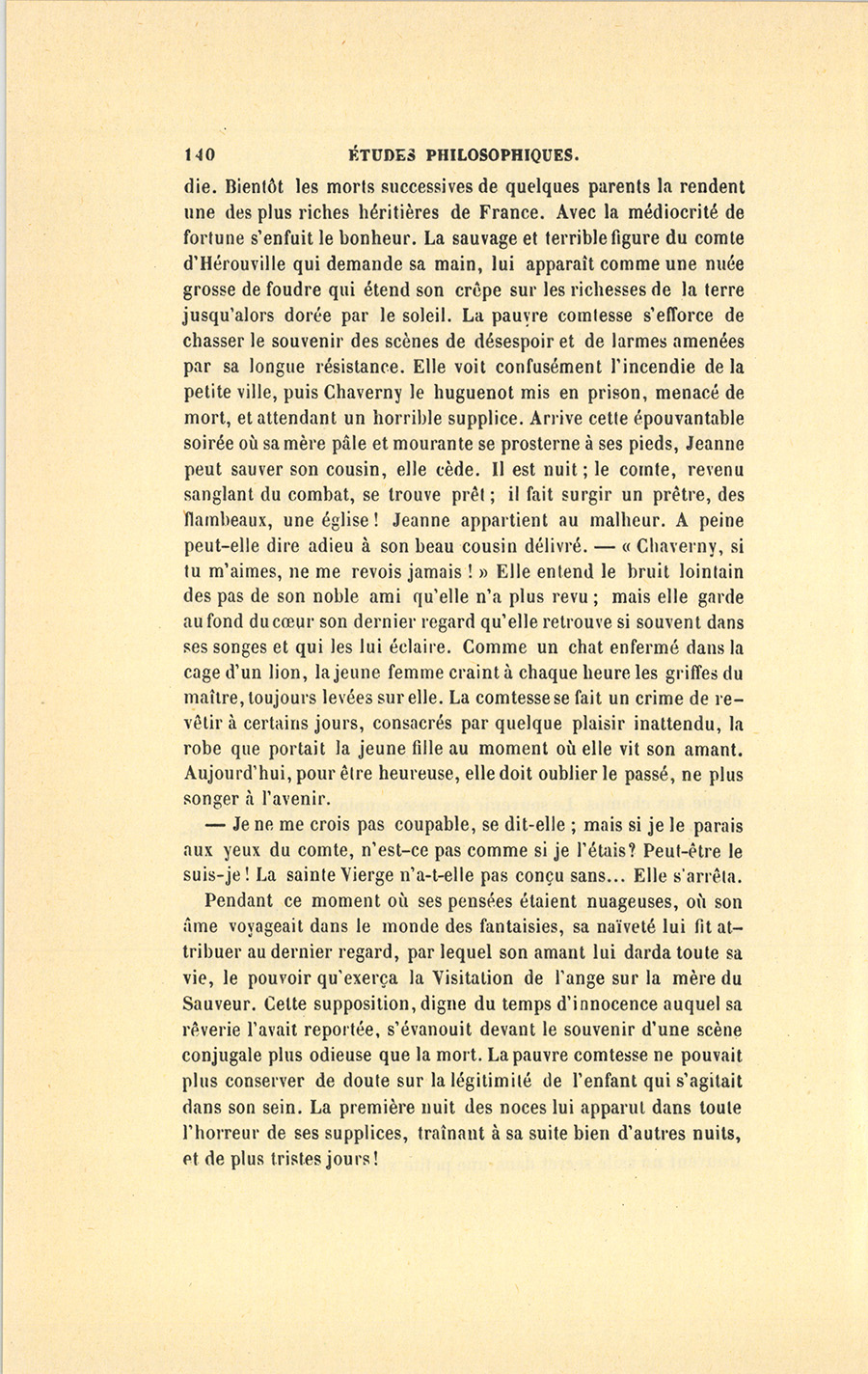 Pendant ce moment où ses pensées étaient nuageuses, où son âme voyageait dans le monde des fantaisies, sa naïveté lui fit attribuer au dernier regard, par lequel son amant lui darda toute sa vie, le pouvoir qu’exerça la Visitation de l’ange sur la mère du Sauveur. Cette supposition, digne du temps d’innocence auquel sa rêverie l’avait reportée, s’évanouit devant le souvenir d’une scène conjugale plus odieuse que la mort. La pauvre comtesse ne pouvait plus conserver de doute sur la légitimité de l’enfant qui s’agitait dans son sein. La première nuit des noces lui apparut dans toute l’horreur de ses supplices, traînant à sa suite bien d’autres nuits, et de plus tristes jours !