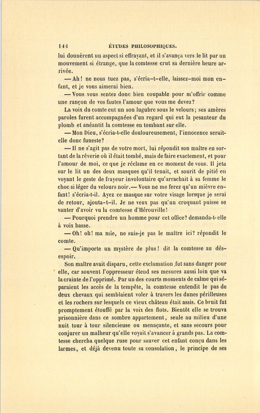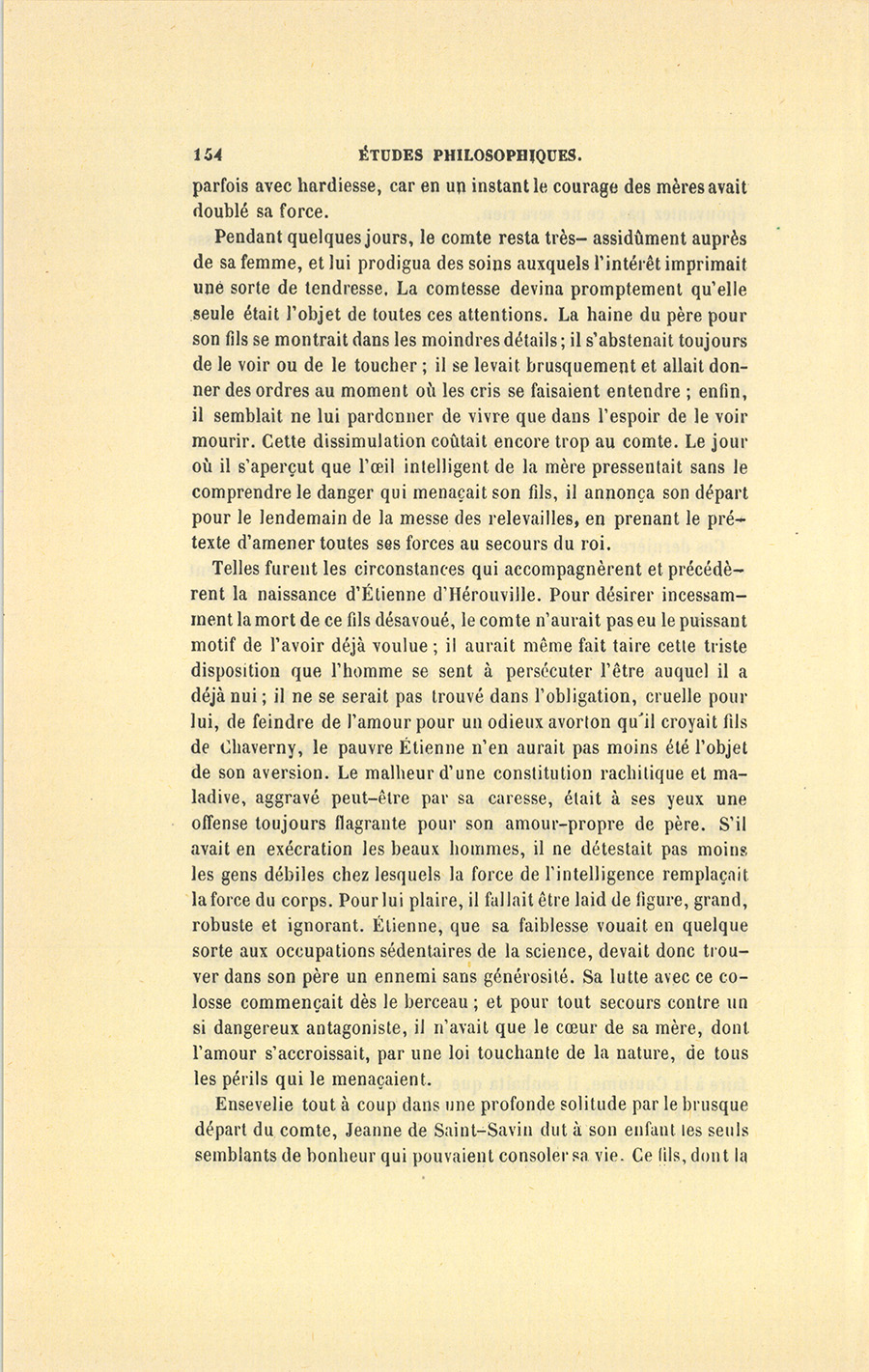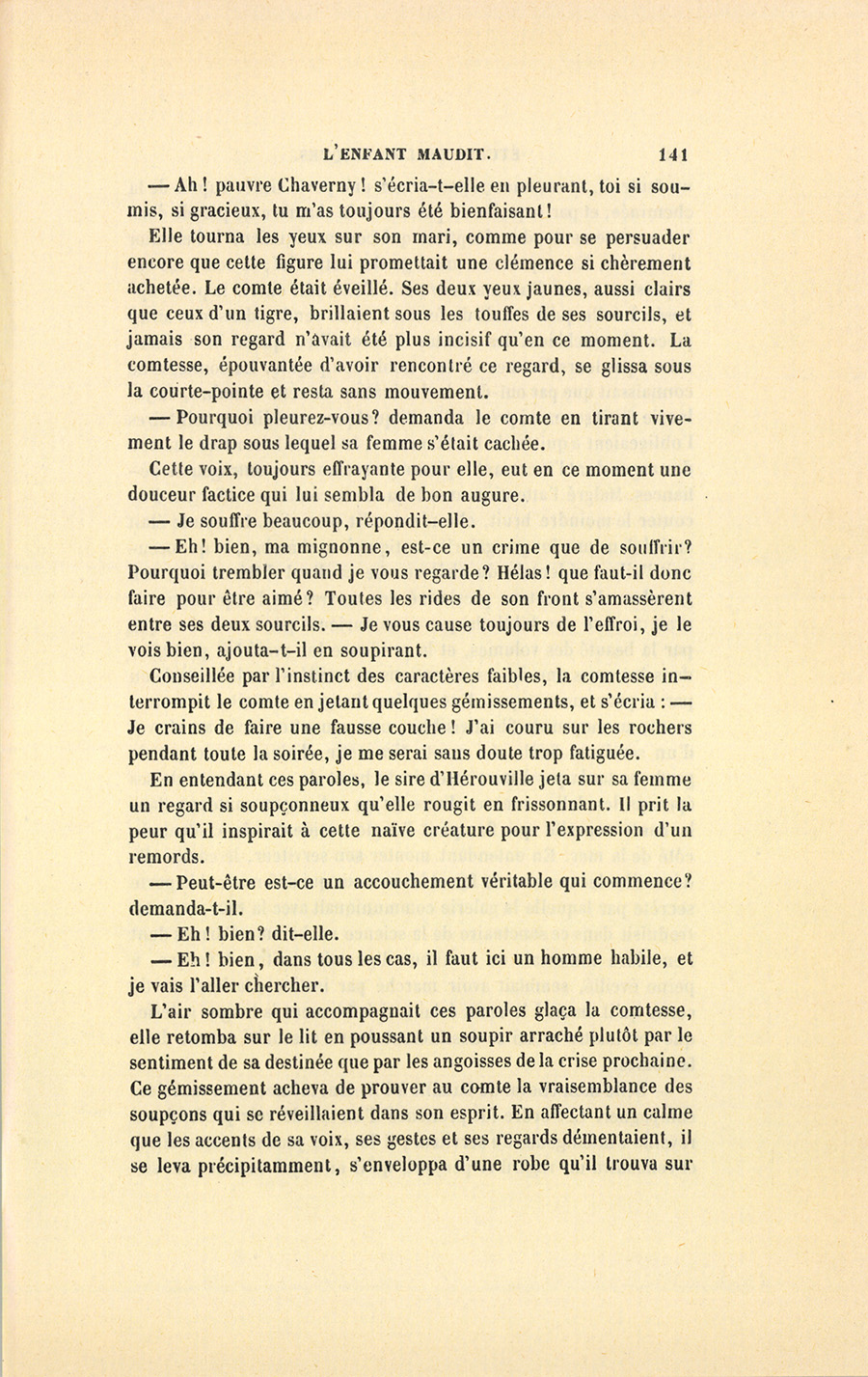 Par une nuit d’hiver et sur les deux heures du matin, la comtesse Jeanne d’Hérouville éprouva de si vives douleurs que, malgré son inexpérience, elle pressentit un prochain accouchement ; et l’instinct qui nous fait espérer le mieux dans un changement de position lui conseilla de se mettre sur son séant, soit pour étudier la nature de souffrances toutes nouvelles, soit pour réfléchir à sa situation. Elle était en proie à de cruelles craintes causées moins par les risques d’un premier accouchement dont s’épouvantent la plupart des femmes, que par les dangers qui attendaient l’enfant. Pour ne pas éveiller son mari couché près d’elle, la pauvre femme prit des précautions qu’une profonde terreur rendait aussi minutieuses que peuvent l’être celles d’un prisonnier qui s’évade. Quoique les douleurs devinssent de plus en plus intenses, elle cessa de les sentir, tant elle concentra ses forces dans la pénible entreprise d’appuyer sur l’oreiller ses deux mains humides, pour faire quitter à son corps endolori la posture où elle se trouvait sans énergie. Au moindre bruissement de l’immense courte-pointe en moire verte sous laquelle elle avait très-peu dormi depuis son mariage, elle s’arrêtait comme si elle eût tinté une cloche. Forcée d’épier le comte, elle partageait son attention entre les plis de la criarde étoffe et une large figure basanée dont la moustache frôlait son épaule. [ill.] Si quelque respiration par trop bruyante s’exhalait des lèvres de son mari, elle lui inspirait des peurs soudaines qui ravivaient l’éclat du vermillon répandu sur ses joues par sa double angoisse. Le criminel parvenu nuitamment jusqu’à la porte de sa prison et qui tâche de tourner sans bruit dans une {p. 130} impitoyable serrure la clef qu’il a trouvée, n’est pas plus timidement audacieux. Quand la comtesse se vit sur son séant sans avoir réveillé son gardien, elle laissa échapper un geste de joie enfantine où se révélait la touchante naïveté de son caractère ; mais le sourire à demi formé sur ses lèvres enflammées fut promptement réprimé : une pensée vint rembrunir son front pur, et ses longs yeux bleus reprirent leur expression de tristesse. Elle poussa un soupir et replaça ses mains, non sans de prudentes précautions, sur le fatal oreiller conjugal. Puis, comme si pour la première fois depuis son mariage elle se trouvait libre de ses actions et de ses pensées, elle regarda les choses autour d’elle en tendant le cou par de légers mouvements semblables à ceux d’un oiseau en cage. À la voir ainsi, on eût facilement deviné que naguère elle était tout joie et tout folâtrerie ; mais que subitement le destin avait moissonné ses premières espérances et changé son ingénue gaieté en mélancolie.