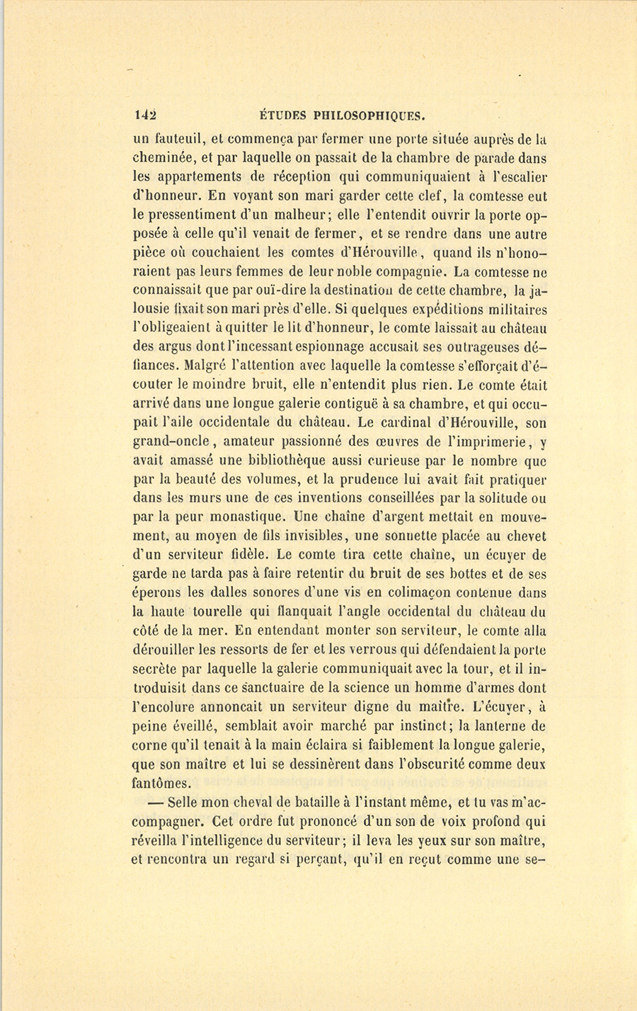 L’air sombre qui accompagnait ces paroles glaça la comtesse, elle retomba sur le lit en poussant un soupir arraché plutôt par le sentiment de sa destinée que par les angoisses de la crise prochaine. Ce gémissement acheva de prouver au comte la vraisemblance des soupçons qui se réveillaient dans son esprit. En affectant un calme que les accents de sa voix, ses gestes et ses regards démentaient, il se leva précipitamment, s’enveloppa d’une robe qu’il trouva sur {p. 142} un fauteuil, et commença par fermer une porte située auprès de la cheminée, et par laquelle on passait de la chambre de parade dans les appartements de réception qui communiquaient à l’escalier d’honneur. En voyant son mari garder cette clef, la comtesse eut le pressentiment d’un malheur ; elle l’entendit ouvrir la porte opposée à celle qu’il venait de fermer, et se rendre dans une autre pièce où couchaient les comtes d’Hérouville, quand ils n’honoraient pas leurs femmes de leur noble compagnie. La comtesse ne connaissait que par ouï-dire la destination de cette chambre, la jalousie fixait son mari près d’elle. Si quelques expéditions militaires l’obligeaient à quitter le lit d’honneur, le comte laissait au château des argus dont l’incessant espionnage accusait ses outrageuses défiances. Malgré l’attention avec laquelle la comtesse s’efforçait d’écouter le moindre bruit, elle n’entendit plus rien. Le comte était arrivé dans une longue galerie contiguë à sa chambre, et qui occupait l’aile occidentale du château. Le cardinal d’Hérouville, son grand-oncle, amateur passionné des œuvres de l’imprimerie, y avait amassé une bibliothèque aussi curieuse par le nombre que par la beauté des volumes, et la prudence lui avait fait pratiquer dans les murs une de ces inventions conseillées par la solitude ou par la peur monastique. Une chaîne d’argent mettait en mouvement, au moyen de fils invisibles, une sonnette placée au chevet d’un serviteur fidèle. Le comte tira cette chaîne, un écuyer de garde ne tarda pas à faire retentir du bruit de ses bottes et de ses éperons les dalles sonores d’une vis en colimaçon contenue dans la haute tourelle qui flanquait l’angle occidental du château du côté de la mer. En entendant monter son serviteur, le comte alla dérouiller les ressorts de fer et les verrous qui défendaient la porte secrète par laquelle la galerie communiquait avec la tour, et il introduisit dans ce sanctuaire de la science un homme d’armes dont l’encolure annonçait un serviteur digne du maître. L’écuyer, à peine éveillé, semblait avoir marché par instinct ; la lanterne de corne qu’il tenait à la main éclaira si faiblement la longue galerie, que son maître et lui se dessinèrent dans l’obscurité comme deux fantômes.