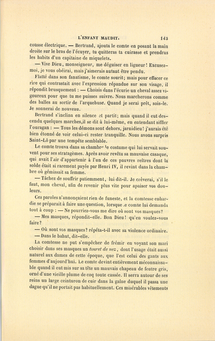 La comtesse ne put s’empêcher de frémir en voyant son mari choisir dans ses masques un touret de nez, dont l’usage était aussi naturel aux dames de cette époque, que l’est celui des gants aux femmes d’aujourd’hui. Le comte devint entièrement méconnaissable quand il eut mis sur sa tête un mauvais chapeau de feutre gris, orné d’une vieille plume de coq toute cassée. Il serra autour de ses reins un large ceinturon de cuir dans la gaîne duquel il passa une dague qu’il ne portait pas habituellement. Ces misérables vêtements {p. 144} lui donnèrent un aspect si effrayant, et il s’avança vers le lit par un mouvement si étrange, que la comtesse crut sa dernière heure arrivée.