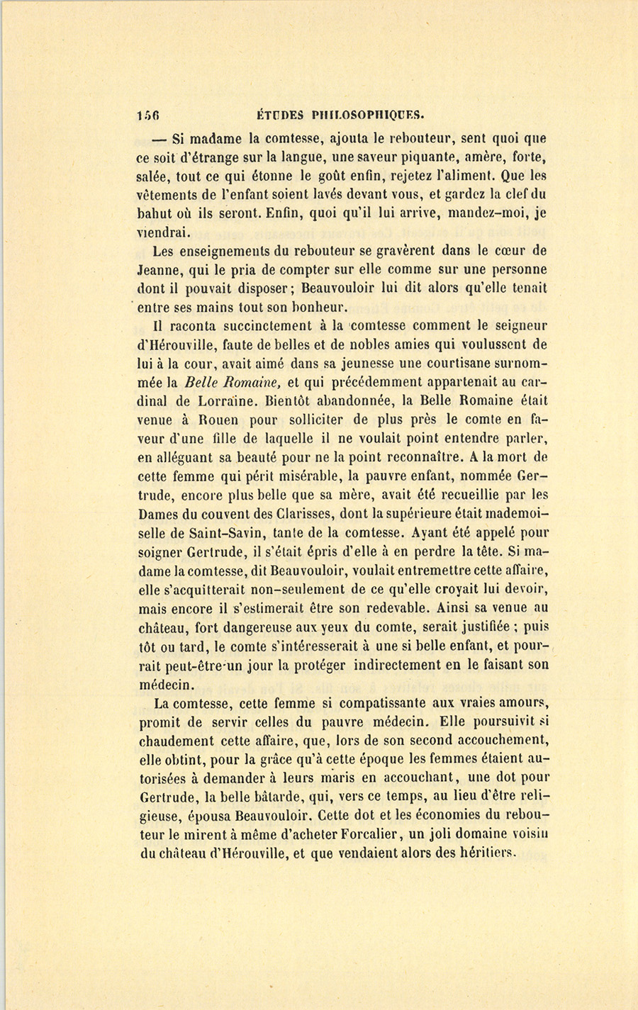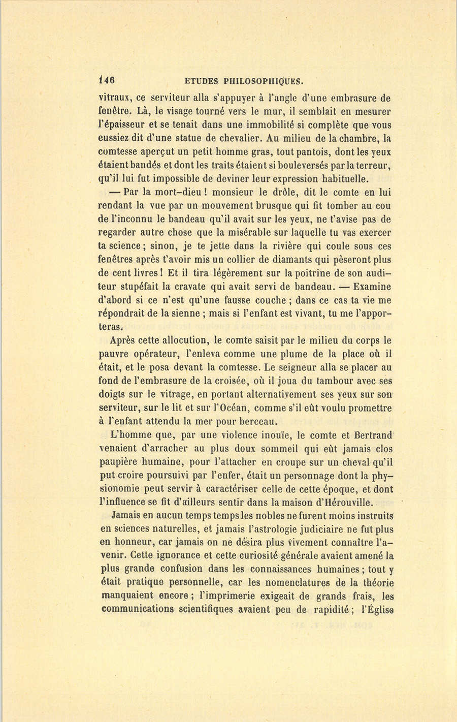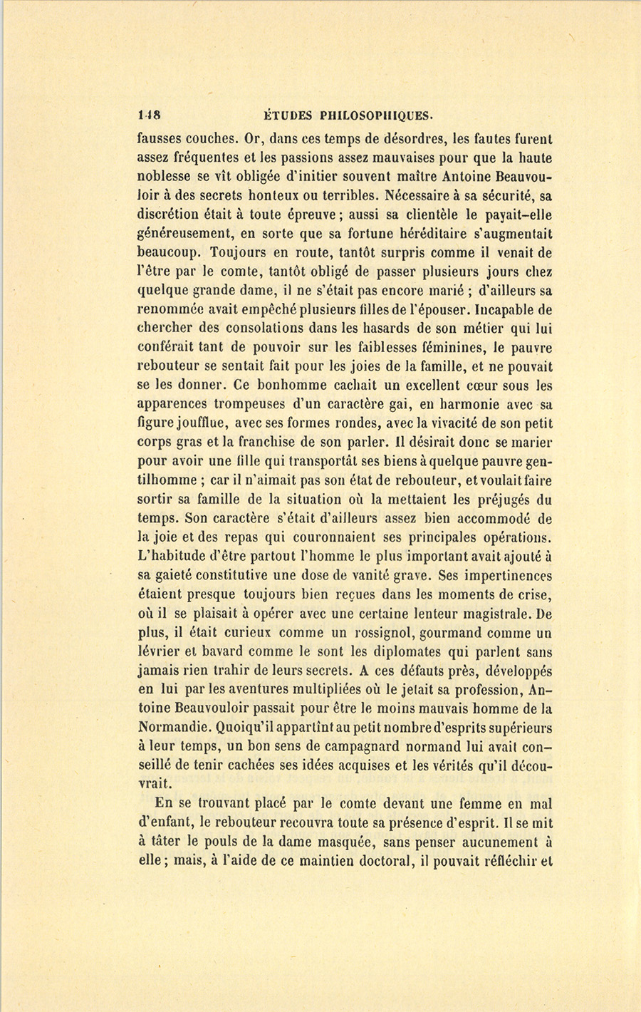 Sans être précisément un de ces fameux mathématiciens, l’homme enlevé par le comte jouissait en Normandie de la réputation équivoque attachée à un médecin chargé d’œuvres ténébreuses. Cet homme était l’espèce de sorcier que les paysans nomment encore, dans plusieurs endroits de la France, un Rebouteur. Ce nom appartenait à quelques génies bruts qui, sans étude apparente, mais par des connaissances héréditaires et souvent par l’effet d’une longue pratique dont les observations s’accumulaient dans une famille, reboutaient, c’est-à-dire remettaient les jambes et les bras cassés, guérissaient bêtes et gens de certaines maladies, et possédaient des secrets prétendus merveilleux pour le traitement des cas graves. Non-seulement maître Antoine Beauvouloir, tel était le nom du rebouteur, avait eu pour aïeul et pour père deux fameux praticiens desquels il tenait d’importantes traditions, mais encore il était instruit en médecine ; il s’occupait de sciences naturelles. Les gens de la campagne voyaient son cabinet plein de livres et de choses étranges qui donnaient à ses succès une teinte de magie. Sans passer précisément pour sorcier, Antoine Beauvouloir imprimait, à trente lieues à la ronde, un respect voisin de la terreur aux gens du peuple ; et, chose plus dangereuse pour lui-même, il avait à sa disposition des secrets de vie et de mort qui concernaient les familles nobles du pays. Comme son grand-père et son père, il était célèbre par son habileté dans les accouchements, avortements et {p. 148} fausses couches. Or, dans ces temps de désordres, les fautes furent assez fréquentes et les passions assez mauvaises pour que la haute noblesse se vît obligée d’initier souvent maître Antoine Beauvouloir à des secrets honteux ou terribles. Nécessaire à sa sécurité, sa discrétion était à toute épreuve ; aussi sa clientèle le payait-elle généreusement, en sorte que sa fortune héréditaire s’augmentait beaucoup. Toujours en route, tantôt surpris comme il venait de l’être par le comte, tantôt obligé de passer plusieurs jours chez quelque grande dame, il ne s’était pas encore marié ; d’ailleurs sa renommée avait empêché plusieurs filles de l’épouser. Incapable de chercher des consolations dans les hasards de son métier qui lui conférait tant de pouvoir sur les faiblesses féminines, le pauvre rebouteur se sentait fait pour les joies de la famille, et ne pouvait se les donner. Ce bonhomme cachait un excellent cœur sous les apparences trompeuses d’un caractère gai, en harmonie avec sa figure joufflue, avec ses formes rondes, avec la vivacité de son petit corps gras et la franchise de son parler. Il désirait donc se marier pour avoir une fille qui transportât ses biens à quelque pauvre gentilhomme ; car il n’aimait pas son état de rebouteur, et voulait faire sortir sa famille de la situation où la mettaient les préjugés du temps. Son caractère s’était d’ailleurs assez bien accommodé de la joie et des repas qui couronnaient ses principales opérations. L’habitude d’être partout l’homme le plus important avait ajouté à sa gaieté constitutive une dose de vanité grave. Ses impertinences étaient presque toujours bien reçues dans les moments de crise, où il se plaisait à opérer avec une certaine lenteur magistrale. De plus, il était curieux comme un rossignol, gourmand comme un lévrier et bavard comme le sont les diplomates qui parlent sans jamais rien trahir de leurs secrets. À ces défauts près, développés en lui par les aventures multipliées où le jetait sa profession, Antoine Beauvouloir passait pour être le moins mauvais homme de la Normandie. Quoiqu’il appartînt au petit nombre d’esprits supérieurs à leur temps, un bon sens de campagnard normand lui avait conseillé de tenir cachées ses idées acquises et les vérités qu’il découvrait.