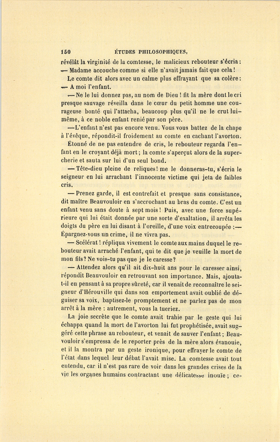 – Prenez garde, il est contrefait et presque sans consistance, dit maître Beauvouloir en s’accrochant au bras du comte. C’est un enfant venu sans doute à sept mois ! Puis, avec une force supérieure qui lui était donnée par une sorte d’exaltation, il arrêta les doigts du père en lui disant à l’oreille, d’une voix entrecoupée : – Épargnez-vous un crime, il ne vivra pas.