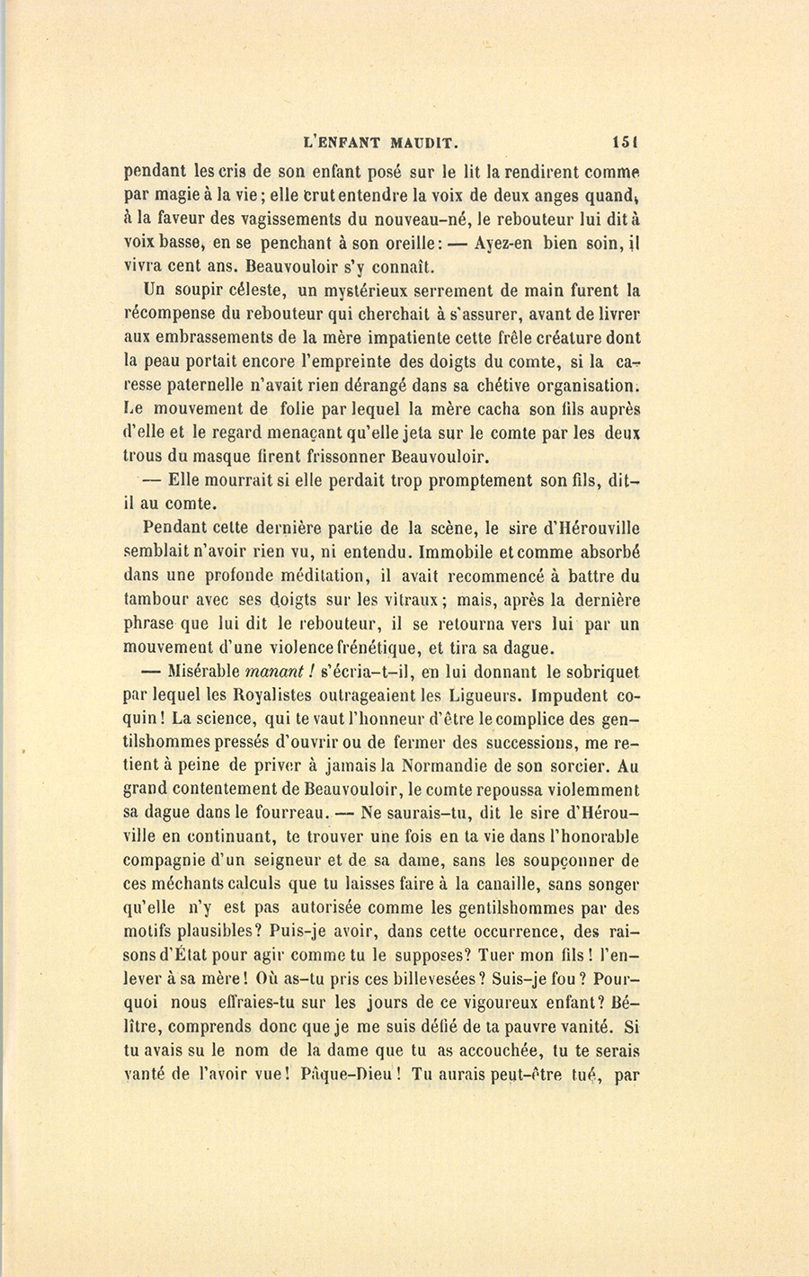 – Misérable manant ! s’écria-t-il, en lui donnant le sobriquet par lequel les Royalistes outrageaient les Ligueurs. Impudent coquin ! La science, qui te vaut l’honneur d’être le complice des gentilshommes pressés d’ouvrir ou de fermer des successions, me retient à peine de priver à jamais la Normandie de son sorcier. Au grand contentement de Beauvouloir, le comte repoussa violemment sa dague dans le fourreau. – Ne saurais-tu, dit le sire d’Hérouville en continuant, te trouver une fois en ta vie dans l’honorable compagnie d’un seigneur et de sa dame, sans les soupçonner de ces méchants calculs que tu laisses faire à la canaille, sans songer qu’elle n’y est pas autorisée comme les gentilshommes par des motifs plausibles ? Puis-je avoir, dans cette occurrence, des raisons d’État pour agir comme tu le supposes ? Tuer mon fils ! l’enlever à sa mère ! Où as-tu pris ces billevesées ? Suis-je fou ? Pourquoi nous effraies-tu sur les jours de ce vigoureux enfant ? Bélître, comprends donc que je me suis défié de ta pauvre vanité. Si tu avais su le nom de la dame que tu as accouchée, tu te serais vanté de l’avoir vue ! Pâque-Dieu ! Tu aurais peut-être tué, par {p. 152} trop de précaution, la mère ou l’enfant. Mais, songes-y bien, ta misérable vie me répond et de ta discrétion et de leur bonne santé !