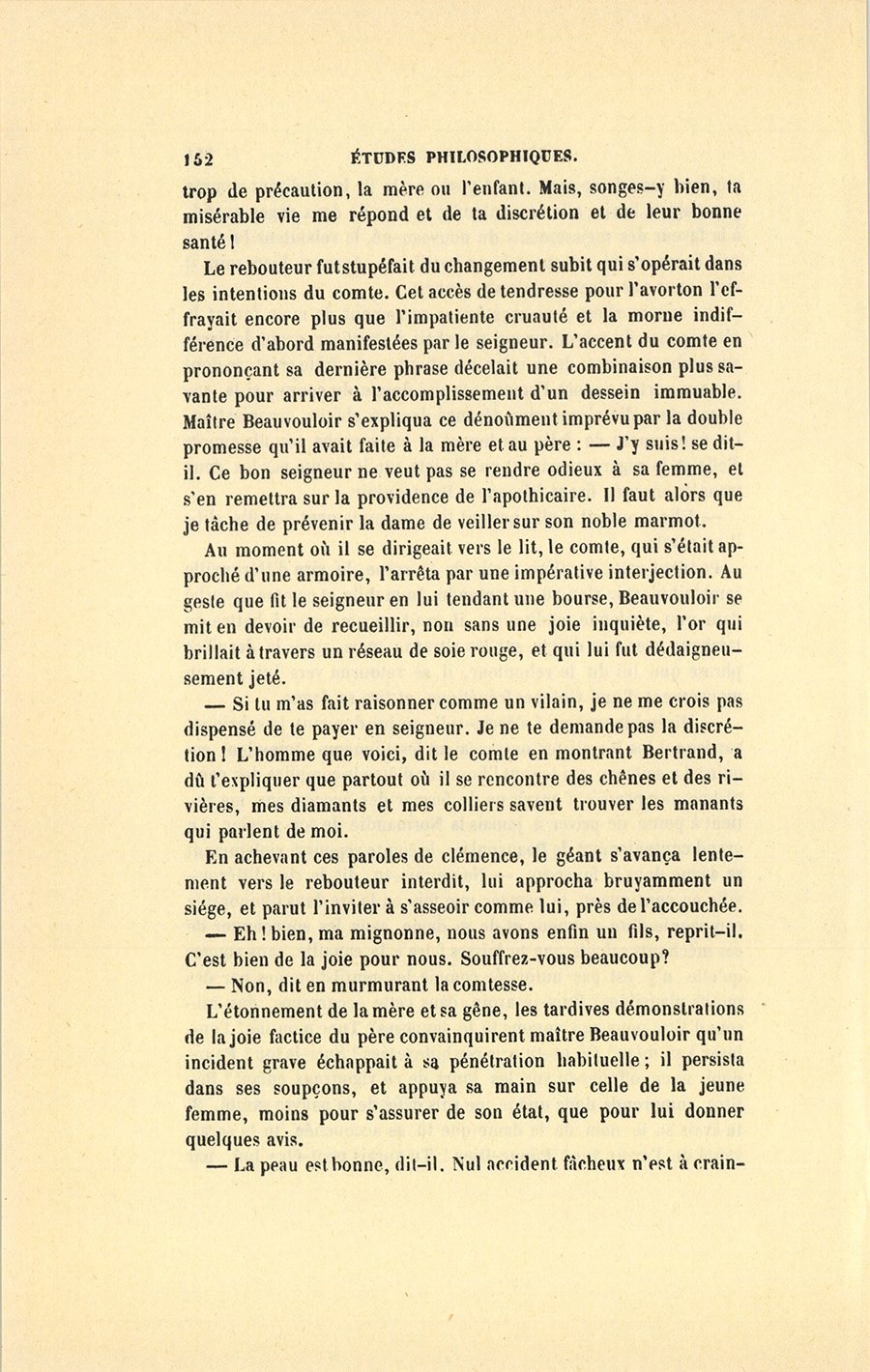 La joie secrète que le comte avait trahie par le geste qui lui échappa quand la mort de l’avorton lui fut prophétisée, avait suggéré cette phrase au rebouteur, et venait de sauver l’enfant ; Beauvouloir s’empressa de le reporter près de la mère alors évanouie, et il la montra par un geste ironique, pour effrayer le comte de l’état dans lequel leur débat l’avait mise. La comtesse avait tout entendu, car il n’est pas rare de voir dans les grandes crises de la vie les organes humains contractant une délicatesse inouïe ; {p. 151} cependant les cris de son enfant posé sur le lit la rendirent comme par magie à la vie ; elle crut entendre la voix de deux anges quand, à la faveur des vagissements du nouveau-né, le rebouteur lui dit à voix basse, en se penchant à son oreille : – Ayez-en bien soin, il vivra cent ans. Beauvouloir s’y connaît.