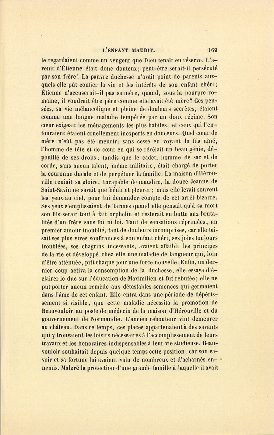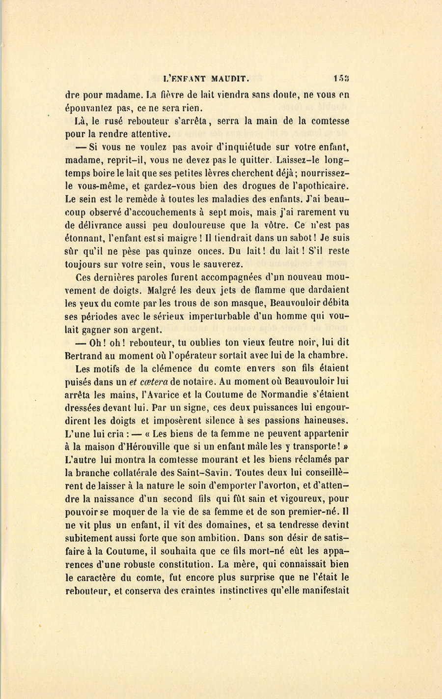 Pour la sûreté de maître Beauvouloir, la nature se montra clémente. Ce fut plutôt un avortement qu’un accouchement, tant l’enfant qui vint était chétif ; aussi causa-t-il peu de douleurs à sa mère.