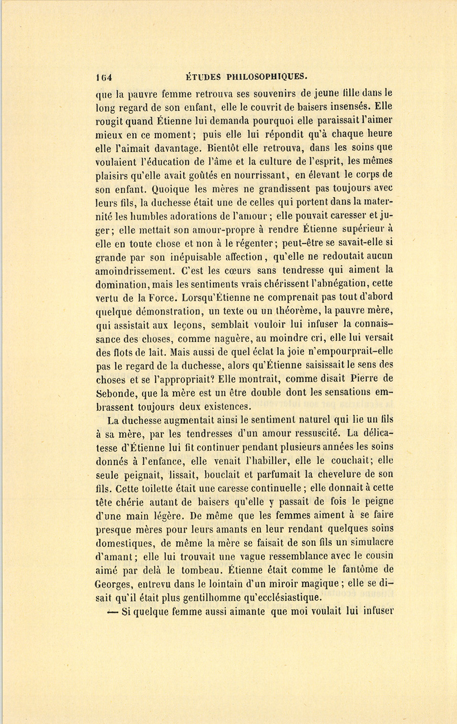 Étienne fit venir de la lumière, et se mit à sa table pour écrire à son père. D’un côté de sa chaise était Gabrielle agenouillée, silencieuse, regardant l’écriture sans la lire, elle lisait tout sur le front d’Étienne. De l’autre côté se tenait le vieux Beauvouloir dont la figure joviale était profondément triste, triste comme cette chambre où mourut la mère d’Étienne. Une voix secrète criait au médecin : – Il aura la destinée de sa mère !