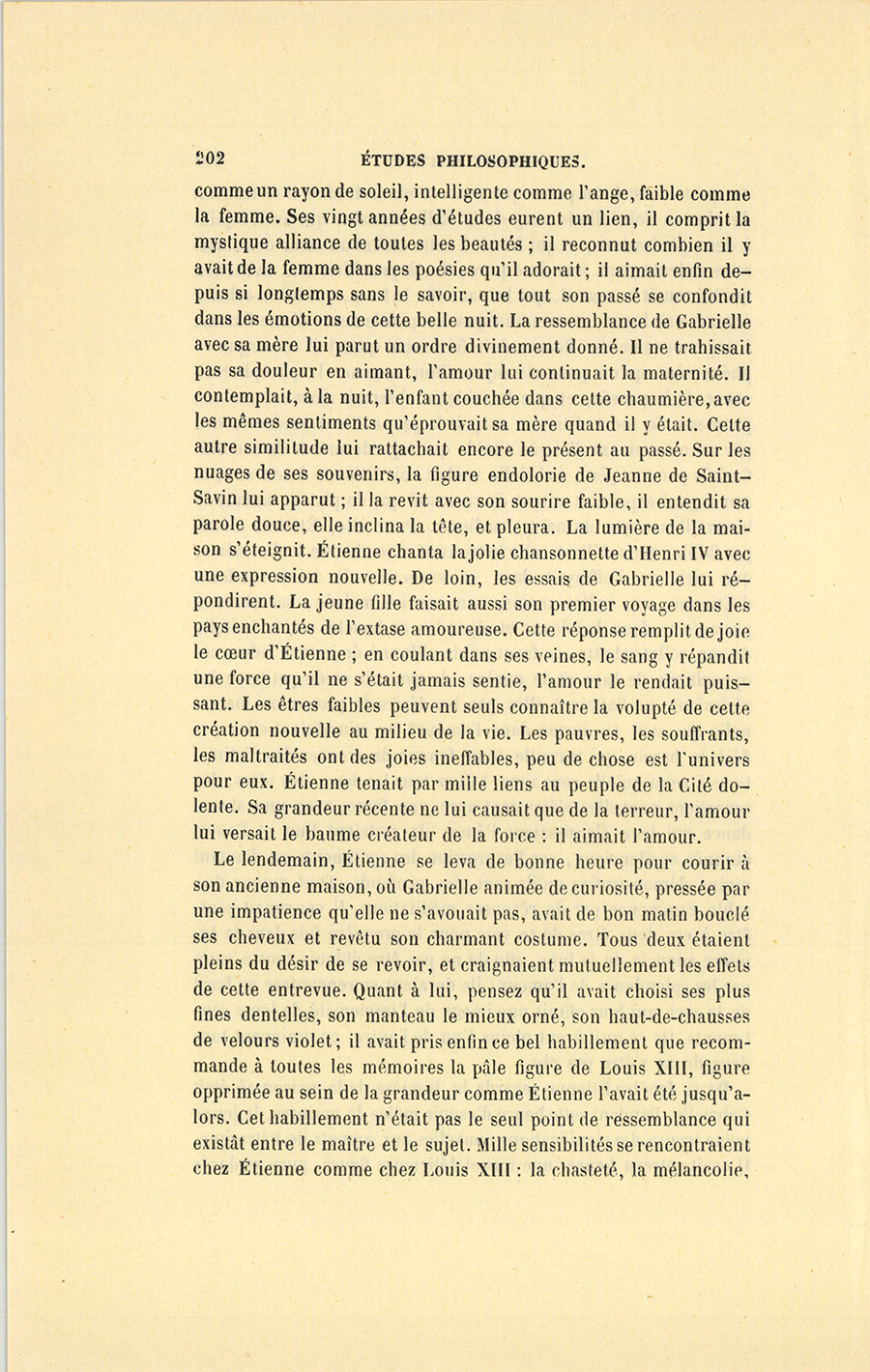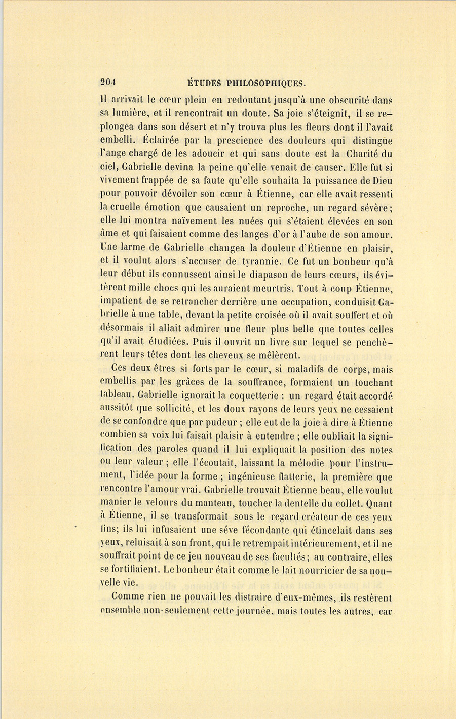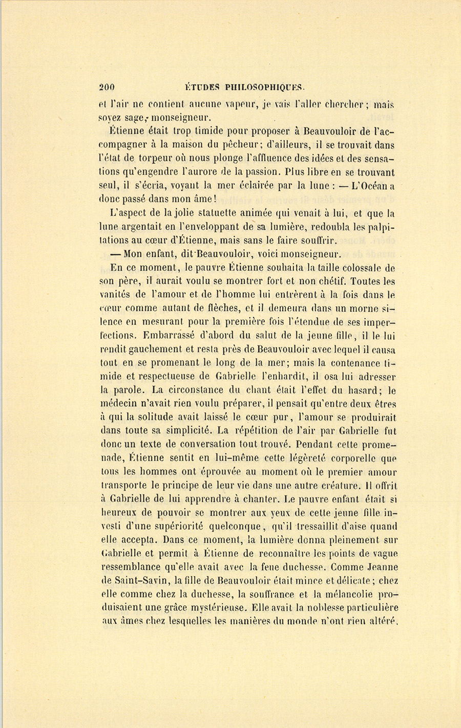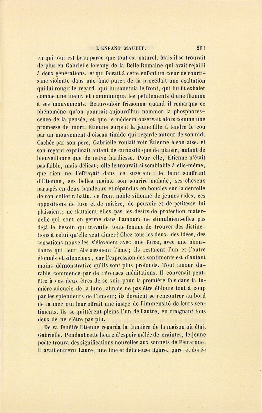 S’il fallait compter les jours, ce temps prit cinq mois ; s’il fallait compter les innombrables sensations, les pensées, les rêves, les regards, les fleurs écloses, les espérances réalisées, les joies sans fin, une chevelure dénouée et vétilleusement éparpillée, puis remise et ornée de fleurs, les discours interrompus, renoués, abandonnés, les rires folâtres, les pieds trempés dans la mer, les chasses enfantines faites à des coquillages cachés dans les rochers, les baisers, les surprises, les étreintes, mettez toute une vie, la mort se chargera de justifier le mot. Il est des existences toujours sombres, accomplies sous des cieux gris ; mais supposez un beau jour où le soleil enflamme un air bleu, tel fut le mai de leur tendresse pendant lequel Étienne avait suspendu toutes ses douleurs passées au cœur de Gabrielle, et la jeune fille avait rattaché ses joies à venir à celui de son seigneur. Étienne n’avait eu qu’une douleur dans sa {p. 208} vie, la mort de sa mère ; il ne devait y avoir qu’un seul amour, Gabrielle.