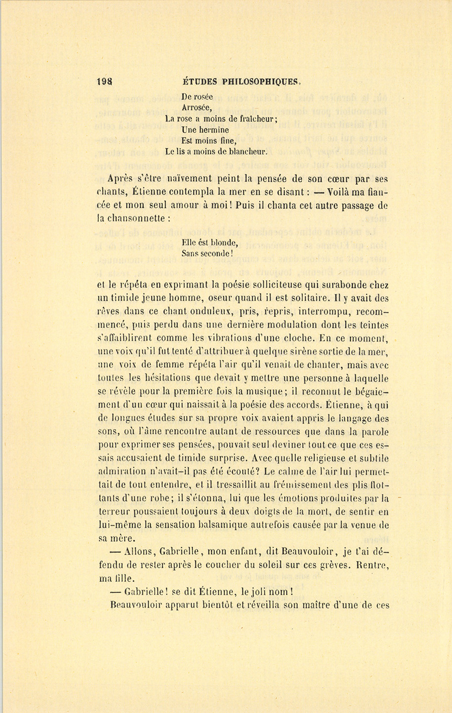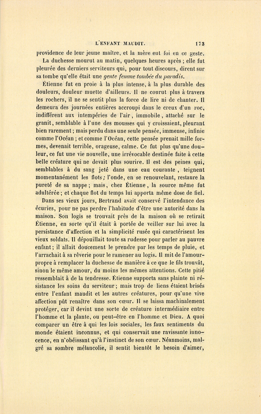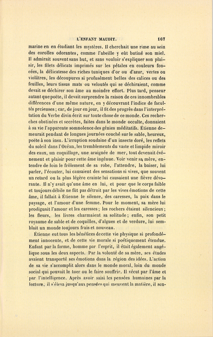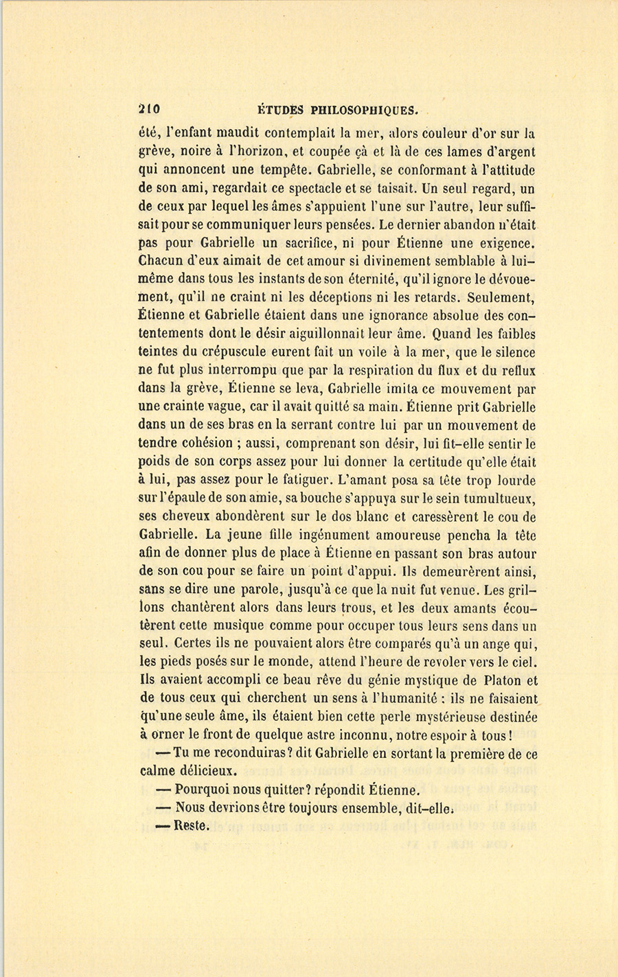 S’il fallait compter les jours, ce temps prit cinq mois ; s’il fallait compter les innombrables sensations, les pensées, les rêves, les regards, les fleurs écloses, les espérances réalisées, les joies sans fin, une chevelure dénouée et vétilleusement éparpillée, puis remise et ornée de fleurs, les discours interrompus, renoués, abandonnés, les rires folâtres, les pieds trempés dans la mer, les chasses enfantines faites à des coquillages cachés dans les rochers, les baisers, les surprises, les étreintes, mettez toute une vie, la mort se chargera de justifier le mot. Il est des existences toujours sombres, accomplies sous des cieux gris ; mais supposez un beau jour où le soleil enflamme un air bleu, tel fut le mai de leur tendresse pendant lequel Étienne avait suspendu toutes ses douleurs passées au cœur de Gabrielle, et la jeune fille avait rattaché ses joies à venir à celui de son seigneur. Étienne n’avait eu qu’une douleur dans sa {p. 208} vie, la mort de sa mère ; il ne devait y avoir qu’un seul amour, Gabrielle.