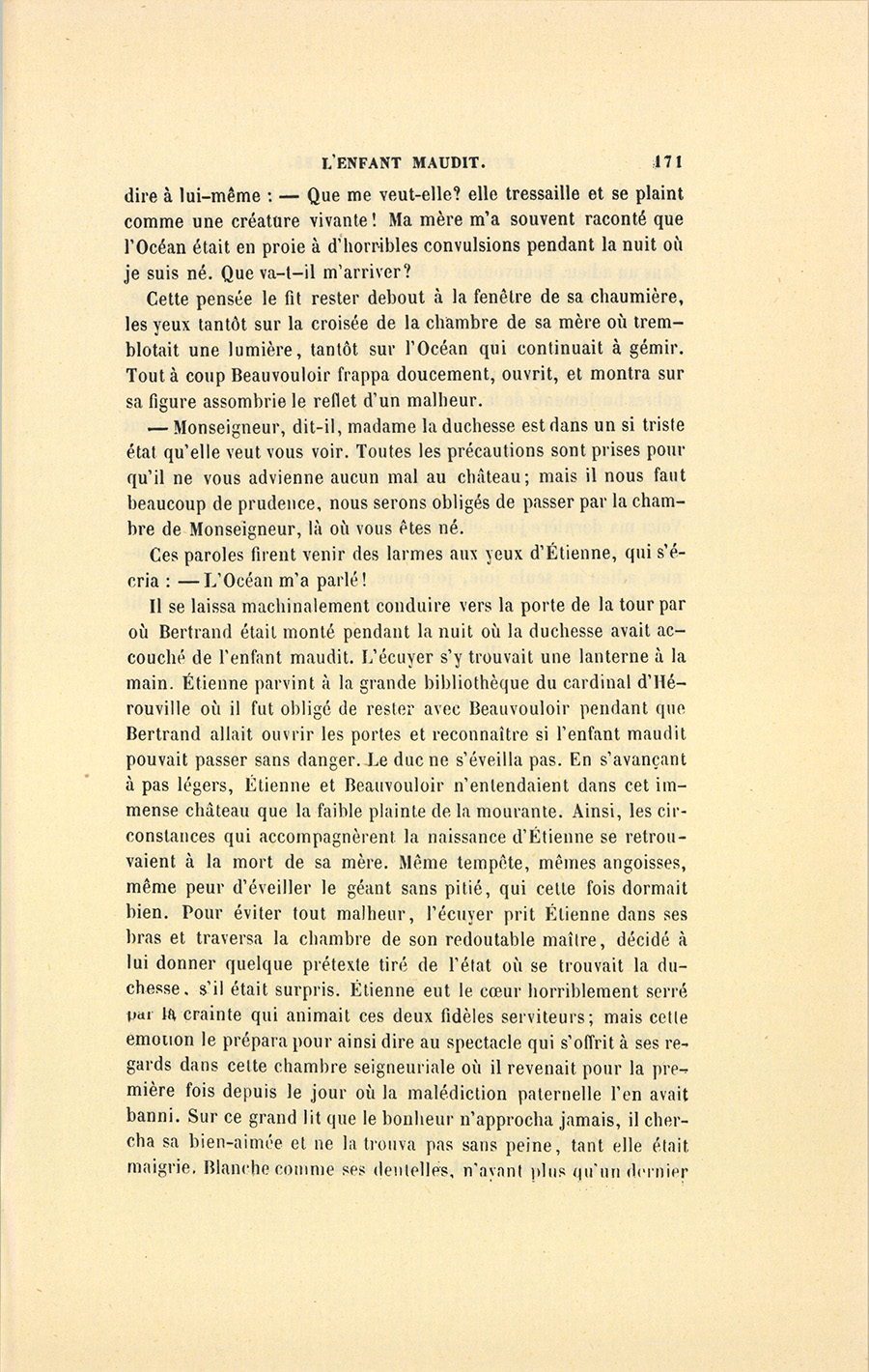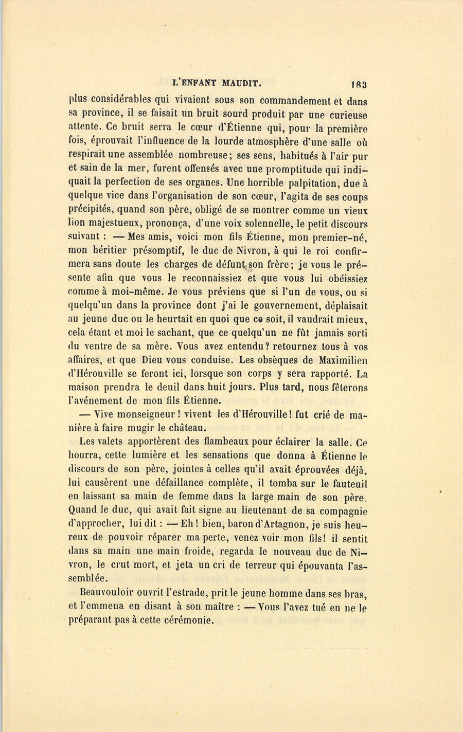 – Attendez alors qu’il ait dix-huit ans pour le caresser ainsi, répondit Beauvouloir en retrouvant son importance. Mais, ajouta-t-il en pensant à sa propre sûreté, car il venait de reconnaître le seigneur d’Hérouville qui dans son emportement avait oublié de déguiser sa voix, baptisez-le promptement et ne parlez pas de mon arrêt à la mère : autrement, vous la tueriez.