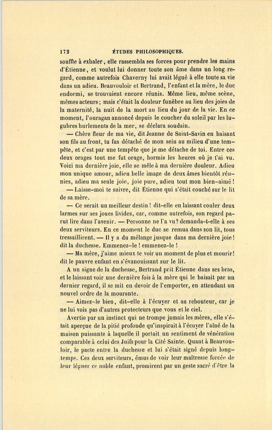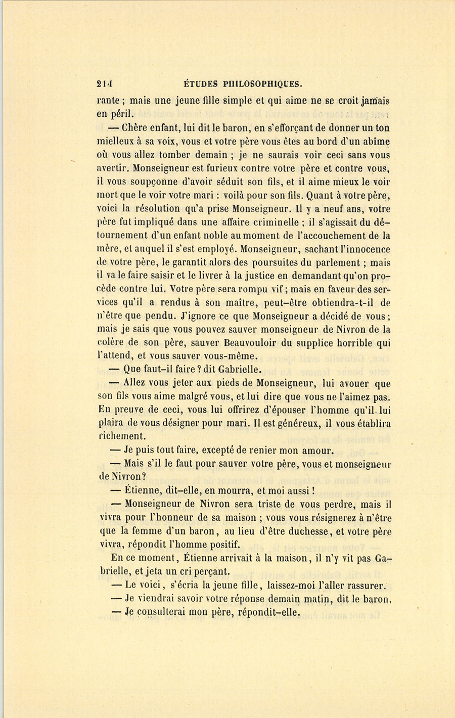 {p. 219} Ces paroles portèrent dans le cœur des deux enfants la terreur dont elles étaient chargées. Au moment où Étienne vit la large main de son père armée d’un fer et levée sur Gabrielle, il mourut, et Gabrielle tomba morte en voulant le retenir.