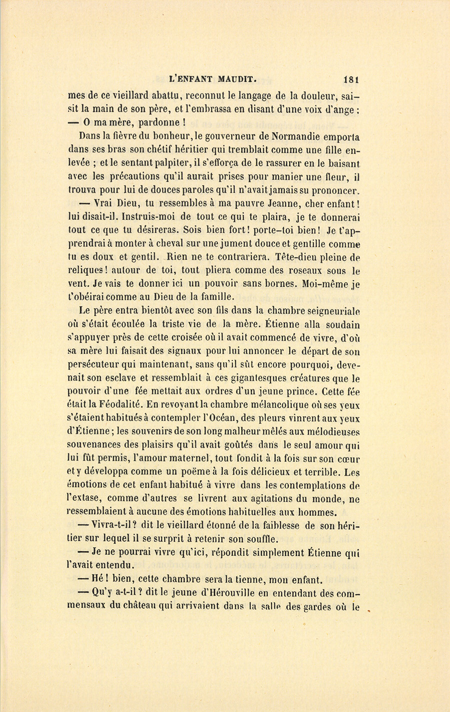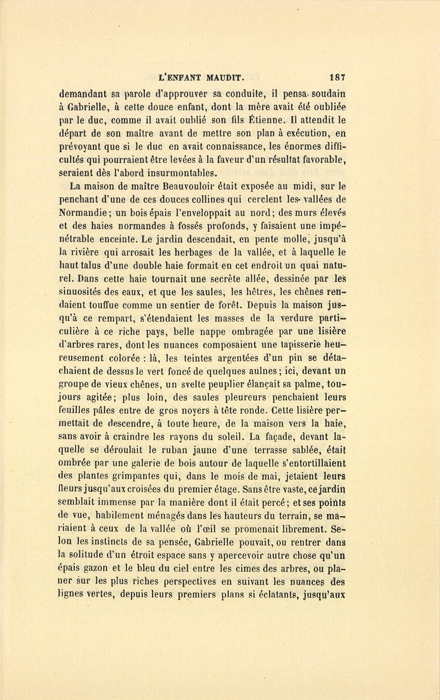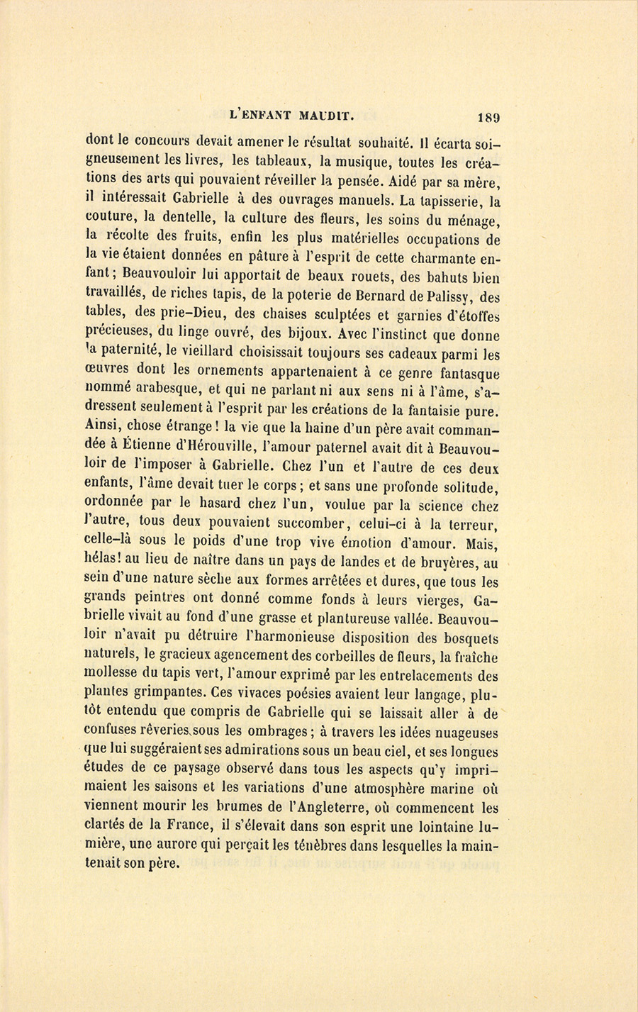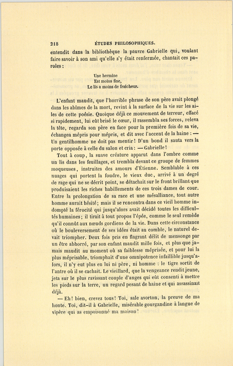 L’enfant maudit, que l’horrible phrase de son père avait plongé dans les abîmes de la mort, revint à la surface de la vie sur les ailes de cette poésie. Quoique déjà ce mouvement de terreur, effacé si rapidement, lui eût brisé le cœur, il rassembla ses forces, releva la tête, regarda son père en face pour la première fois de sa vie, échangea mépris pour mépris, et dit avec l’accent de la haine : – Un gentilhomme ne doit pas mentir ! D’un bond il sauta vers la porte opposée à celle du salon et cria : – Gabrielle !