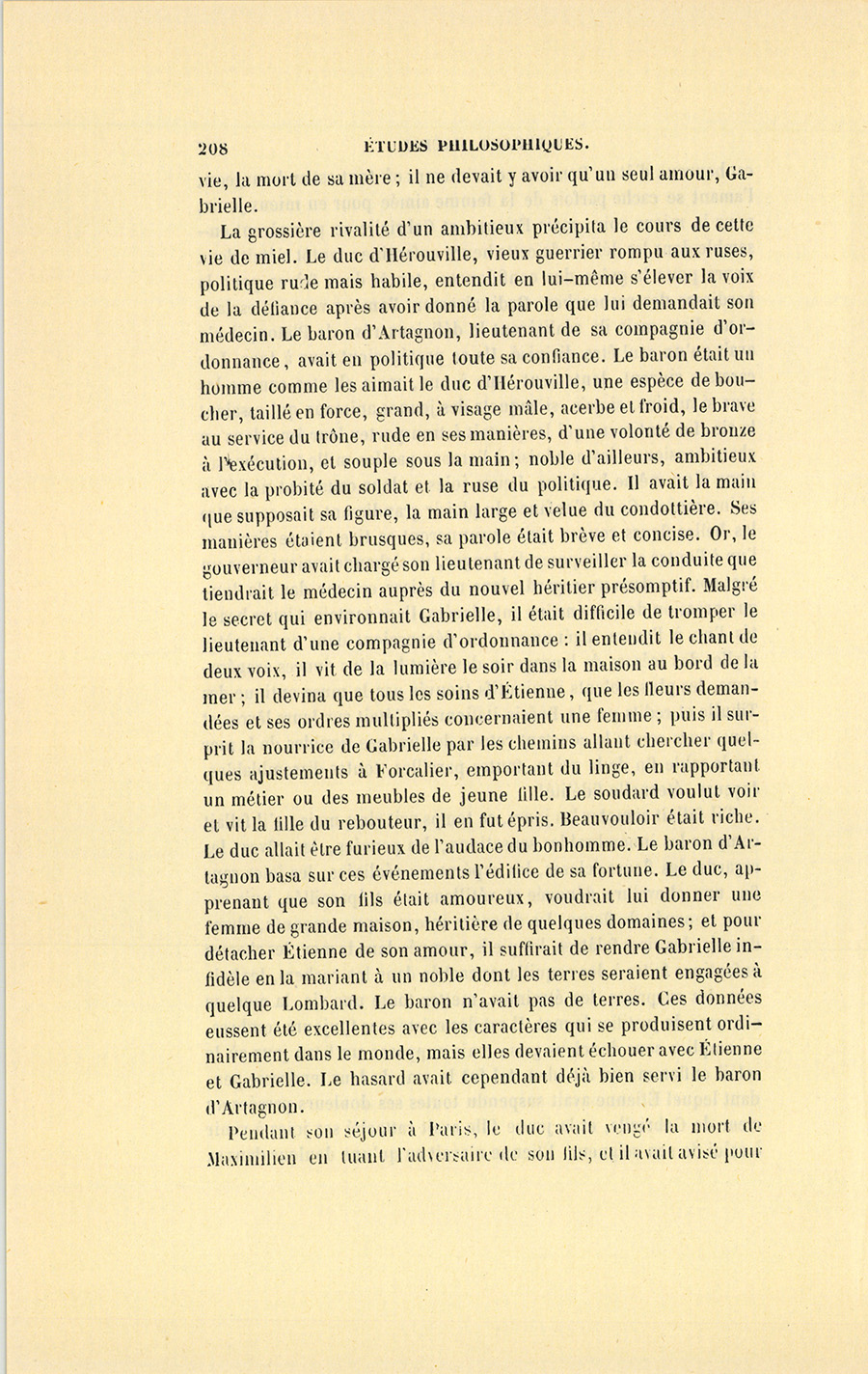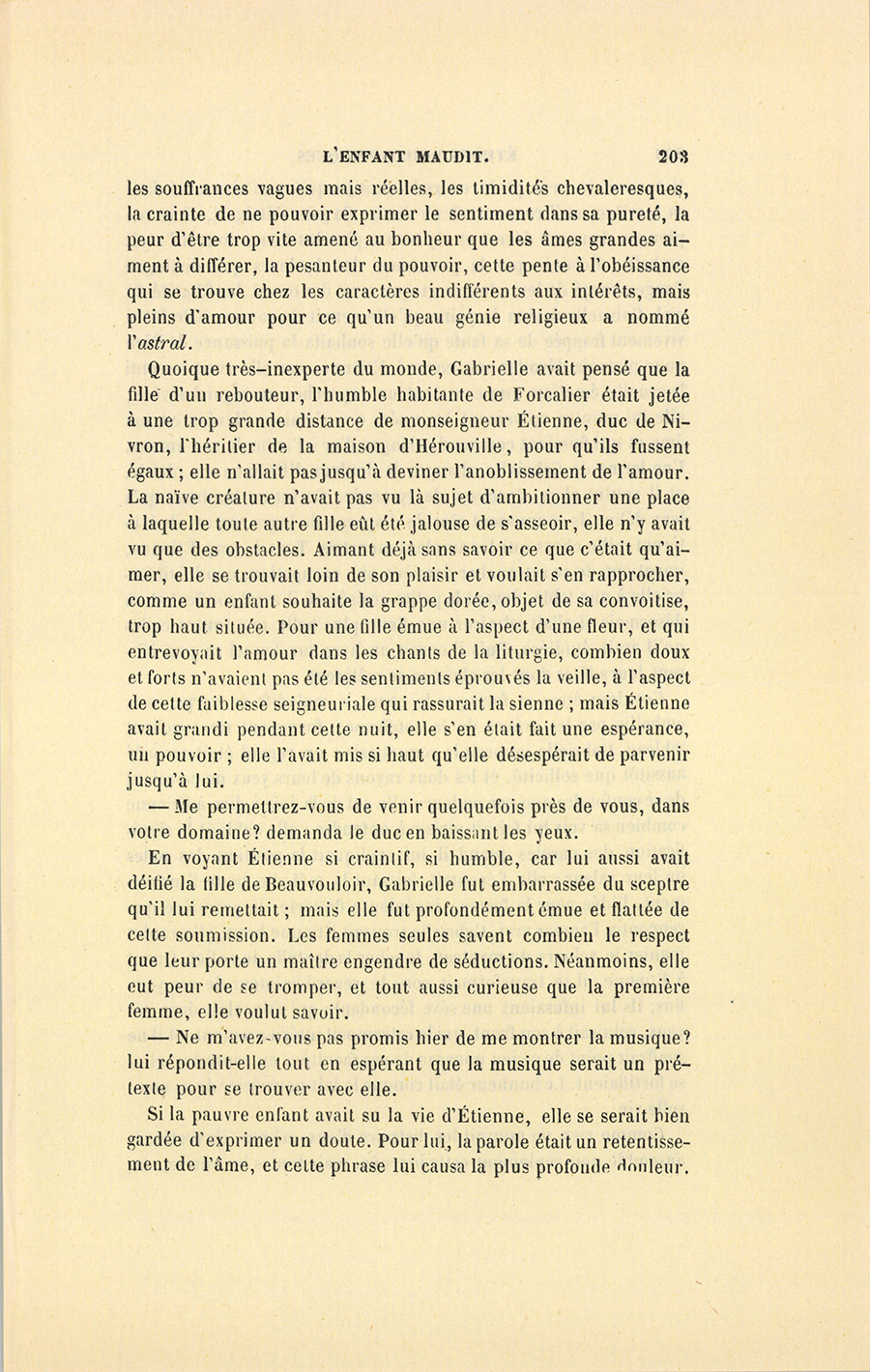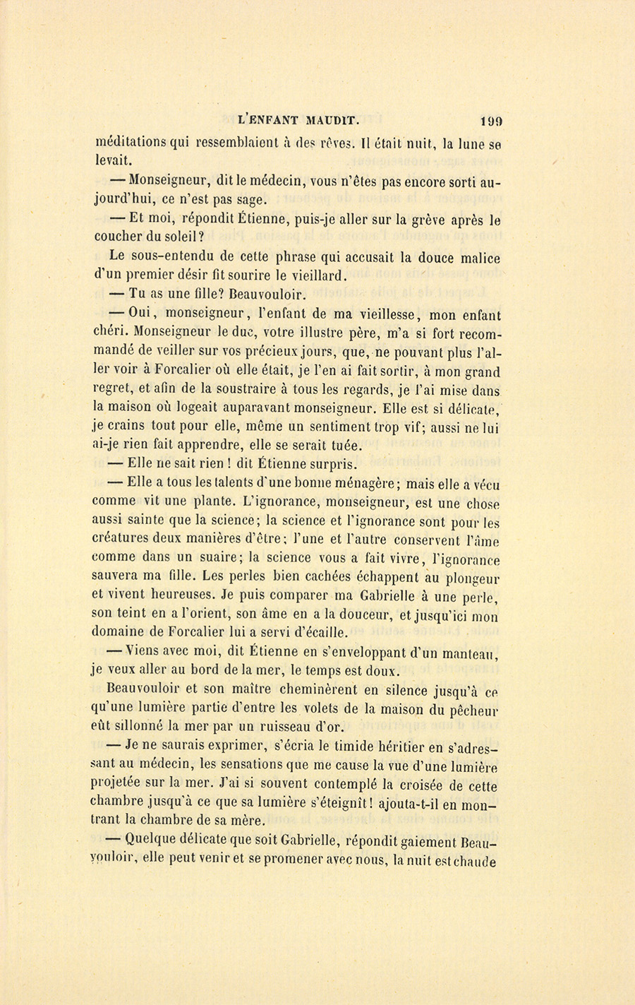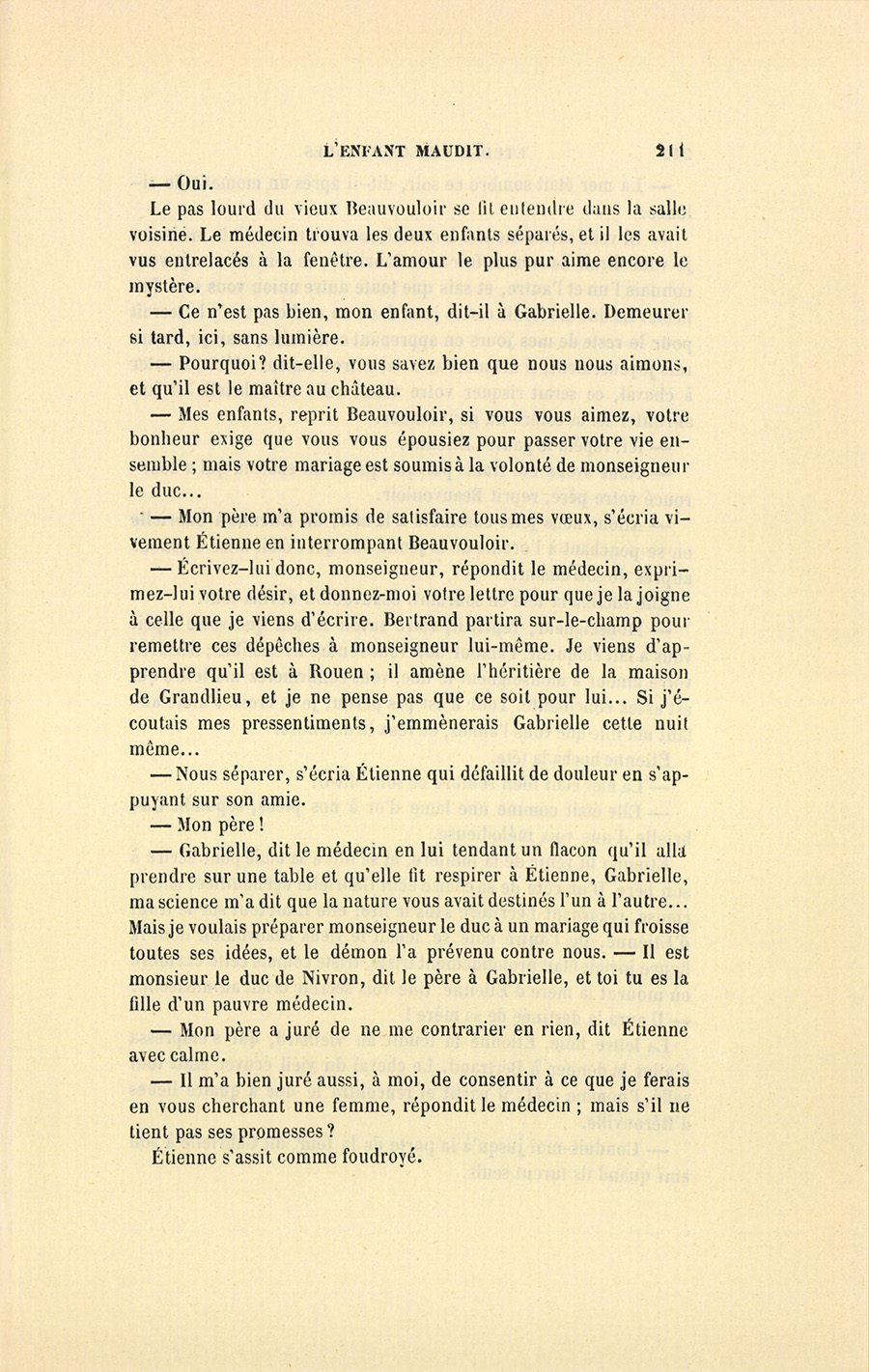 – Gabrielle, dit le médecin en lui tendant un flacon qu’il alla prendre sur une table et qu’elle fit respirer à Étienne, Gabrielle, ma science m’a dit que la nature vous avait destinés l’un à l’autre… Mais je voulais préparer monseigneur le duc à un mariage qui froisse toutes ses idées, et le démon l’a prévenu contre nous. – Il est monsieur le duc de Nivron, dit le père à Gabrielle, et toi tu es la fille d’un pauvre médecin.