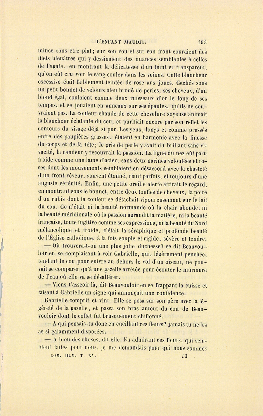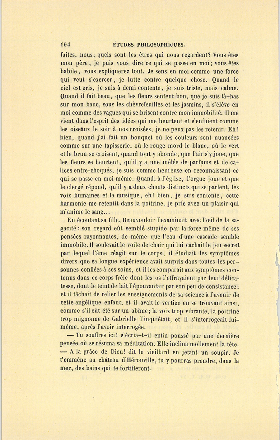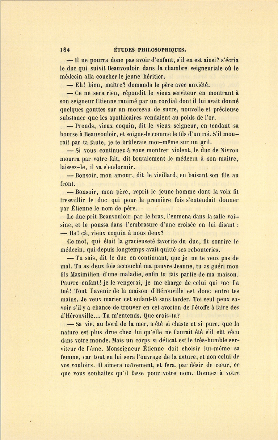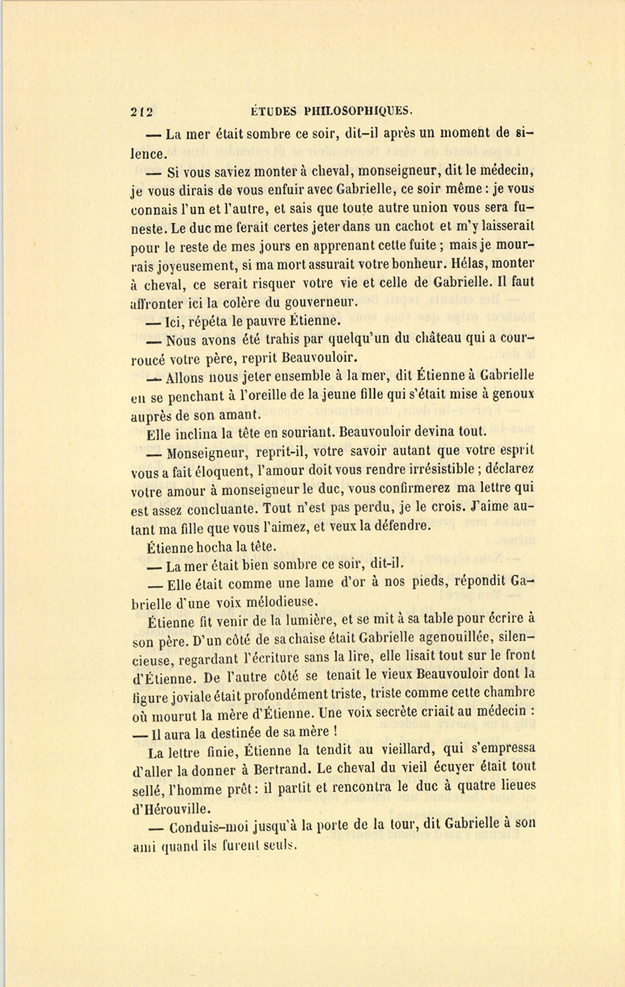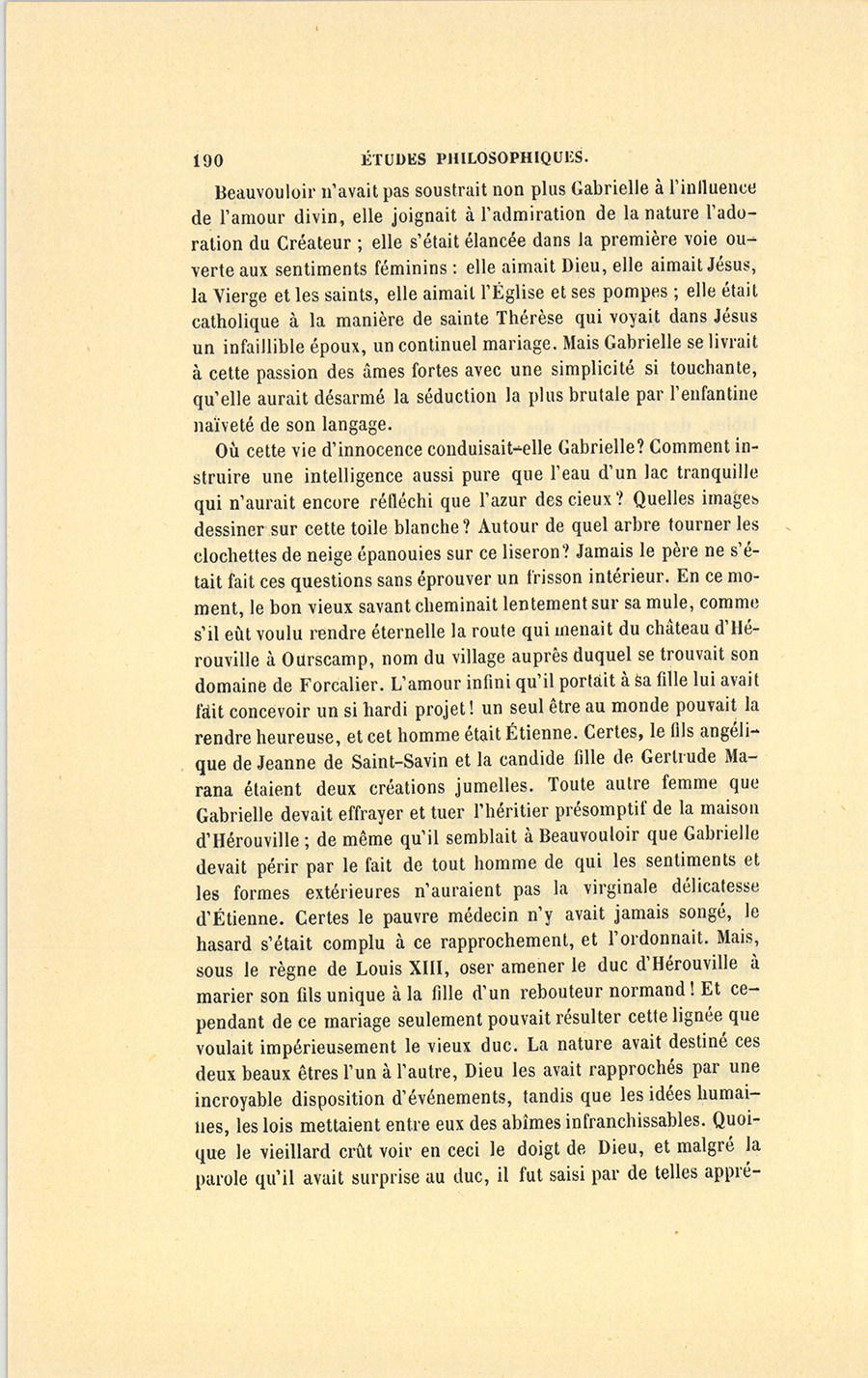 – Gabrielle, dit le médecin en lui tendant un flacon qu’il alla prendre sur une table et qu’elle fit respirer à Étienne, Gabrielle, ma science m’a dit que la nature vous avait destinés l’un à l’autre… Mais je voulais préparer monseigneur le duc à un mariage qui froisse toutes ses idées, et le démon l’a prévenu contre nous. – Il est monsieur le duc de Nivron, dit le père à Gabrielle, et toi tu es la fille d’un pauvre médecin.