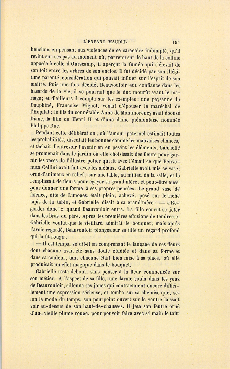 – Si vous saviez monter à cheval, monseigneur, dit le médecin, je vous dirais de vous enfuir avec Gabrielle, ce soir même : je vous connais l’un et l’autre, et sais que toute autre union vous sera funeste. Le duc me ferait certes jeter dans un cachot et m’y laisserait pour le reste de mes jours en apprenant cette fuite ; mais je mourrais joyeusement, si ma mort assurait votre bonheur. Hélas, monter à cheval, ce serait risquer votre vie et celle de Gabrielle. Il faut affronter ici la colère du gouverneur.