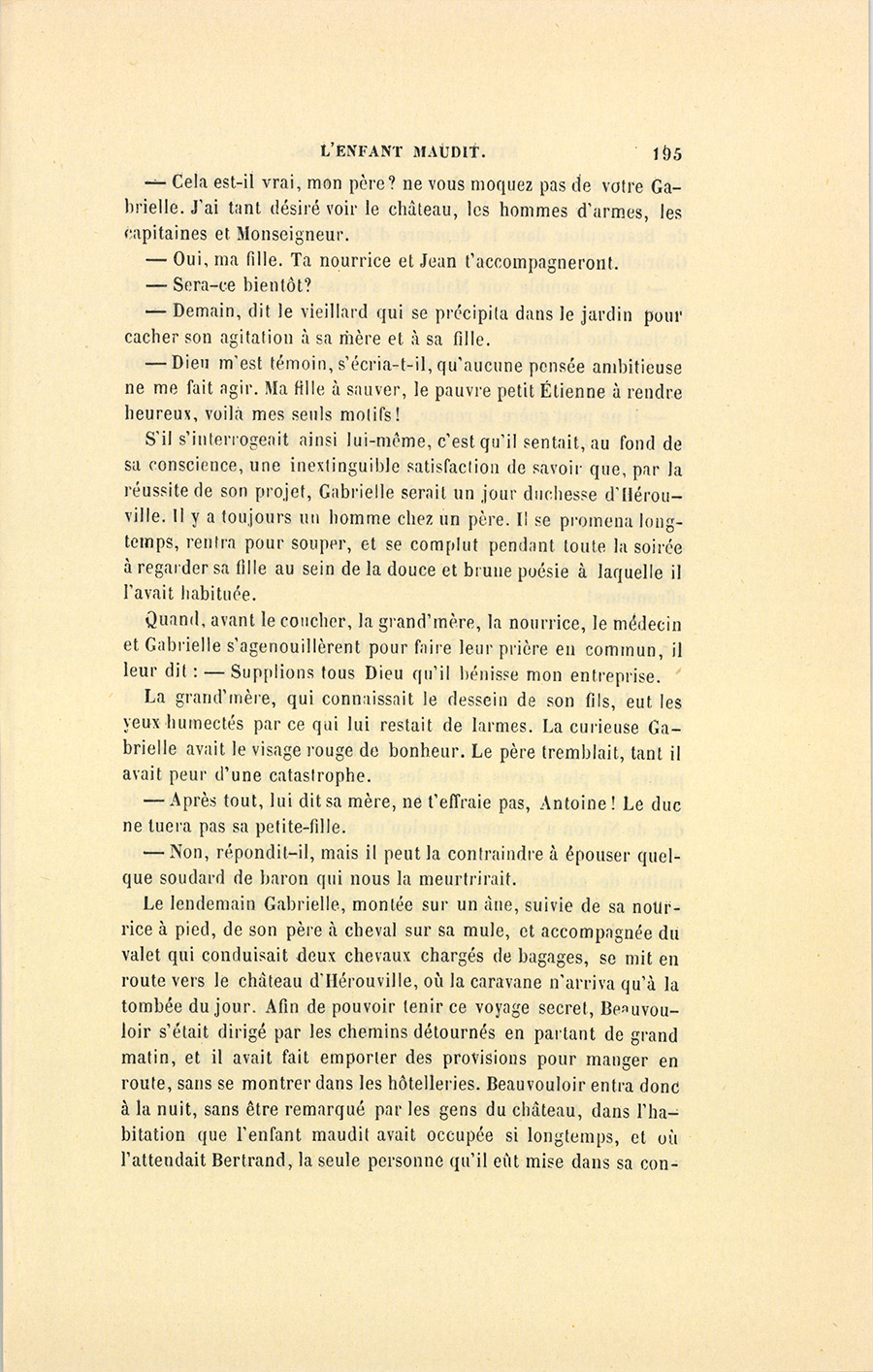 Il la baisa au front et non plus sur les lèvres ; puis il revint au château, résolu d’affronter l’homme terrible qui pesait tant sur sa vie. Il ne savait pas que la maison de Gabrielle allait être gardée par des soldats aussitôt qu’il l’aurait quittée.