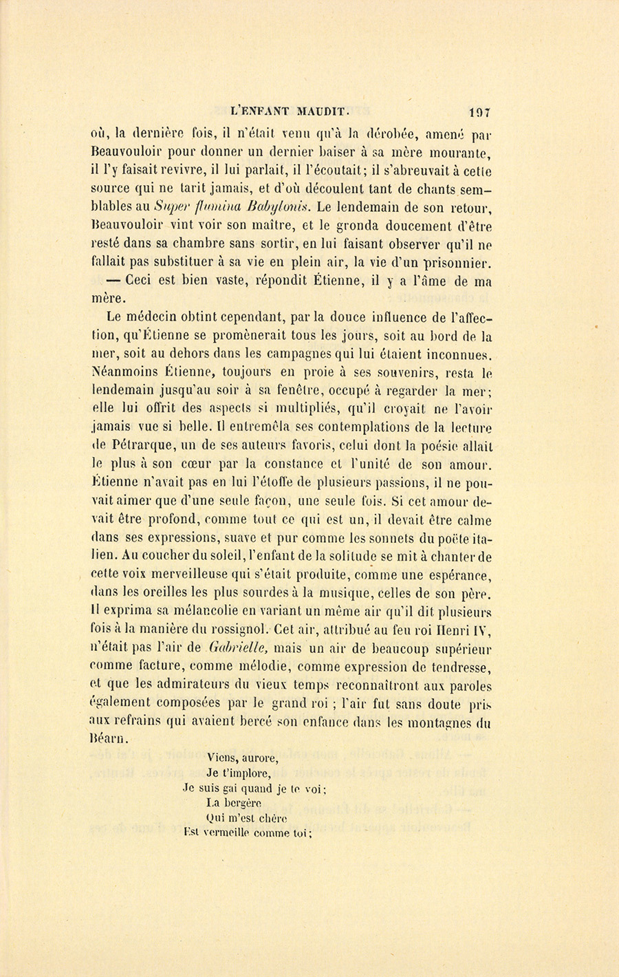 Le vieillard aperçut les trois dames et le baron d’Artagnon. En cet instant suprême, Étienne, dont le sens de l’ouïe était si délicat, {p. 218} entendit dans la bibliothèque la pauvre Gabrielle qui, voulant faire savoir à son ami qu’elle s’y était renfermée, chantait ces paroles :