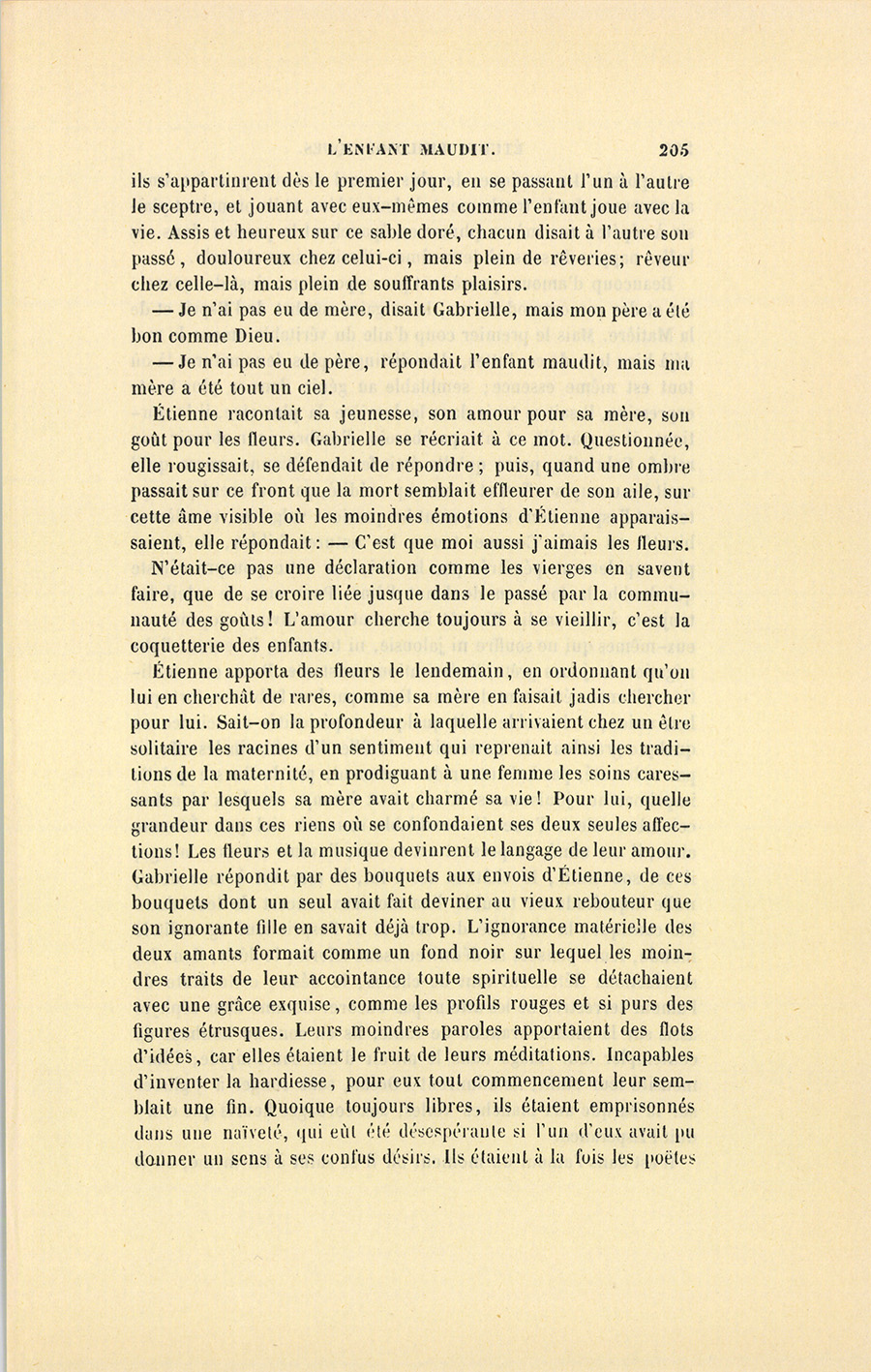 Étienne apporta des fleurs le lendemain, en ordonnant qu’on lui en cherchât de rares, comme sa mère en faisait jadis chercher pour lui. Sait-on la profondeur à laquelle arrivaient chez un être solitaire les racines d’un sentiment qui reprenait ainsi les traditions de la maternité, en prodiguant à une femme les soins caressants par lesquels sa mère avait charmé sa vie ! Pour lui, quelle grandeur dans ces riens où se confondaient ses deux seules affections ! Les fleurs et la musique devinrent le langage de leur amour. Gabrielle répondit par des bouquets aux envois d’Étienne, de ces bouquets dont un seul avait fait deviner au vieux rebouteur que son ignorante fille en savait déjà trop. L’ignorance matérielle des deux amants formait comme un fond noir sur lequel les moindres traits de leur accointance toute spirituelle se détachaient avec une grâce exquise, comme les profils rouges et si purs des figures étrusques. Leurs moindres paroles apportaient des flots d’idées, car elles étaient le fruit de leurs méditations. Incapables d’inventer la hardiesse, pour eux tout commencement leur semblait une fin. Quoique toujours libres, ils étaient emprisonnés dans une naïveté, qui eût été désespérante si l’un d’eux avait pu donner un sens à ses confus désirs. Ils étaient à la fois les poëtes {p. 206} et la poésie. La musique, le plus sensuel des arts pour les âmes amoureuses, fut le truchement de leurs idées, et ils prenaient plaisir à répéter une même phrase en épanchant la passion dans ces belles nappes de sons où leurs âmes vibraient sans obstacle.