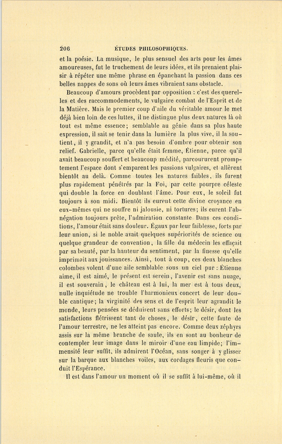 Beaucoup d’amours procèdent par opposition : c’est des querelles et des raccommodements, le vulgaire combat de l’Esprit et de la Matière. Mais le premier coup d’aile du véritable amour le met déjà bien loin de ces luttes, il ne distingue plus deux natures là où tout est même essence ; semblable au génie dans sa plus haute expression, il sait se tenir dans la lumière la plus vive, il la soutient, il y grandit, et n’a pas besoin d’ombre pour obtenir son relief. Gabrielle, parce qu’elle était femme, Étienne, parce qu’il avait beaucoup souffert et beaucoup médité, parcoururent promptement l’espace dont s’emparent les passions vulgaires, et allèrent bientôt au delà. Comme toutes les natures faibles, ils furent plus rapidement pénétrés par la Foi, par cette pourpre céleste qui double la force en doublant l’âme. Pour eux, le soleil fut toujours à son midi. Bientôt ils eurent cette divine croyance en eux-mêmes qui ne souffre ni jalousie, ni tortures ; ils eurent l’abnégation toujours prête, l’admiration constante. Dans ces conditions, l’amour était sans douleur. Égaux par leur faiblesse, forts par leur union, si le noble avait quelques supériorités de science ou quelque grandeur de convention, la fille du médecin les effaçait par sa beauté, par la hauteur du sentiment, par la finesse qu’elle imprimait aux jouissances. Ainsi, tout à coup, ces deux blanches colombes volent d’une aile semblable sous un ciel pur : Étienne aime, il est aimé, le présent est serein, l’avenir est sans nuage, il est souverain, le château est à lui, la mer est à tous deux, nulle inquiétude ne trouble l’harmonieux concert de leur double cantique ; la virginité des sens et de l’esprit leur agrandit le monde, leurs pensées se déduisent sans efforts ; le désir, dont les satisfactions flétrissent tant de choses, le désir, cette faute de l’amour terrestre, ne les atteint pas encore. Comme deux zéphyrs assis sur la même branche de saule, ils en sont au bonheur de contempler leur image dans le miroir d’une eau limpide ; l’immensité leur suffit, ils admirent l’Océan, sans songer à y glisser sur la barque aux blanches voiles, aux cordages fleuris que conduit l’Espérance.