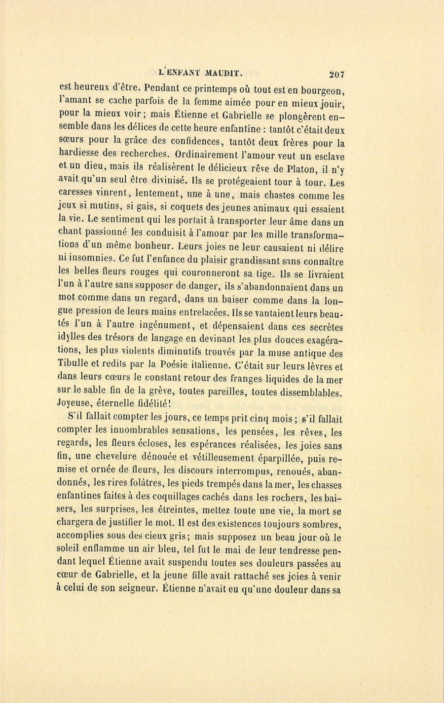 Il est dans l’amour un moment où il se suffit à lui-même, où il {p. 207} est heureux d’être. Pendant ce printemps où tout est en bourgeon, l’amant se cache parfois de la femme aimée pour en mieux jouir, pour la mieux voir ; mais Étienne et Gabrielle se plongèrent ensemble dans les délices de cette heure enfantine : tantôt c’était deux sœurs pour la grâce des confidences, tantôt deux frères pour la hardiesse des recherches. Ordinairement l’amour veut un esclave et un dieu, mais ils réalisèrent le délicieux rêve de Platon, il n’y avait qu’un seul être divinisé. Ils se protégeaient tour à tour. Les caresses vinrent, lentement, une à une, mais chastes comme les jeux si mutins, si gais, si coquets des jeunes animaux qui essaient la vie. Le sentiment qui les portait à transporter leur âme dans un chant passionné les conduisit à l’amour par les mille transformations d’un même bonheur. Leurs joies ne leur causaient ni délire ni insomnies. Ce fut l’enfance du plaisir grandissant sans connaître les belles fleurs rouges qui couronneront sa tige. Ils se livraient l’un à l’autre sans supposer de danger, ils s’abandonnaient dans un mot comme dans un regard, dans un baiser comme dans la longue pression de leurs mains entrelacées. Ils se vantaient leurs beautés l’un à l’autre ingénument, et dépensaient dans ces secrètes idylles des trésors de langage en devinant les plus douces exagérations, les plus violents diminutifs trouvés par la muse antique des Tibulle et redits par la Poésie italienne. C’était sur leurs lèvres et dans leurs cœurs le constant retour des franges liquides de la mer sur le sable fin de la grève, toutes pareilles, toutes dissemblables. Joyeuse, éternelle fidélité !