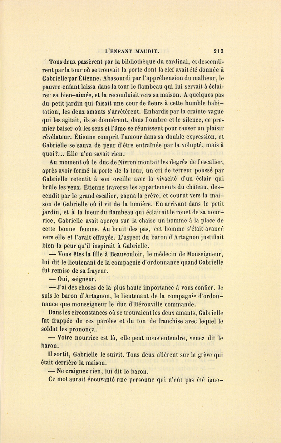 {p. 213} Tous deux passèrent par la bibliothèque du cardinal, et descendirent par la tour où se trouvait la porte dont la clef avait été donnée à Gabrielle par Étienne. Abasourdi par l’appréhension du malheur, le pauvre enfant laissa dans la tour le flambeau qui lui servait à éclairer sa bien-aimée, et la reconduisit vers sa maison. À quelques pas du petit jardin qui faisait une cour de fleurs à cette humble habitation, les deux amants s’arrêtèrent. Enhardis par la crainte vague qui les agitait, ils se donnèrent, dans l’ombre et le silence, ce premier baiser où les sens et l’âme se réunissent pour causer un plaisir révélateur. Étienne comprit l’amour dans sa double expression, et Gabrielle se sauva de peur d’être entraînée par la volupté, mais à quoi ?… Elle n’en savait rien.