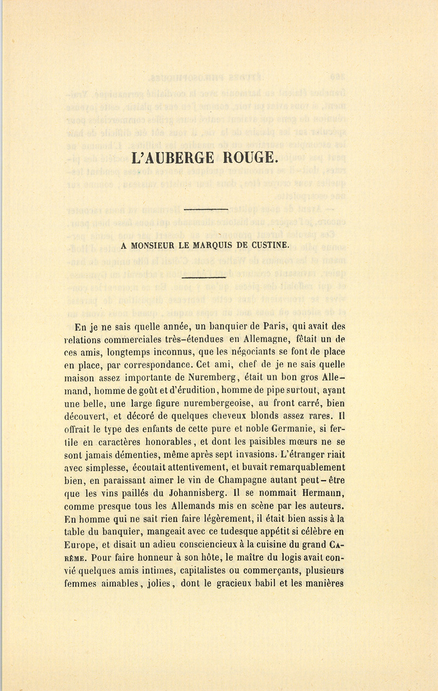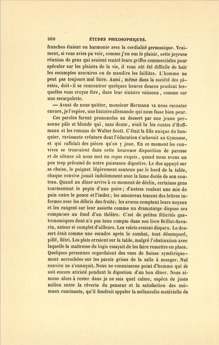 {p. 362} En ce moment, le fournisseur leva les yeux sur moi ; son regard me fit tressaillir, tant il était sombre et pensif ! Assurément ce coup d’œil résumait toute une vie. Mais tout à coup sa physionomie devint gaie ; il prit le bouchon de cristal, le mit, par un mouvement machinal, à une carafe pleine d’eau qui se trouvait devant son assiette, et tourna la tête vers monsieur Hermann en souriant. Cet homme, béatifié par ses jouissances gastronomiques, n’avait sans doute pas deux idées dans la cervelle, et ne songeait à rien. Aussi eus-je en quelque sorte, honte de prodiguer ma science divinatoire in anima vili d’un épais financier. Pendant que je faisais, en pure perte, des observations phrénologiques, le bon Allemand s’était lesté le nez d’une prise de tabac, et commençait son histoire. Il me serait assez difficile de la reproduire dans les mêmes termes, avec ses interruptions fréquentes et ses digressions verbeuses. Aussi l’ai-je écrite à ma guise, laissant les fautes au Nurembergeois, et m’emparant de ce qu’elle peut avoir de poétique et d’intéressant, avec la candeur des écrivains qui oublient de mettre au titre de leurs livres : traduit de l’allemand.