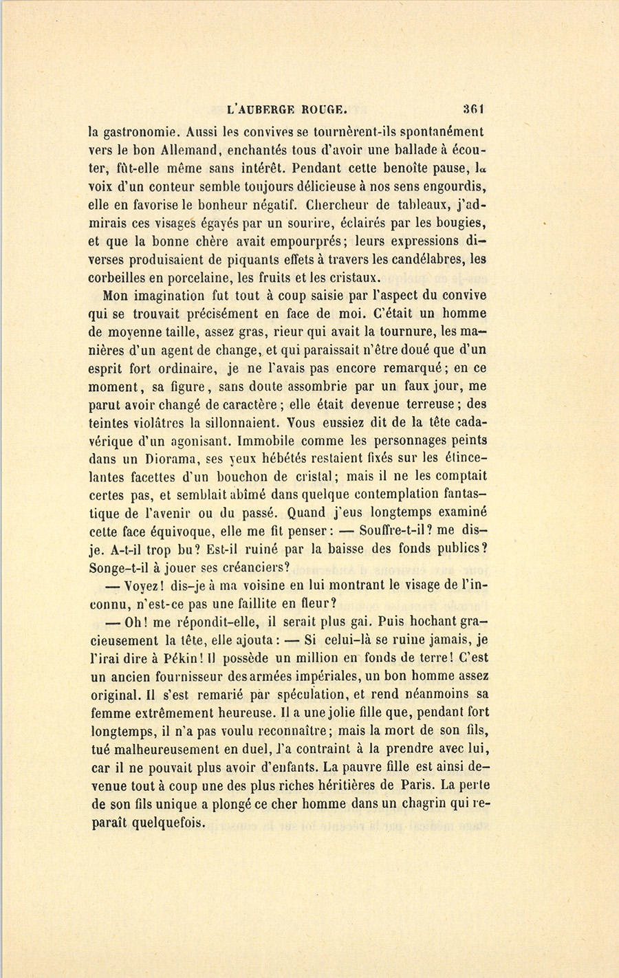 Mon imagination fut tout à coup saisie par l’aspect du convive qui se trouvait précisément en face de moi. C’était un homme de moyenne taille, assez gras, rieur qui avait la tournure, les manières d’un agent de change, et qui paraissait n’être doué que d’un esprit fort ordinaire, je ne l’avais pas encore remarqué ; en ce moment, sa figure, sans doute assombrie par un faux jour, me parut avoir changé de caractère ; elle était devenue terreuse ; des teintes violâtres la sillonnaient. Vous eussiez dit de la tête cadavérique d’un agonisant. Immobile comme les personnages peints dans un Diorama, ses yeux hébétés restaient fixés sur les étincelantes facettes d’un bouchon de cristal ; mais il ne les comptait certes pas, et semblait abîmé dans quelque contemplation fantastique de l’avenir ou du passé. Quand j’eus longtemps examiné cette face équivoque, elle me fit penser : – Souffre-t-il ? me dis-je. A-t-il trop bu ? Est-il ruiné par la baisse des fonds publics ? Songe-t-il à jouer ses créanciers ?