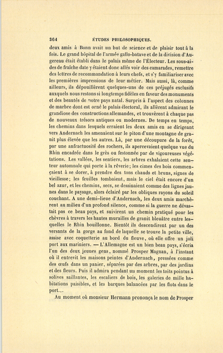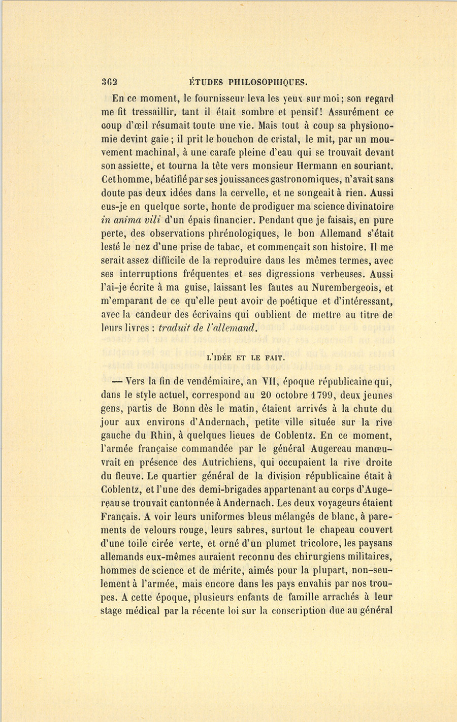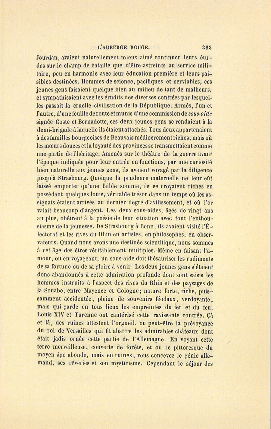 – Vers la fin de vendémiaire, an VII, époque républicaine qui, dans le style actuel, correspond au 20 octobre 1799, deux jeunes gens, partis de Bonn dès le matin, étaient arrivés à la chute du jour aux environs d’Andernach, petite ville située sur la rive gauche du Rhin, à quelques lieues de Coblentz. En ce moment, l’armée française commandée par le général Augereau manœuvrait en présence des Autrichiens, qui occupaient la rive droite du fleuve. Le quartier général de la division républicaine était à Coblentz, et l’une des demi-brigades appartenant au corps d’Augereau se trouvait cantonnée à Andernach. Les deux voyageurs étaient Français. À voir leurs uniformes bleus mélangés de blanc, à parements de velours rouge, leurs sabres, surtout le chapeau couvert d’une toile cirée verte, et orné d’un plumet tricolore, les paysans allemands eux-mêmes auraient reconnu des chirurgiens militaires, hommes de science et de mérite, aimés pour la plupart, non-seulement à l’armée, mais encore dans les pays envahis par nos troupes. À cette époque, plusieurs enfants de famille arrachés à leur stage médical par la récente loi sur la conscription due au général {p. 363} Jourdan, avaient naturellement mieux aimé continuer leurs études sur le champ de bataille que d’être astreints au service militaire, peu en harmonie avec leur éducation première et leurs paisibles destinées. Hommes de science, pacifiques et serviables, ces jeunes gens faisaient quelque bien au milieu de tant de malheurs, et sympathisaient avec les érudits des diverses contrées par lesquelles passait la cruelle civilisation de la République. Armés, l’un et l’autre, d’une feuille de route et munis d’une commission de sous-aide signée Coste et Bernadotte, ces deux jeunes gens se rendaient à la demi-brigade à laquelle ils étaient attachés. Tous deux appartenaient à des familles bourgeoises de Beauvais médiocrement riches, mais où les mœurs douces et la loyauté des provinces se transmettaient comme une partie de l’héritage. Amenés sur le théâtre de la guerre avant l’époque indiquée pour leur entrée en fonctions, par une curiosité bien naturelle aux jeunes gens, ils avaient voyagé par la diligence jusqu’à Strasbourg. Quoique la prudence maternelle ne leur eût laissé emporter qu’une faible somme, ils se croyaient riches en possédant quelques louis, véritable trésor dans un temps où les assignats étaient arrivés au dernier degré d’avilissement, et où l’or valait beaucoup d’argent. Les deux sous-aides, âgés de vingt ans au plus, obéirent à la poésie de leur situation avec tout l’enthousiasme de la jeunesse. De Strasbourg à Bonn, ils avaient visité l’Électorat et les rives du Rhin en artistes, en philosophes, en observateurs. Quand nous avons une destinée scientifique, nous sommes à cet âge des êtres véritablement multiples. Même en faisant l’amour, ou en voyageant, un sous-aide doit thésauriser les rudiments de sa fortune ou de sa gloire à venir. Les deux jeunes gens s’étaient donc abandonnés à cette admiration profonde dont sont saisis les hommes instruits à l’aspect des rives du Rhin et des paysages de la Souabe, entre Mayence et Cologne ; nature forte, riche, puissamment accidentée, pleine de souvenirs féodaux, verdoyante, mais qui garde en tous lieux les empreintes du fer et du feu. Louis XIV et Turenne ont cautérisé cette ravissante contrée. Çà et là, des ruines attestent l’orgueil, ou peut-être la prévoyance du roi de Versailles qui fit abattre les admirables châteaux dont était jadis ornée cette partie de l’Allemagne. En voyant cette terre merveilleuse, couverte de forêts, et où le pittoresque du moyen âge abonde, mais en ruines, vous concevez le génie allemand, ses rêveries et son mysticisme. Cependant le séjour des {p. 364} deux amis à Bonn avait un but de science et de plaisir tout à la fois. Le grand hôpital de l’armée gallo-batave et de la division d’Augereau était établi dans le palais même de l’Électeur. Les sous-aides de fraîche date y étaient donc allés voir des camarades, remettre des lettres de recommandation à leurs chefs, et s’y familiariser avec les premières impressions de leur métier. Mais aussi, là, comme ailleurs, ils dépouillèrent quelques-uns de ces préjugés exclusifs auxquels nous restons si longtemps fidèles en faveur des monuments et des beautés de notre pays natal. Surpris à l’aspect des colonnes de marbre dont est orné le palais électoral, ils allèrent admirant le grandiose des constructions allemandes, et trouvèrent à chaque pas de nouveaux trésors antiques ou modernes. De temps en temps, les chemins dans lesquels erraient les deux amis en se dirigeant vers Andernach les amenaient sur le piton d’une montagne de granit plus élevée que les autres. Là, par une découpure de la forêt, par une anfractuosité des rochers, ils apercevaient quelque vue du Rhin encadrée dans le grès ou festonnée par de vigoureuses végétations. Les vallées, les sentiers, les arbres exhalaient cette senteur automnale qui porte à la rêverie ; les cimes des bois commençaient à se dorer, à prendre des tons chauds et bruns, signes de vieillesse ; les feuilles tombaient, mais le ciel était encore d’un bel azur, et les chemins, secs, se dessinaient comme des lignes jaunes dans le paysage, alors éclairé par les obliques rayons du soleil couchant. À une demi-lieue d’Andernach, les deux amis marchèrent au milieu d’un profond silence, comme si la guerre ne dévastait pas ce beau pays, et suivirent un chemin pratiqué pour les chèvres à travers les hautes murailles de granit bleuâtre entre lesquelles le Rhin bouillonne. Bientôt ils descendirent par un des versants de la gorge au fond de laquelle se trouve la petite ville, assise avec coquetterie au bord du fleuve, où elle offre un joli port aux mariniers. – L’