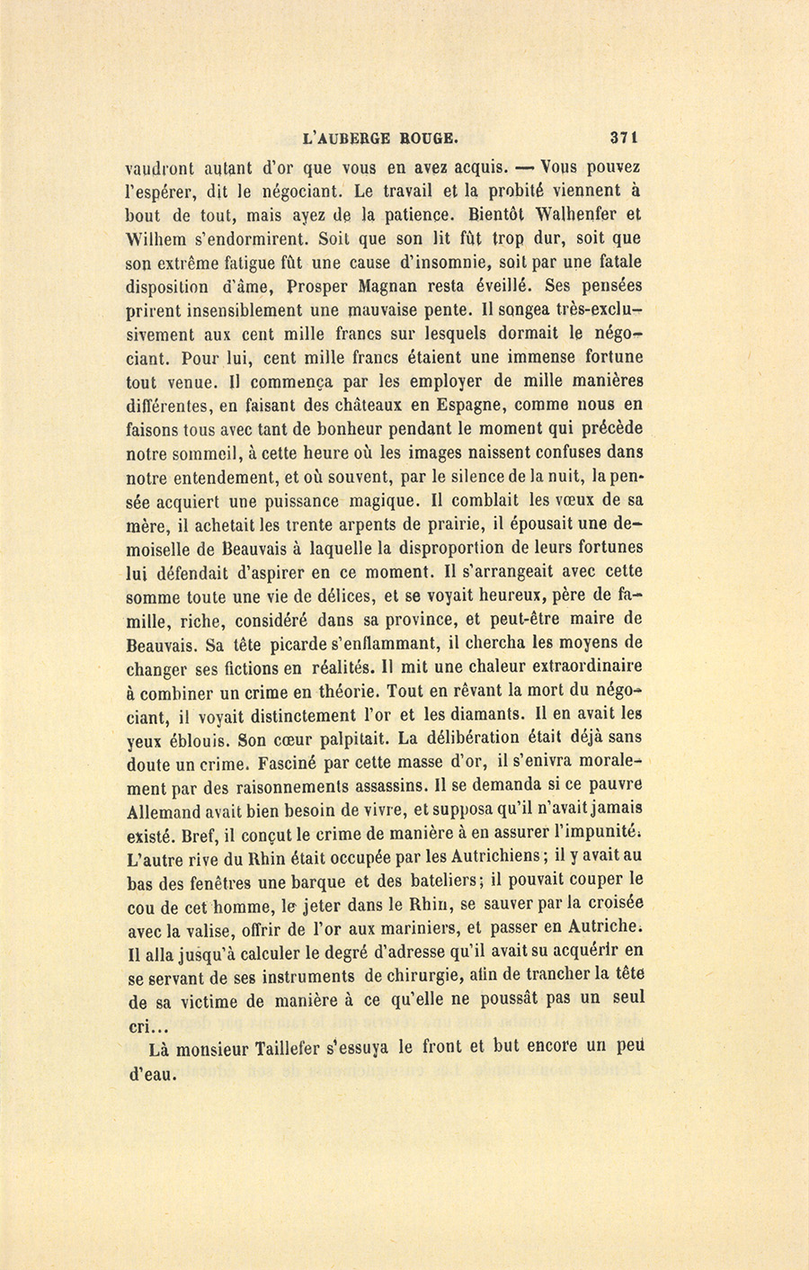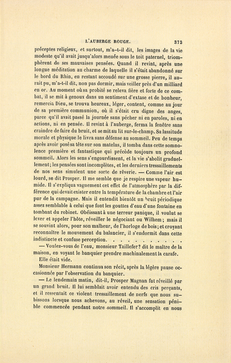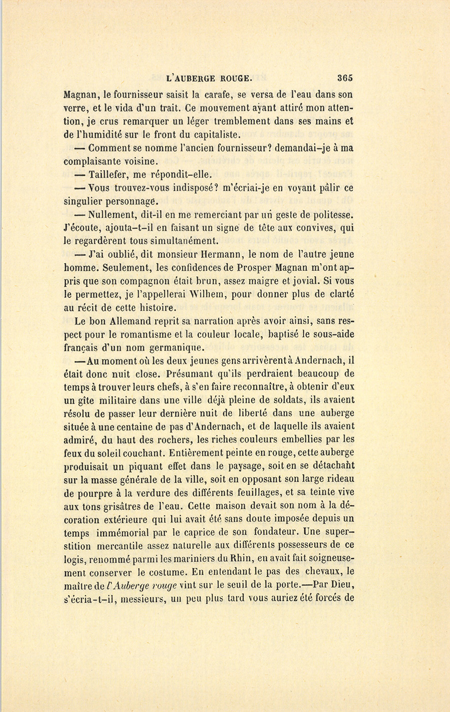 Au moment où monsieur Hermann prononça le nom de Prosper {p. 365} Magnan, le fournisseur saisit la carafe, se versa de l’eau dans son verre, et le vida d’un trait. Ce mouvement ayant attiré mon attention, je crus remarquer un léger tremblement dans ses mains et de l’humidité sur le front du capitaliste.