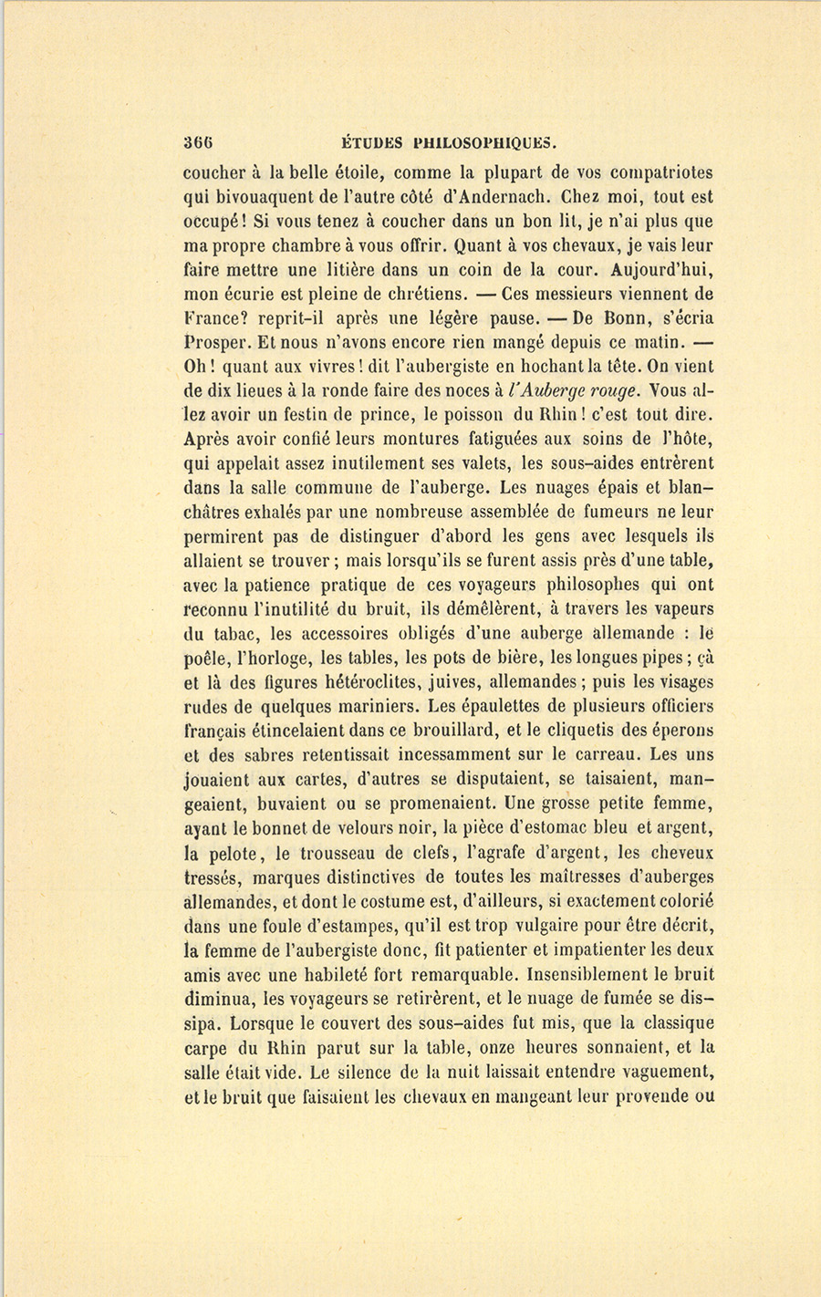 – Au moment où les deux jeunes gens arrivèrent à Andernach, il était donc nuit close. Présumant qu’ils perdraient beaucoup de temps à trouver leurs chefs, à s’en faire reconnaître, à obtenir d’eux un gîte militaire dans une ville déjà pleine de soldats, ils avaient résolu de passer leur dernière nuit de liberté dans une auberge située à une centaine de pas d’Andernach, et de laquelle ils avaient admiré, du haut des rochers, les riches couleurs embellies par les feux du soleil couchant. Entièrement peinte en rouge, cette auberge produisait un piquant effet dans le paysage, soit en se détachant sur la masse générale de la ville, soit en opposant son large rideau de pourpre à la verdure des différents feuillages, et sa teinte vive aux tons grisâtres de l’eau. Cette maison devait son nom à la décoration extérieure qui lui avait été sans doute imposée depuis un temps immémorial par le caprice de son fondateur. Une superstition mercantile assez naturelle aux différents possesseurs de ce logis, renommé parmi les mariniers du Rhin, en avait fait soigneusement conserver le costume. En entendant le pas des chevaux, le maître de l’Auberge rouge vint sur le seuil de la porte. – Par Dieu, s’écria-t-il, messieurs, un peu plus tard vous auriez été forcés de {p. 366} coucher à la belle étoile, comme la plupart de vos compatriotes qui bivouaquent de l’autre côté d’Andernach. Chez moi, tout est occupé ! Si vous tenez à coucher dans un bon lit, je n’ai plus que ma propre chambre à vous offrir. Quant à vos chevaux, je vais leur faire mettre une litière dans un coin de la cour. Aujourd’hui, mon écurie est pleine de chrétiens. – Ces messieurs viennent de France ? reprit-il après une légère pause. – De Bonn, s’écria Prosper. Et nous n’avons encore rien mangé depuis ce matin. – Oh ! quant aux vivres ! dit l’aubergiste en hochant la tête. On vient de dix lieues à la ronde faire des noces à l’Auberge rouge. Vous allez avoir un festin de prince, le poisson du Rhin ! c’est tout dire. Après avoir confié leurs montures fatiguées aux soins de l’hôte, qui appelait assez inutilement ses valets, les sous-aides entrèrent dans la salle commune de l’auberge. Les nuages épais et blanchâtres exhalés par une nombreuse assemblée de fumeurs ne leur permirent pas de distinguer d’abord les gens avec lesquels ils allaient se trouver ; mais lorsqu’ils se furent assis près d’une table, avec la patience pratique de ces voyageurs philosophes qui ont reconnu l’inutilité du bruit, ils démêlèrent, à travers les vapeurs du tabac, les accessoires obligés d’une auberge allemande : le poêle, l’horloge, les tables, les pots de bière, les longues pipes ; çà et là des figures hétéroclites, juives, allemandes ; puis les visages rudes de quelques mariniers. Les épaulettes de plusieurs officiers français étincelaient dans ce brouillard, et le cliquetis des éperons et des sabres retentissait incessamment sur le carreau. Les uns jouaient aux cartes, d’autres se disputaient, se taisaient, mangeaient, buvaient ou se promenaient. Une grosse petite femme, ayant le bonnet de velours noir, la pièce d’estomac bleu et argent, la pelote, le trousseau de clefs, l’agrafe d’argent, les cheveux tressés, marques distinctives de toutes les maîtresses d’auberges allemandes, et dont le costume est, d’ailleurs, si exactement colorié dans une foule d’estampes, qu’il est trop vulgaire pour être décrit, la femme de l’aubergiste donc, fit patienter et impatienter les deux amis avec une habileté fort remarquable. Insensiblement le bruit diminua, les voyageurs se retirèrent, et le nuage de fumée se dissipa. Lorsque le couvert des sous-aides fut mis, que la classique carpe du Rhin parut sur la table, onze heures sonnaient, et la salle était vide. Le silence de la nuit laissait entendre vaguement, et le bruit que faisaient les chevaux en mangeant leur provende ou {p. 367} en piaffant, et le murmure des eaux du Rhin, et ces espèces de rumeurs indéfinissables qui animent une auberge pleine quand chacun s’y couche. Les portes et les fenêtres s’ouvraient et se fermaient, des voix murmuraient de vagues paroles, et quelques interpellations retentissaient dans les chambres. En ce moment de silence et de tumulte, les deux Français, et l’hôte occupé à leur vanter Andernach, le repas, son vin du Rhin, l’armée républicaine et sa femme, écoutèrent avec une sorte d’intérêt les cris rauques de quelques mariniers et les bruissements d’un bateau qui abordait au port. L’aubergiste, familiarisé sans doute avec les interrogations gutturales de ces bateliers, sortit précipitamment, et revint bientôt. Il ramena un gros petit homme derrière lequel marchaient deux mariniers portant une lourde valise et quelques ballots. Ses paquets déposés dans la salle, le petit homme prit lui-même sa valise et la garda près de lui, en s’asseyant sans cérémonie à table devant les deux sous-aides. – Allez coucher à votre bateau, dit-il aux mariniers, puisque l’auberge est pleine. Tout bien considéré, cela vaudra mieux. – Monsieur, dit l’hôte au nouvel arrivé, voilà tout ce qui me reste de provisions. Et il montrait le souper servi aux deux Français. – Je n’ai pas une croûte de pain, pas un os. – Et de la choucroute ? – Pas de quoi mettre dans le dé de ma femme ! Comme j’ai eu l’honneur de vous le dire, vous ne pouvez avoir d’autre lit que la chaise sur laquelle vous êtes, et d’autre chambre que cette salle. À ces mots, le petit homme jeta sur l’hôte, sur la salle et sur les deux Français, un regard où la prudence et l’effroi se peignirent également.