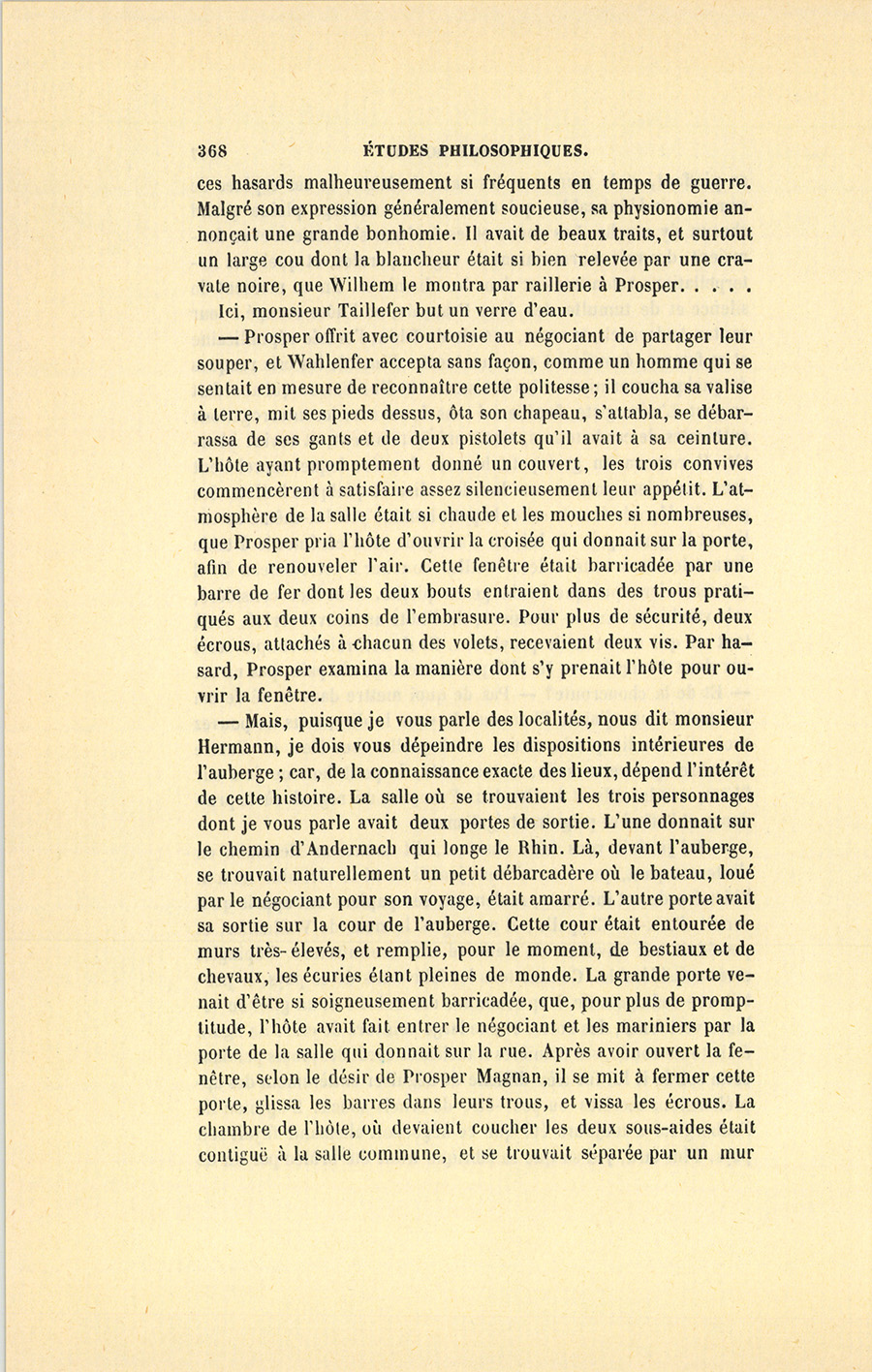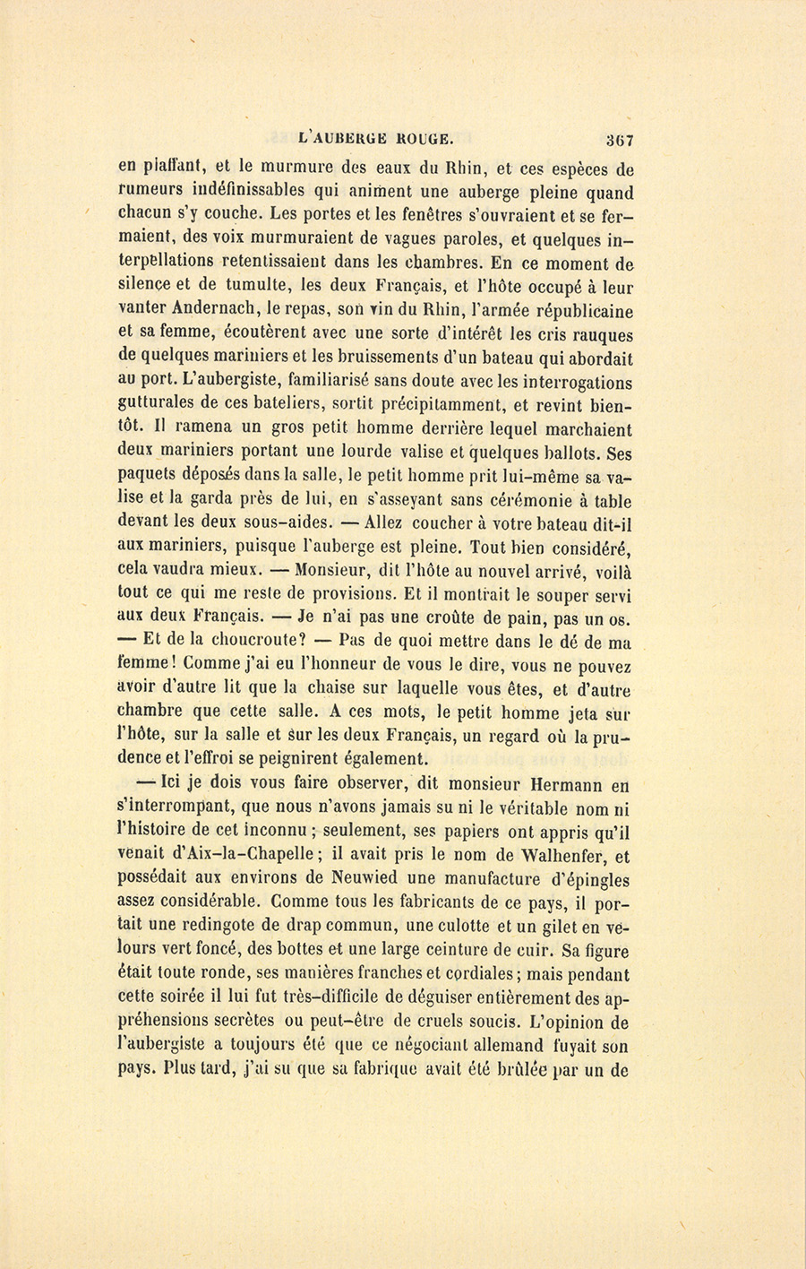 – Ici je dois vous faire observer, dit monsieur Hermann en s’interrompant, que nous n’avons jamais su ni le véritable nom ni l’histoire de cet inconnu ; seulement, ses papiers ont appris qu’il venait d’Aix-la-Chapelle ; il avait pris le nom de Walhenfer, et possédait aux environs de Neuwied une manufacture d’épingles assez considérable. Comme tous les fabricants de ce pays, il portait une redingote de drap commun, une culotte et un gilet en velours vert foncé, des bottes et une large ceinture de cuir. Sa figure était toute ronde, ses manières franches et cordiales ; mais pendant cette soirée il lui fut très-difficile de déguiser entièrement des appréhensions secrètes ou peut-être de cruels soucis. L’opinion de l’aubergiste a toujours été que ce négociant allemand fuyait son pays. Plus tard, j’ai su que sa fabrique avait été brûlée par un de {p. 368} ces hasards malheureusement si fréquents en temps de guerre. Malgré son expression généralement soucieuse, sa physionomie annonçait une grande bonhomie. Il avait de beaux traits, et surtout un large cou dont la blancheur était si bien relevée par une cravate noire, que Wilhem le montra par raillerie à Prosper…