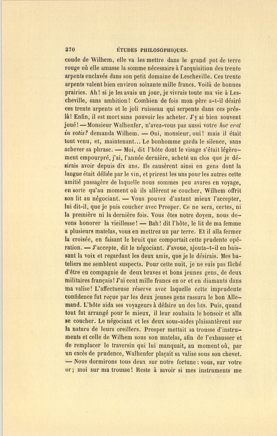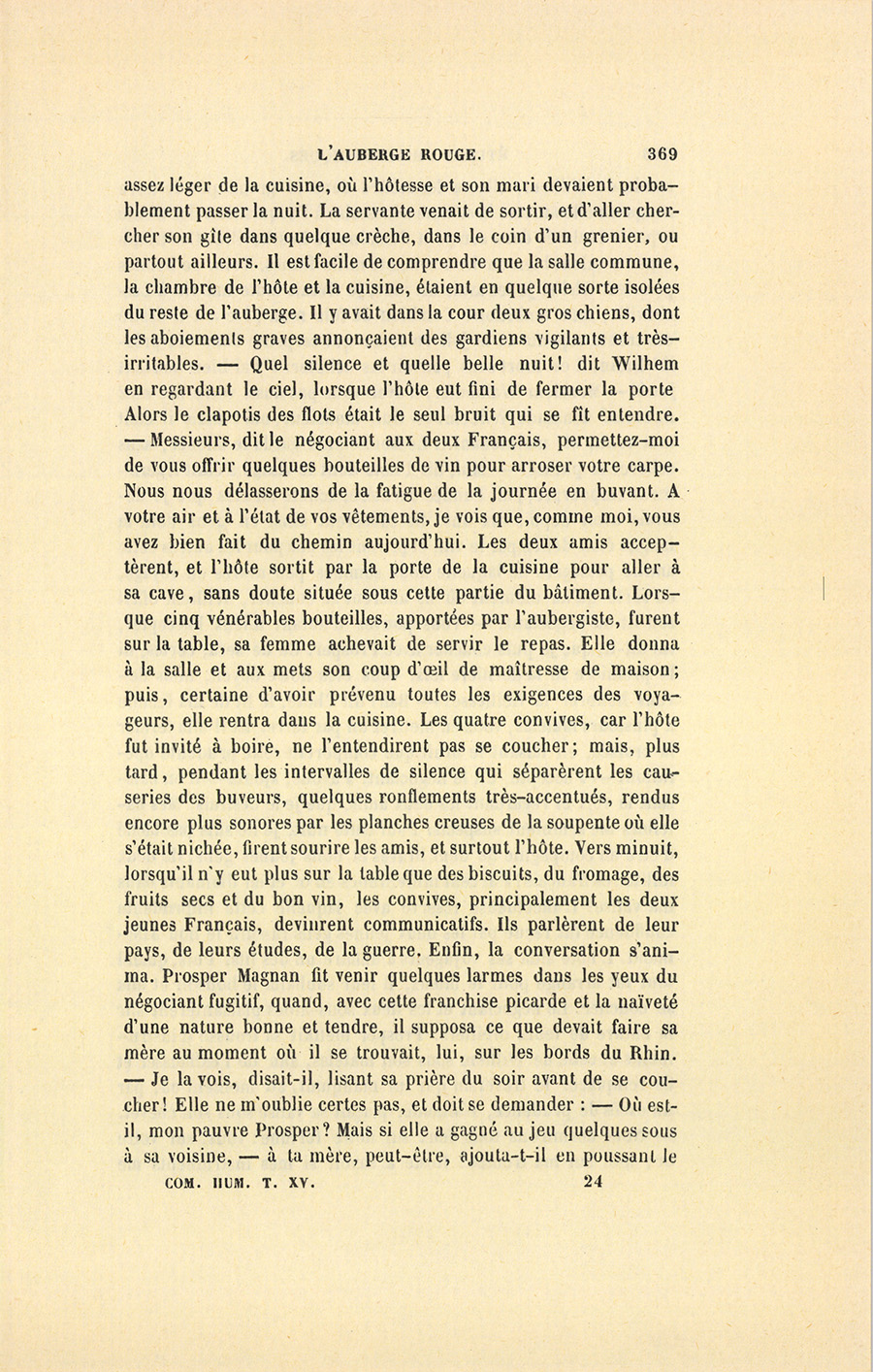 – Mais, puisque je vous parle des localités, nous dit monsieur Hermann, je dois vous dépeindre les dispositions intérieures de l’auberge ; car, de la connaissance exacte des lieux, dépend l’intérêt de cette histoire. La salle où se trouvaient les trois personnages dont je vous parle avait deux portes de sortie. L’une donnait sur le chemin d’Andernach qui longe le Rhin. Là, devant l’auberge, se trouvait naturellement un petit débarcadère où le bateau, loué par le négociant pour son voyage, était amarré. L’autre porte avait sa sortie sur la cour de l’auberge. Cette cour était entourée de murs très-élevés, et remplie, pour le moment, de bestiaux et de chevaux, les écuries étant pleines de monde. La grande porte venait d’être si soigneusement barricadée, que, pour plus de promptitude, l’hôte avait fait entrer le négociant et les mariniers par la porte de la salle qui donnait sur la rue. Après avoir ouvert la fenêtre, selon le désir de Prosper Magnan, il se mit à fermer cette porte, glissa les barres dans leurs trous, et vissa les écrous. La chambre de l’hôte, où devaient coucher les deux sous-aides était contiguë à la salle commune, et se trouvait séparée par un mur {p. 369} assez léger de la cuisine, où l’hôtesse et son mari devaient probablement passer la nuit. La servante venait de sortir, et d’aller chercher son gîte dans quelque crèche, dans le coin d’un grenier, ou partout ailleurs. Il est facile de comprendre que la salle commune, la chambre de l’hôte et la cuisine, étaient en quelque sorte isolées du reste de l’auberge. Il y avait dans la cour deux gros chiens, dont les aboiements graves annonçaient des gardiens vigilants et très irritables. – Quel silence et quelle belle nuit ! dit Wilhem en regardant le ciel, lorsque l’hôte eut fini de fermer la porte. Alors le clapotis des flots était le seul bruit qui se fit entendre. – Messieurs, dit le négociant aux deux Français, permettez-moi de vous offrir quelques bouteilles de vin pour arroser votre carpe. Nous nous délasserons de la fatigue de la journée en buvant. À votre air et à l’état de vos vêtements, je vois que, comme moi, vous avez fait bien2 du chemin aujourd’hui. Les deux amis acceptèrent, et l’hôte sortit par la porte de la cuisine pour aller à sa cave, sans doute située sous cette partie du bâtiment. Lorsque cinq vénérables bouteilles, apportées par l’aubergiste, furent sur la table, sa femme achevait de servir le repas. Elle donna à la salle et aux mets son coup d’œil de maîtresse de maison ; puis, certaine d’avoir prévenu toutes les exigences des voyageurs, elle rentra dans la cuisine. Les quatre convives, car l’hôte fut invité à boire, ne l’entendirent pas se coucher ; mais, plus tard, pendant les intervalles de silence qui séparèrent les causeries des buveurs, quelques ronflements très-accentués, rendus encore plus sonores par les planches creuses de la soupente où elle s’était nichée, firent sourire les amis, et surtout l’hôte. Vers minuit, lorsqu’il n’y eut plus sur la table que des biscuits, du fromage, des fruits secs et du bon vin, les convives, principalement les deux jeunes Français, devinrent communicatifs. Ils parlèrent de leur pays, de leurs études, de la guerre. Enfin, la conversation s’anima. Prosper Magnan fit venir quelques larmes dans les yeux du négociant fugitif, quand, avec cette franchise picarde et la naïveté d’une nature bonne et tendre, il supposa ce que devait faire sa mère au moment où il se trouvait, lui, sur les bords du Rhin. – Je la vois, disait-il, lisant sa prière du soir avant de se coucher ! Elle ne m’oublie certes pas, et doit se demander : – Où est-il, mon pauvre Prosper ? Mais si elle a gagné au jeu quelques sous à sa voisine, – à ta mère, peut-être, ajouta-t-il en poussant le {p. 370} coude de Wilhem, elle va les mettre dans le grand pot de terre rouge où elle amasse la somme nécessaire à l’acquisition des trente arpents enclavés dans son petit domaine de Lescheville. Ces trente arpents valent bien environ soixante mille francs. Voilà de bonnes prairies. Ah ! si je les avais un jour, je vivrais toute ma vie à Lescheville, sans ambition ! Combien de fois mon père a-t-il désiré ces trente arpents et le joli ruisseau qui serpente dans ces prés-là ! Enfin, il est mort sans pouvoir les acheter. J’y ai bien souvent joué ! – Monsieur Walhenfer, n’avez-vous pas aussi votre hoc erat in votis ? demanda Wilhem. – Oui, monsieur, oui ! mais il était tout venu, et, maintenant… Le bonhomme garda le silence, sans achever sa phrase. – Moi, dit l’hôte dont le visage s’était légèrement empourpré, j’ai, l’année dernière, acheté un clos que je désirais avoir depuis dix ans. Ils causèrent ainsi en gens dont la langue était déliée par le vin, et prirent les uns pour les autres cette amitié passagère de laquelle nous sommes peu avares en voyage, en sorte qu’au moment où ils allèrent se coucher, Wilhem offrit son lit au négociant. – Vous pouvez d’autant mieux l’accepter, lui dit-il, que je puis coucher avec Prosper. Ce ne sera, certes, ni la première ni la dernière fois. Vous êtes notre doyen, nous devons honorer la vieillesse ! – Bah ! dit l’hôte, le lit de ma femme a plusieurs matelas, vous en mettrez un par terre. Et il alla fermer la croisée, en faisant le bruit que comportait cette prudente opération. – J’accepte, dit le négociant. J’avoue, ajouta-t-il en baissant la voix et regardant les deux amis, que je le désirais. Mes bateliers me semblent suspects. Pour cette nuit, je ne suis pas fâché d’être en compagnie de deux braves et bons jeunes gens, de deux militaires français ! J’ai cent mille francs en or et en diamants dans ma valise ! L’affectueuse réserve avec laquelle cette imprudente confidence fut reçue par les deux jeunes gens rassura le bon All