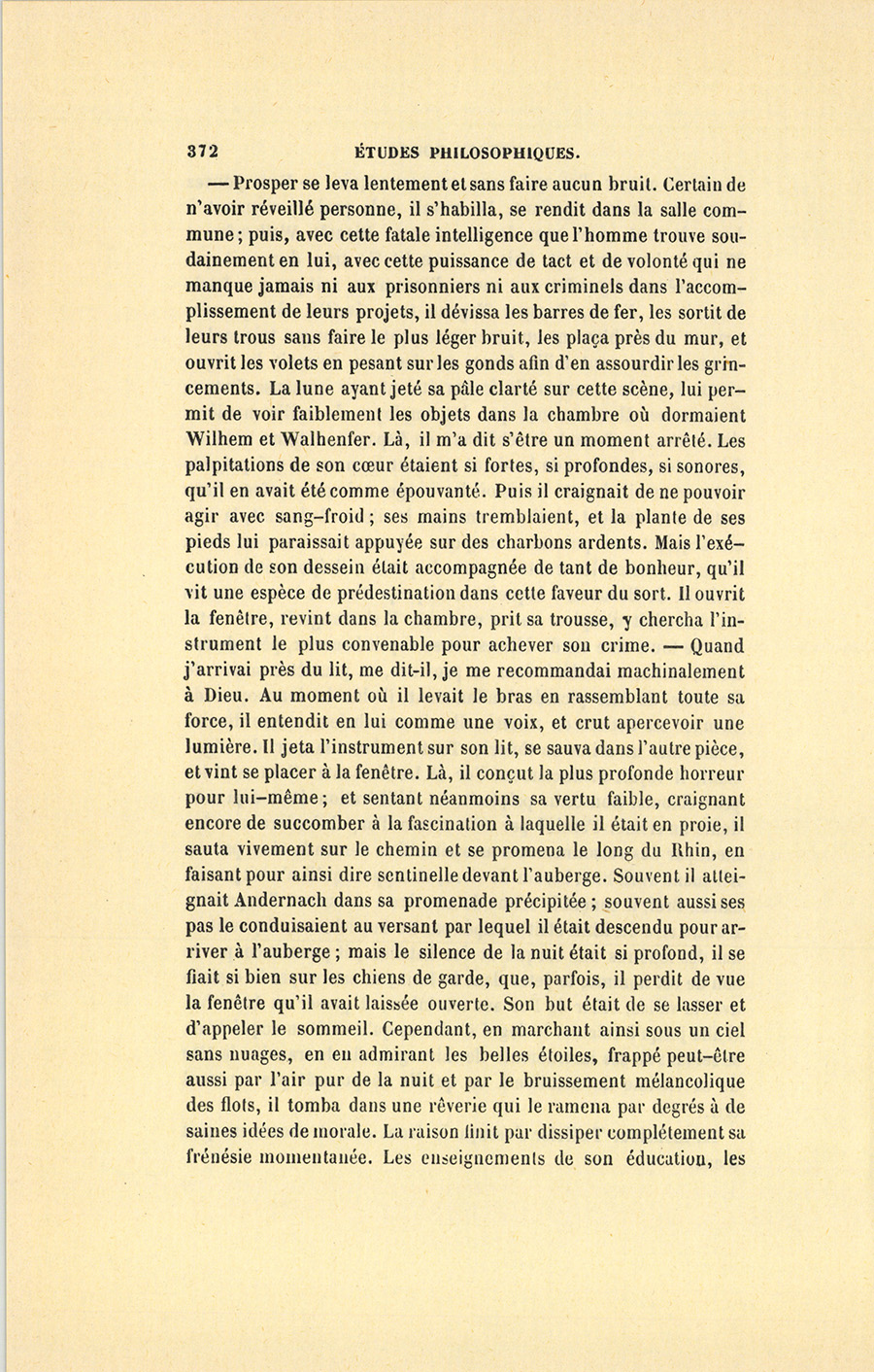 {p. 372} – Prosper se leva lentement et sans faire aucun bruit. Certain de n’avoir réveillé personne, il s’habilla, se rendit dans la salle commune ; puis, avec cette fatale intelligence que l’homme trouve soudainement en lui, avec cette puissance de tact et de volonté qui ne manque jamais ni aux prisonniers ni aux criminels dans l’accomplissement de leurs projets, il dévissa les barres de fer, les sortit de leurs trous sans faire le plus léger bruit, les plaça près du mur, et ouvrit les volets en pesant sur les gonds afin d’en assourdir les grincements. La lune ayant jeté sa pâle clarté sur cette scène, lui permit de voir faiblement les objets dans la chambre où dormaient Wilhem et Walhenfer. Là, il m’a dit s’être un moment arrêté. Les palpitations de son cœur étaient si fortes, si profondes, si sonores, qu’il en avait été comme épouvanté. Puis il craignait de ne pouvoir agir avec sang-froid ; ses mains tremblaient, et la plante de ses pieds lui paraissait appuyée sur des charbons ardents. Mais l’exécution de son dessein était accompagnée de tant de bonheur, qu’il vit une espèce de prédestination dans cette faveur du sort. Il ouvrit la fenêtre, revint dans la chambre, prit sa trousse, y chercha l’instrument le plus convenable pour achever son crime. – Quand j’arrivai près du lit, me dit-il, je me recommandai machinalement à Dieu. Au moment où il levait le bras en rassemblant toute sa force, il entendit en lui comme une voix, et crut apercevoir une lumière. Il jeta l’instrument sur son lit, se sauva dans l’autre pièce, et vint se placer à la fenêtre. Là, il conçut la plus profonde horreur pour lui-même ; et sentant néanmoins sa vertu faible, craignant encore de succomber à la fascination à laquelle il était en proie, il sauta vivement sur le chemin et se promena le long du Rhin, en faisant pour ainsi dire sentinelle devant l’auberge. Souvent il atteignait Andernach dans sa promenade précipitée ; souvent aussi ses pas le conduisaient au versant par lequel il était descendu pour arriver à l’auberge ; mais le silence de la nuit était si profond, il se fiait si bien sur les chiens de garde, que, parfois, il perdit de vue la fenêtre qu’il avait laissée ouverte. Son but était de se lasser et d’appeler le sommeil. Cependant, en marchant ainsi sous un ciel sans nuages, en en admirant les belles étoiles, frappé peut-être aussi par l’air pur de la nuit et par le bruissement mélancolique des flots, il tomba dans une rêverie qui le ramena par degrés à de saines idées de morale. La raison finit par dissiper complétement sa frénésie momentanée. Les enseignements de son éducation, les {p. 373} préceptes religieux, et surtout, m’a-t-il dit, les images de la vie modeste qu’il avait jusqu’alors menée sous le toit paternel, triomphèrent de ses mauvaises pensées. Quand il revint, après une longue méditation au charme de laquelle il s’était abandonné sur le bord du Rhin, en restant accoudé sur une grosse pierre, il aurait pu, m’a-t-il dit, non pas dormir, mais veiller près d’un milliard en or. Au moment où sa probité se releva fière et forte de ce combat, il se mit à genoux dans un sentiment d’extase et de bonheur, remercia Dieu, se trouva heureux, léger, content, comme au jour de sa première communion, où il s’était cru digne des anges, parce qu’il avait passé la journée sans pécher ni en paroles, ni en actions, ni en pensée. Il revint à l’auberge, ferma la fenêtre sans craindre de faire du bruit, et se mit au lit sur-le-champ. Sa lassitude morale et physique le livra sans défense au sommeil. Peu de temps après avoir posé sa tête sur son matelas, il tomba dans cette somnolence première et fantastique qui précède toujours un profond sommeil. Alors les sens s’engourdissent, et la vie s’abolit graduellement ; les pensées sont incomplètes, et les derniers tressaillements de nos sens simulent une sorte de rêverie. – Comme l’air est lourd, se dit Prosper. Il me semble que je respire une vapeur humide. Il s’expliqua vaguement cet effet de l’atmosphère par la différence qui devait exister entre la température de la chambre et l’air pur de la campagne. Mais il entendit bientôt un bruit périodique assez semblable à celui que font les gouttes d’eau d’une fontaine en tombant du robinet. Obéissant à une terreur panique, il voulut se lever et appeler l’hôte, réveiller le négociant ou Wilhem ; mais il se souvint alors, pour son malheur, de l’horloge de bois ; et croyant reconnaître le mouvement du balancier, il s’endormit dans cette indistincte et confuse perception…