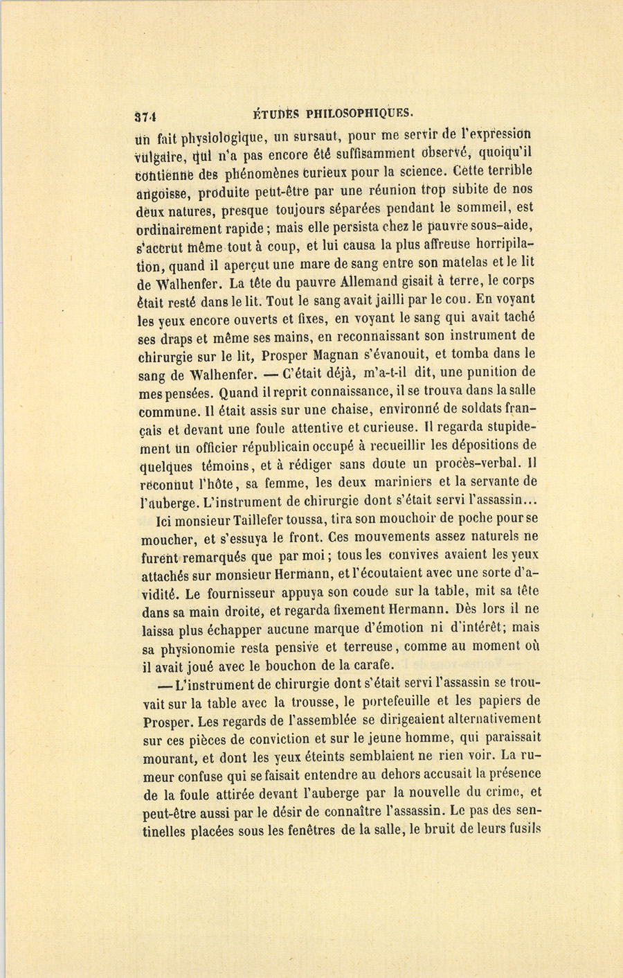 – Le lendemain matin, dit-il, Prosper Magnan fut réveillé par un grand bruit. Il lui semblait avoir entendu des cris perçants, et il ressentait ce violent tressaillement de nerfs que nous subissons lorsque nous achevons, au réveil, une sensation pénible commencée pendant notre sommeil. Il s’accomplit en nous {p. 374} un fait physiologique, un sursaut, pour me servir de l’expression vulgaire, qui n’a pas encore été suffisamment observé, quoiqu’il contienne des phénomènes curieux pour la science. Cette terrible angoisse, produite peut-être par une réunion trop subite de nos deux natures, presque toujours séparées pendant le sommeil, est ordinairement rapide ; mais elle persista chez le pauvre sous-aide, s’accrut même tout à coup, et lui causa la plus affreuse horripilation, quand il aperçut une mare de sang entre son matelas et le lit de Walhenfer. La tête du pauvre Allemand gisait à terre, le corps était resté dans le lit. Tout le sang avait jailli par le cou. En voyant les yeux encore ouverts et fixes, en voyant le sang qui avait taché ses draps et même ses mains, en reconnaissant son instrument de chirurgie sur le lit, Prosper Magnan s’évanouit, et tomba dans le sang de Walhenfer. – C’était déjà, m’a-t-il dit, une punition de mes pensées. Quand il reprit connaissance, il se trouva dans la salle commune. Il était assis sur une chaise, environné de soldats français et devant une foule attentive et curieuse. Il regarda stupidement un officier républicain occupé à recueillir les dépositions de quelques témoins, et à rédiger sans doute un procès-verbal. Il reconnut l’hôte, sa femme, les deux mariniers et la servante de l’auberge. L’instrument de chirurgie dont s’était servi l’assassin…
